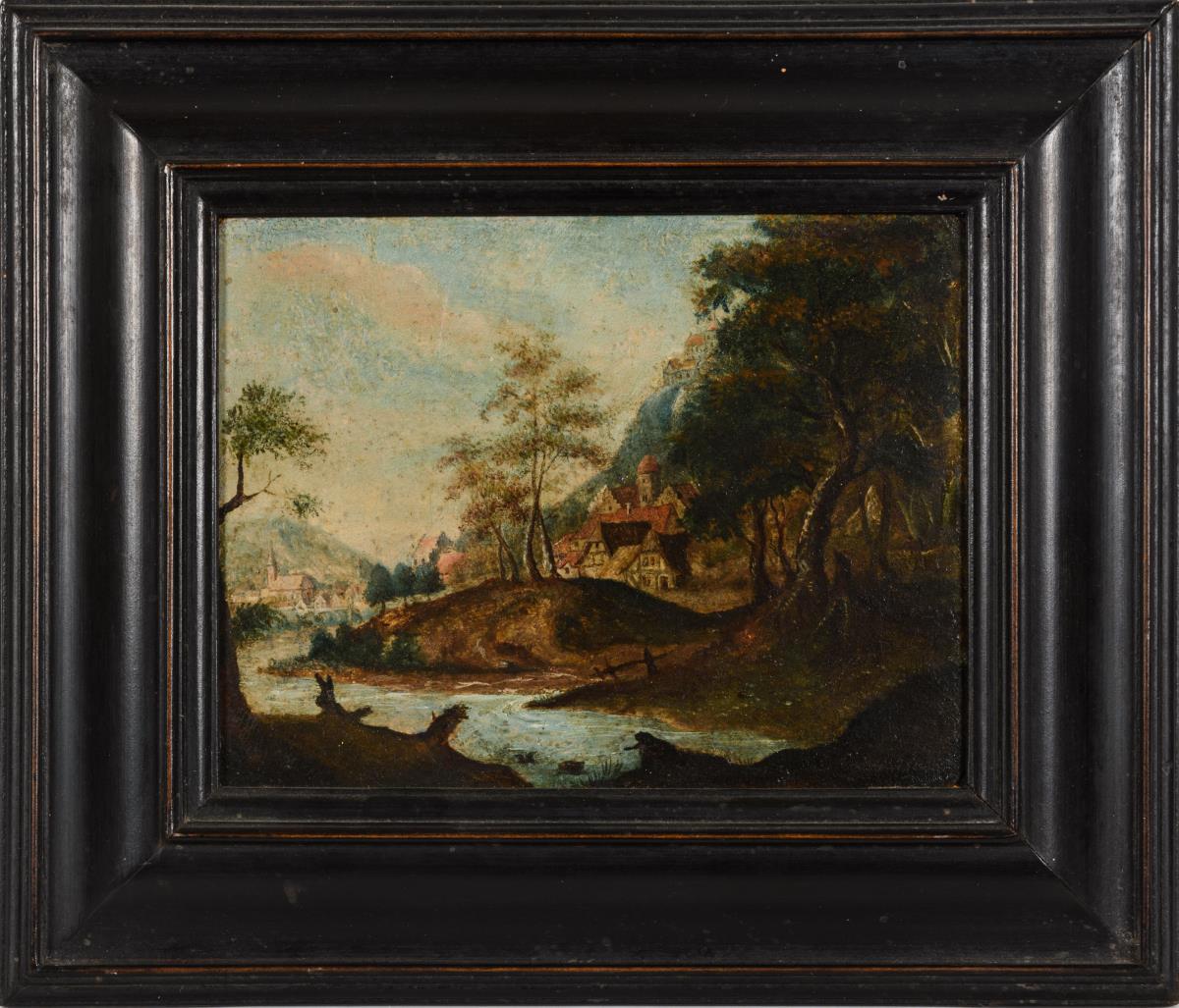Wanderer im Uferwald auf dem Weg zur Stadt am Fluss. Leicht retuschiert, wenige Altersspuren.