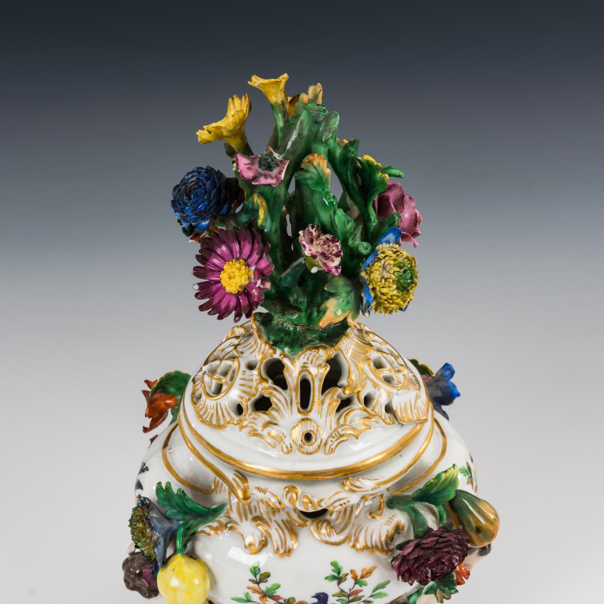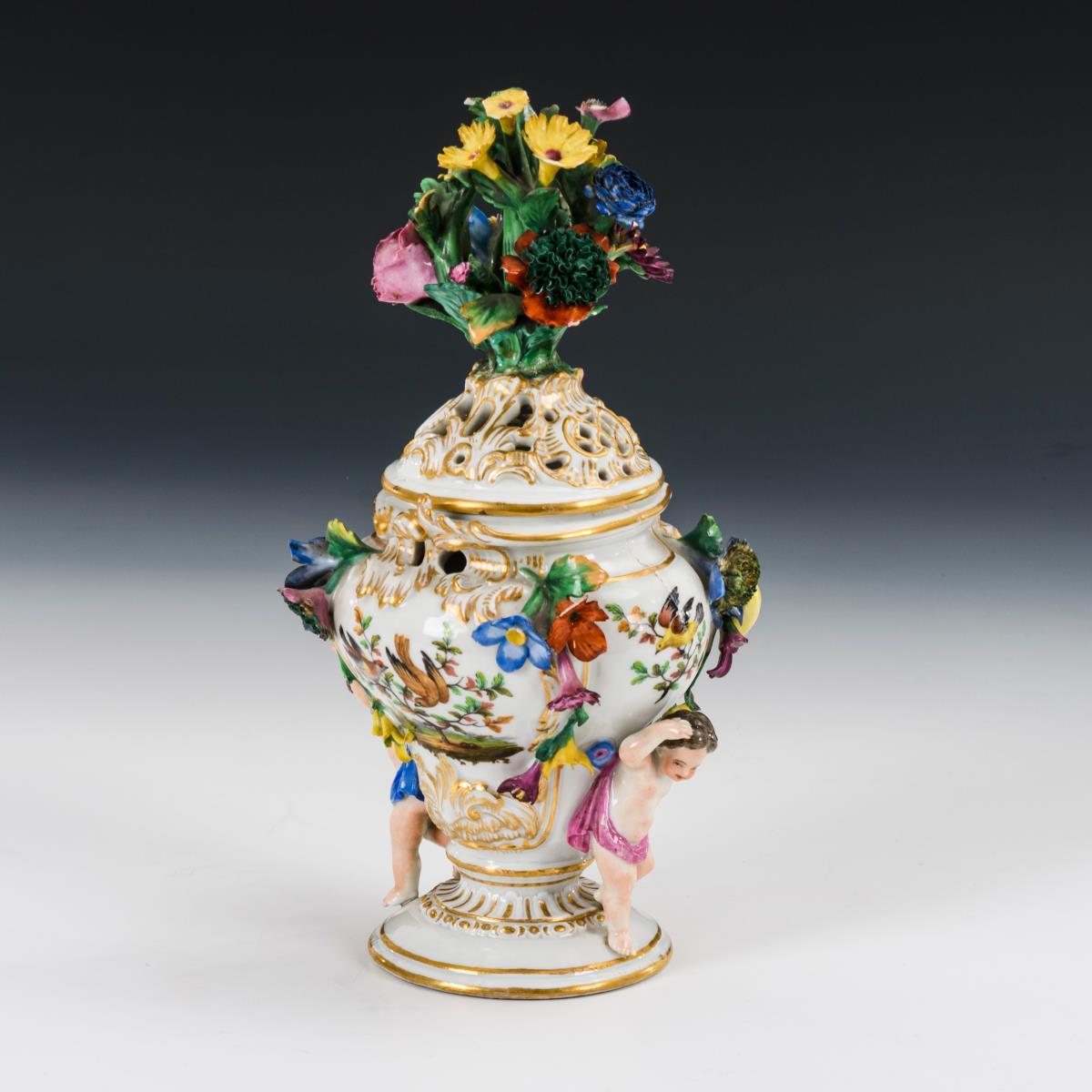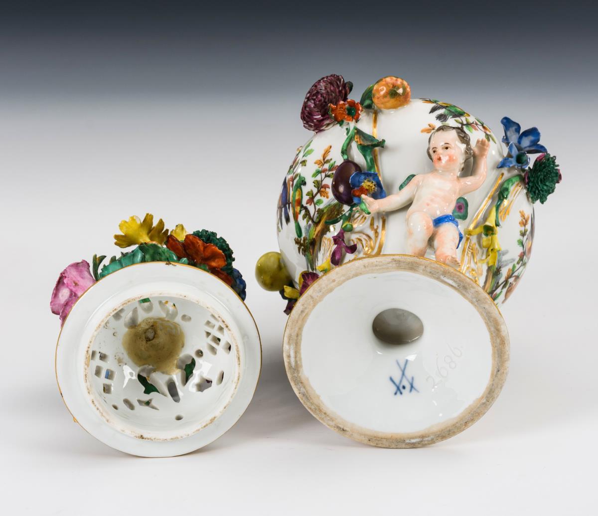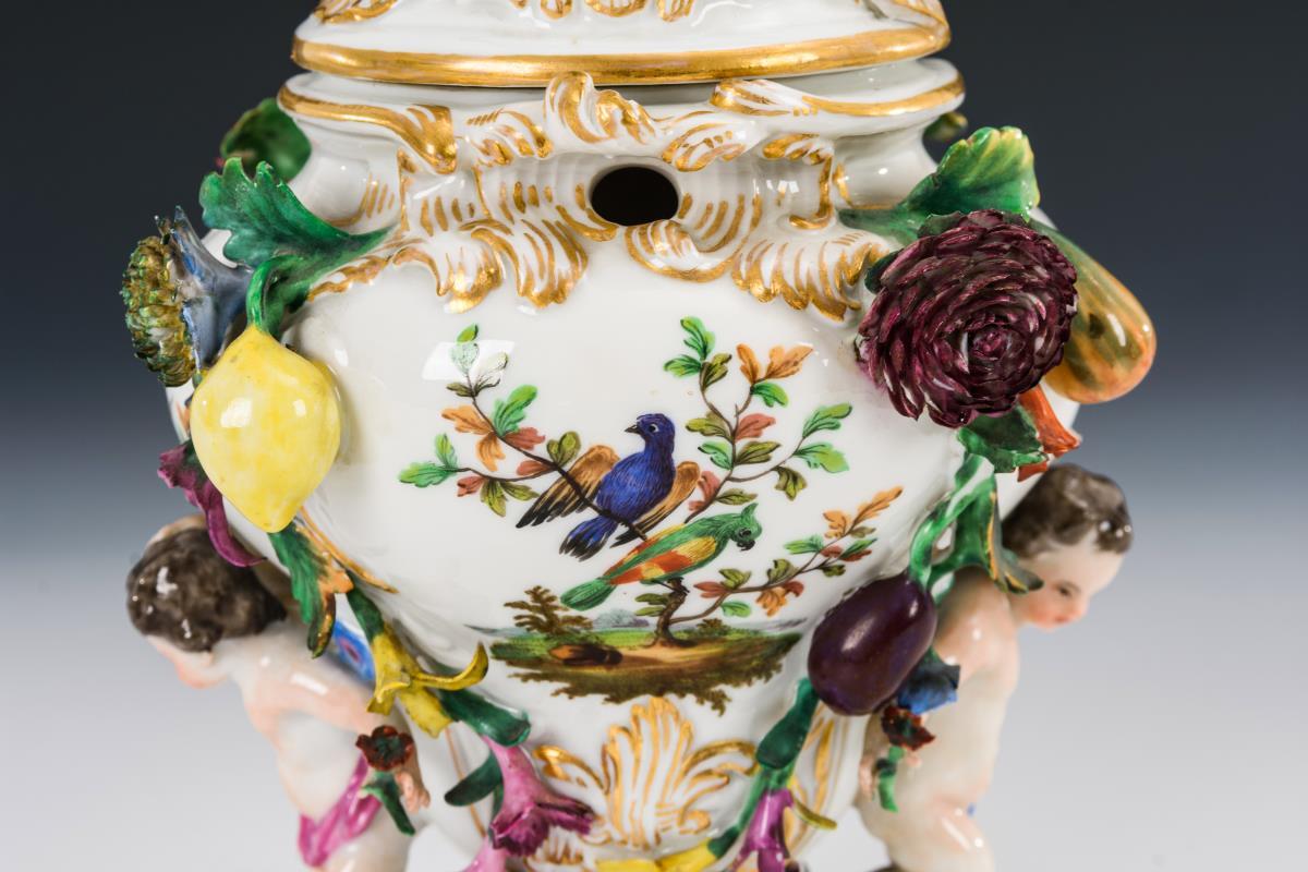 Gefußte Balustervase mit zwei Putten sowie Blüten- und Fruchtbelag, durchbrochener Deckel mit einem aufgesetzten Blumenbukett. Blüten defekt, Brandriss an den Korpusnähten, Blumenbukett auf dem Deckel geklebt.