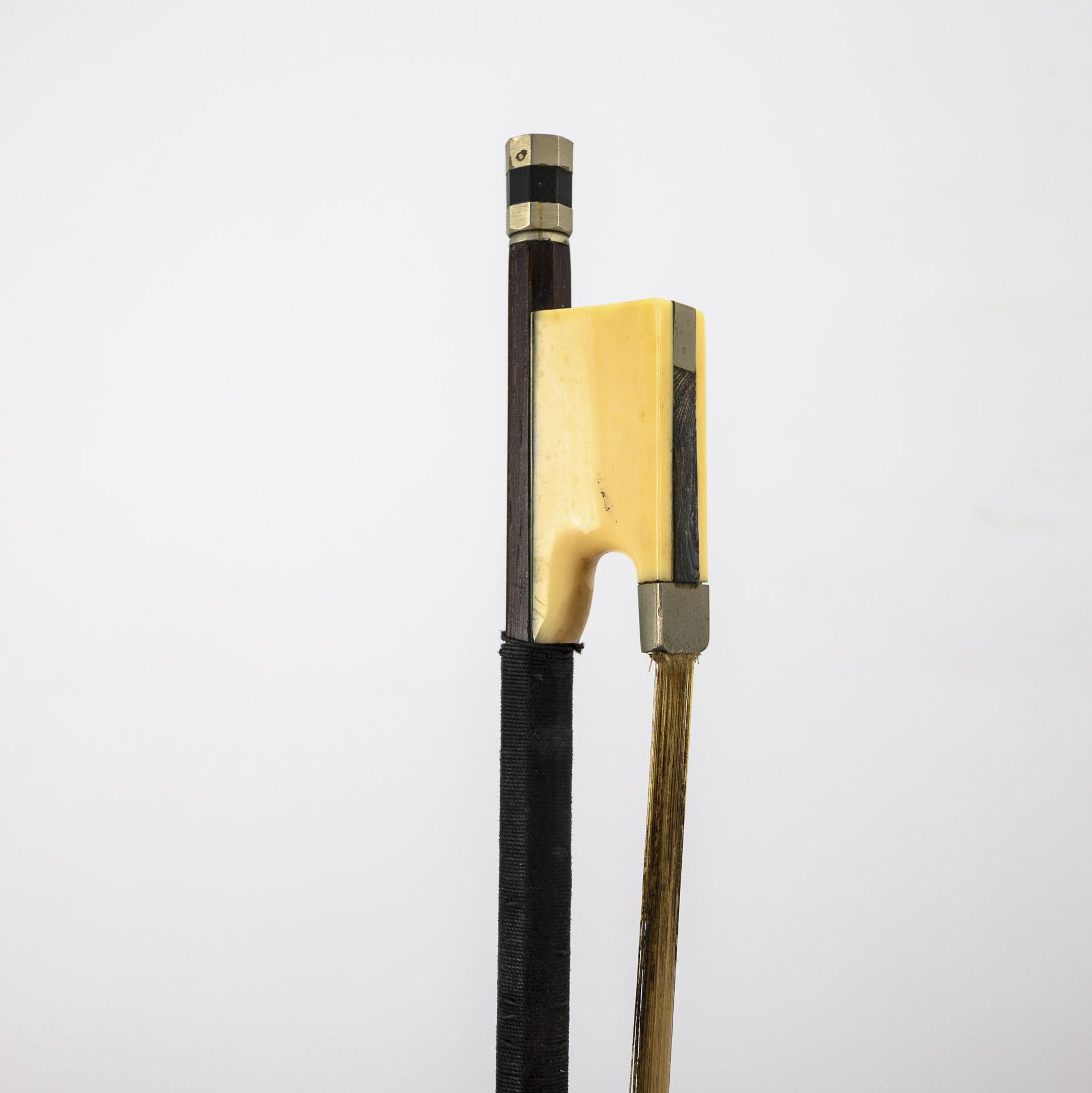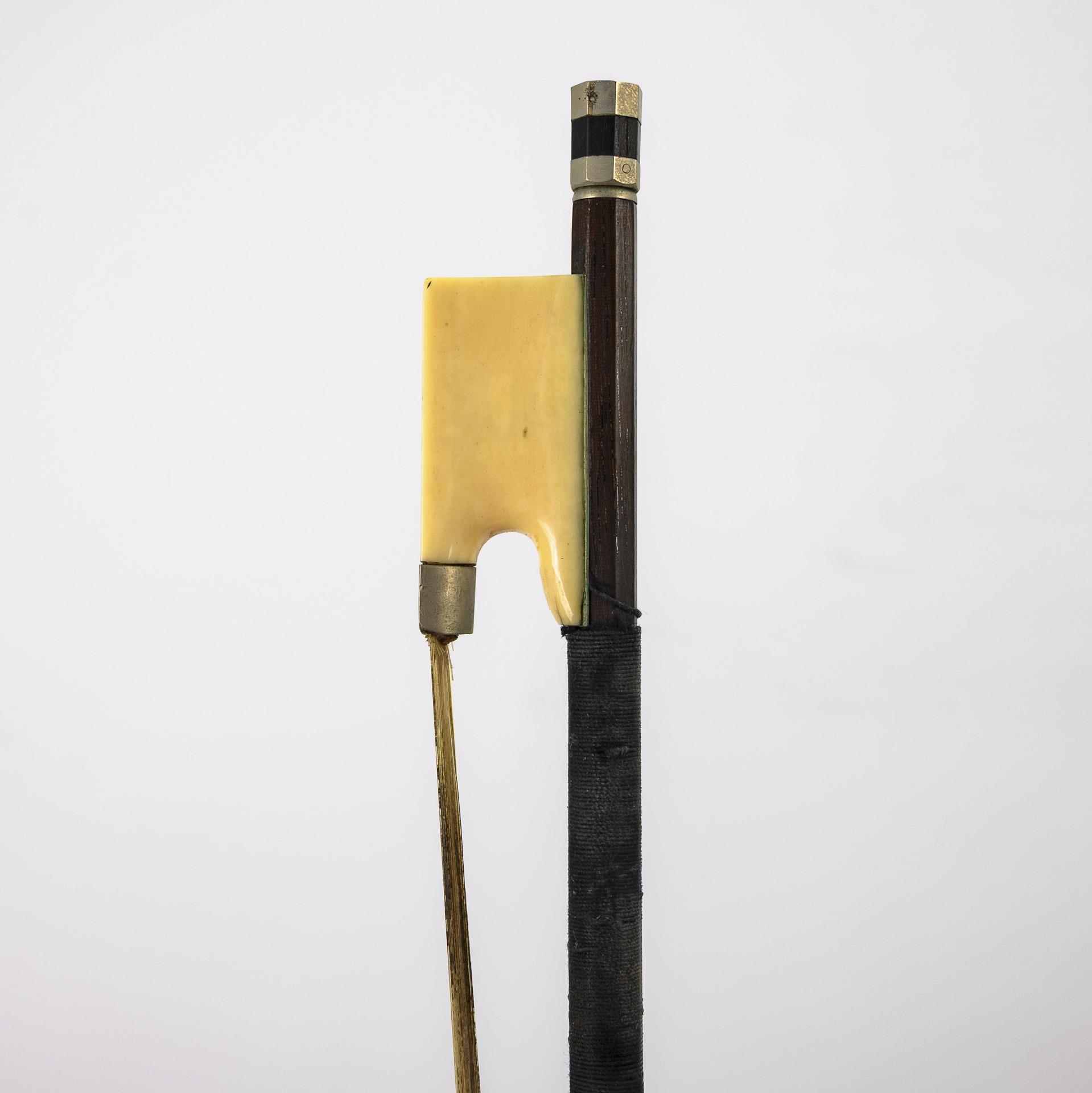 Geteilte Fichtendecke, Zarge und geteilter Boden aus geriegeltem Ahorn, Griffbrett und Saitenhalter aus Ebenholz(?). Bogen Fernambuk(?) mit Steinnuss-Frosch. Holzkasten schwarz lackiert. L Korpus 36 cm. L Bogen 73 cm. Gesamt 2,1 kg.