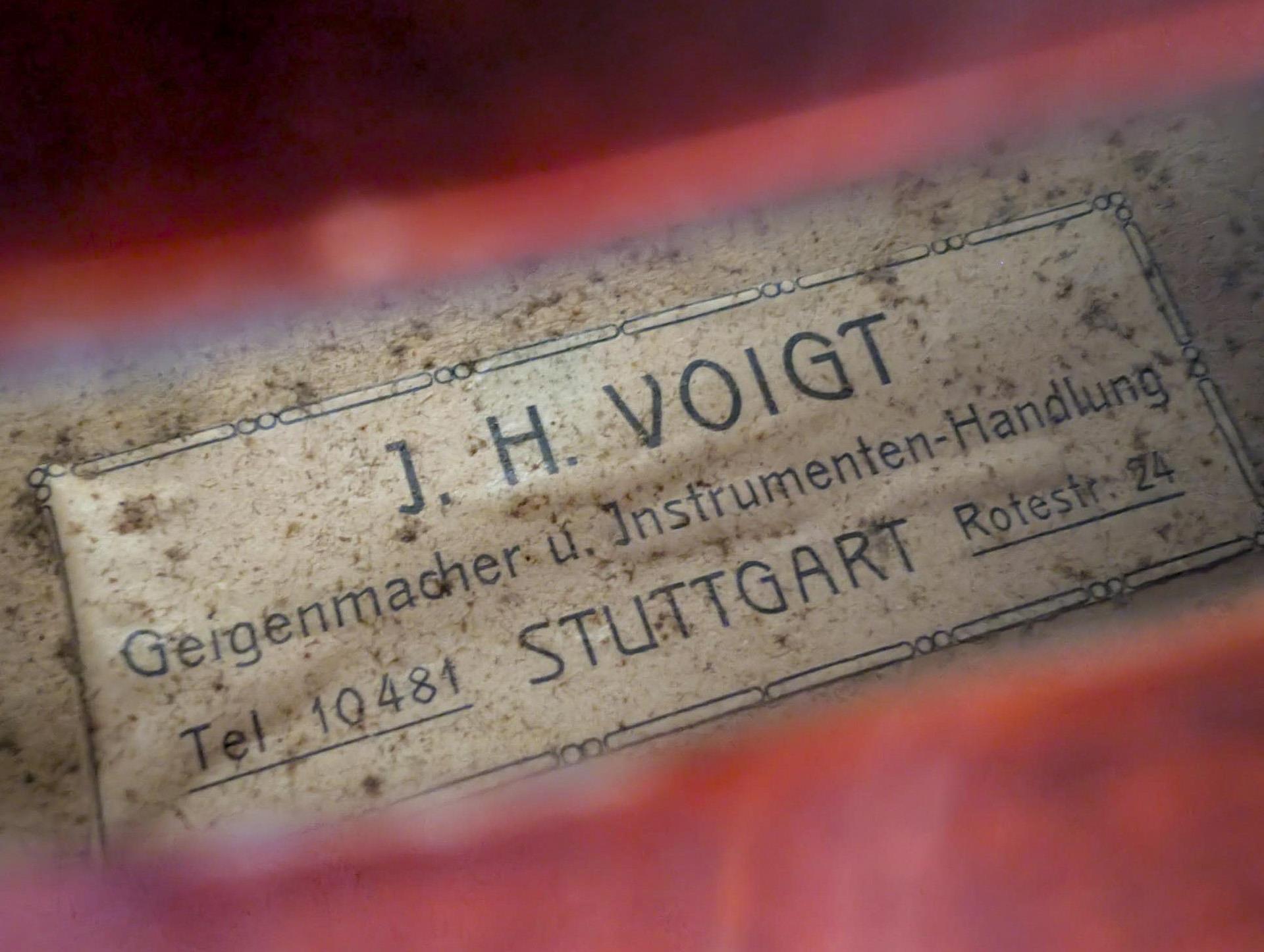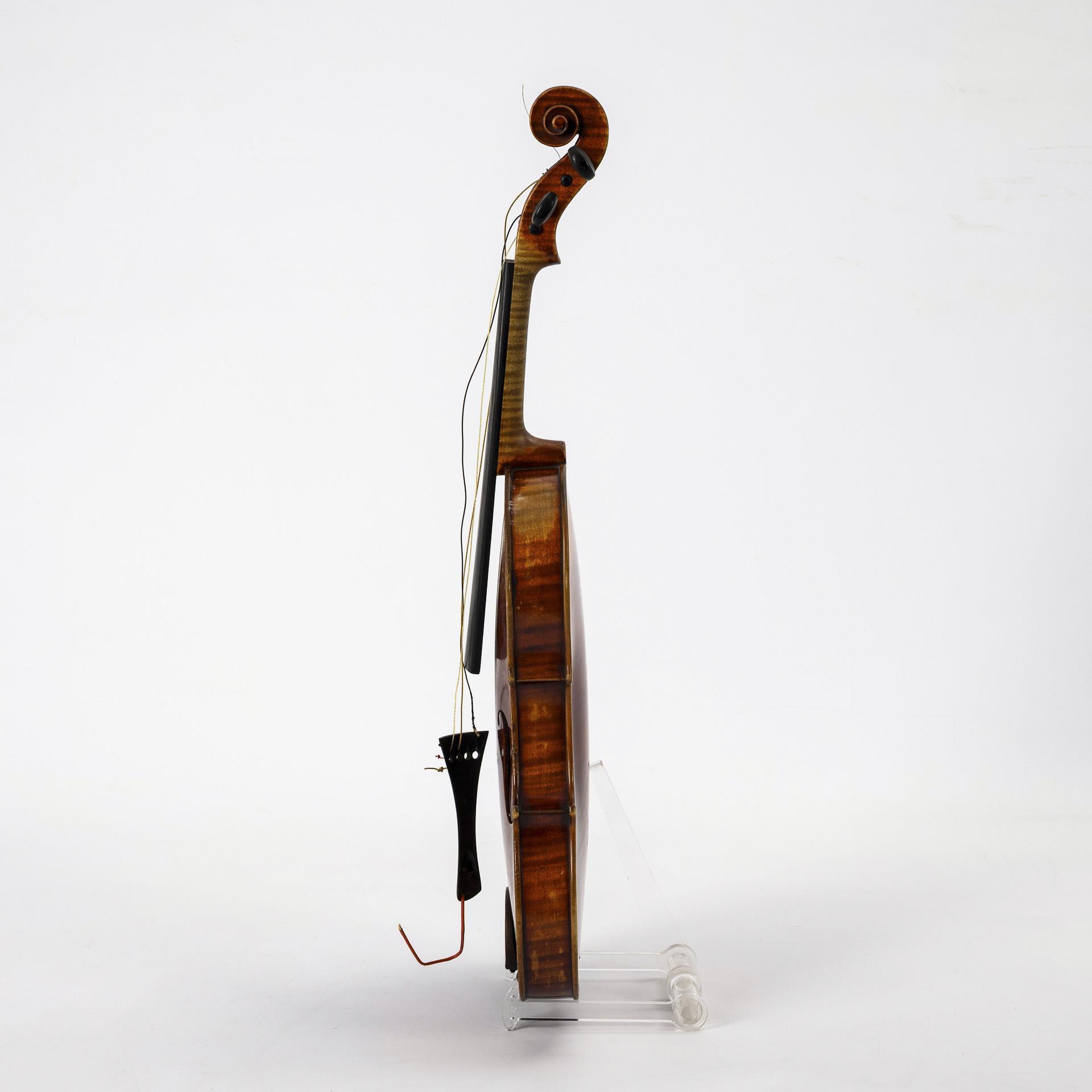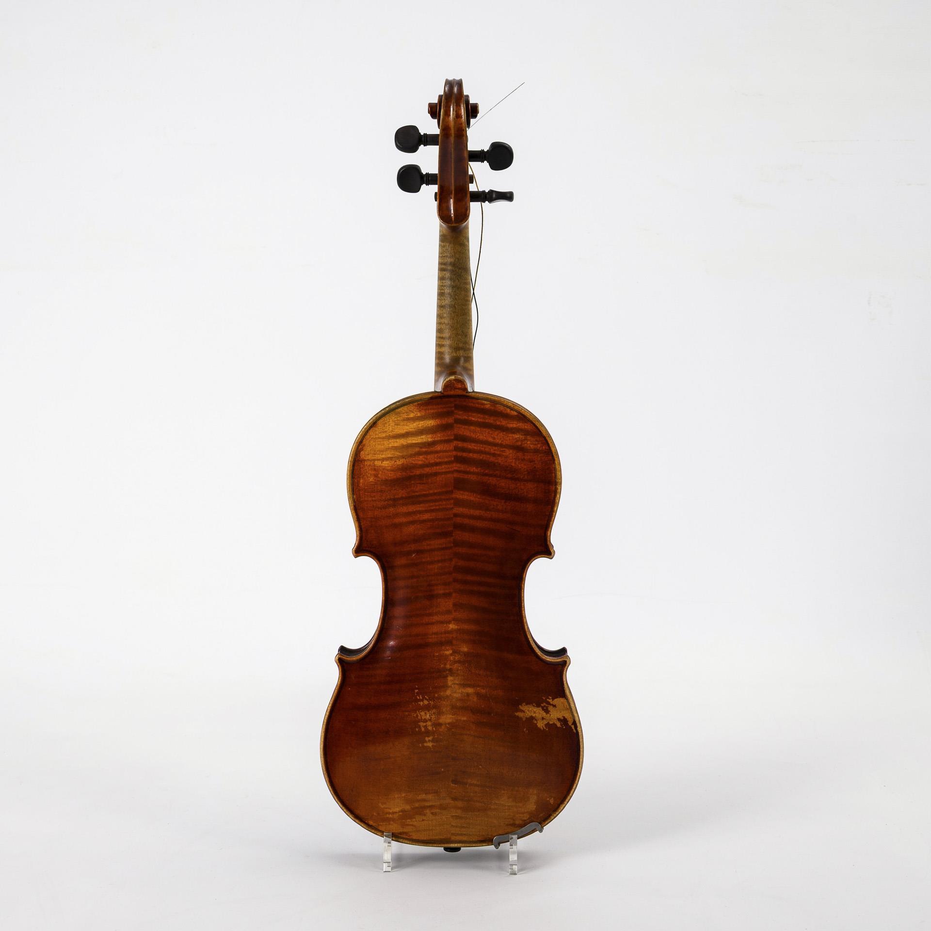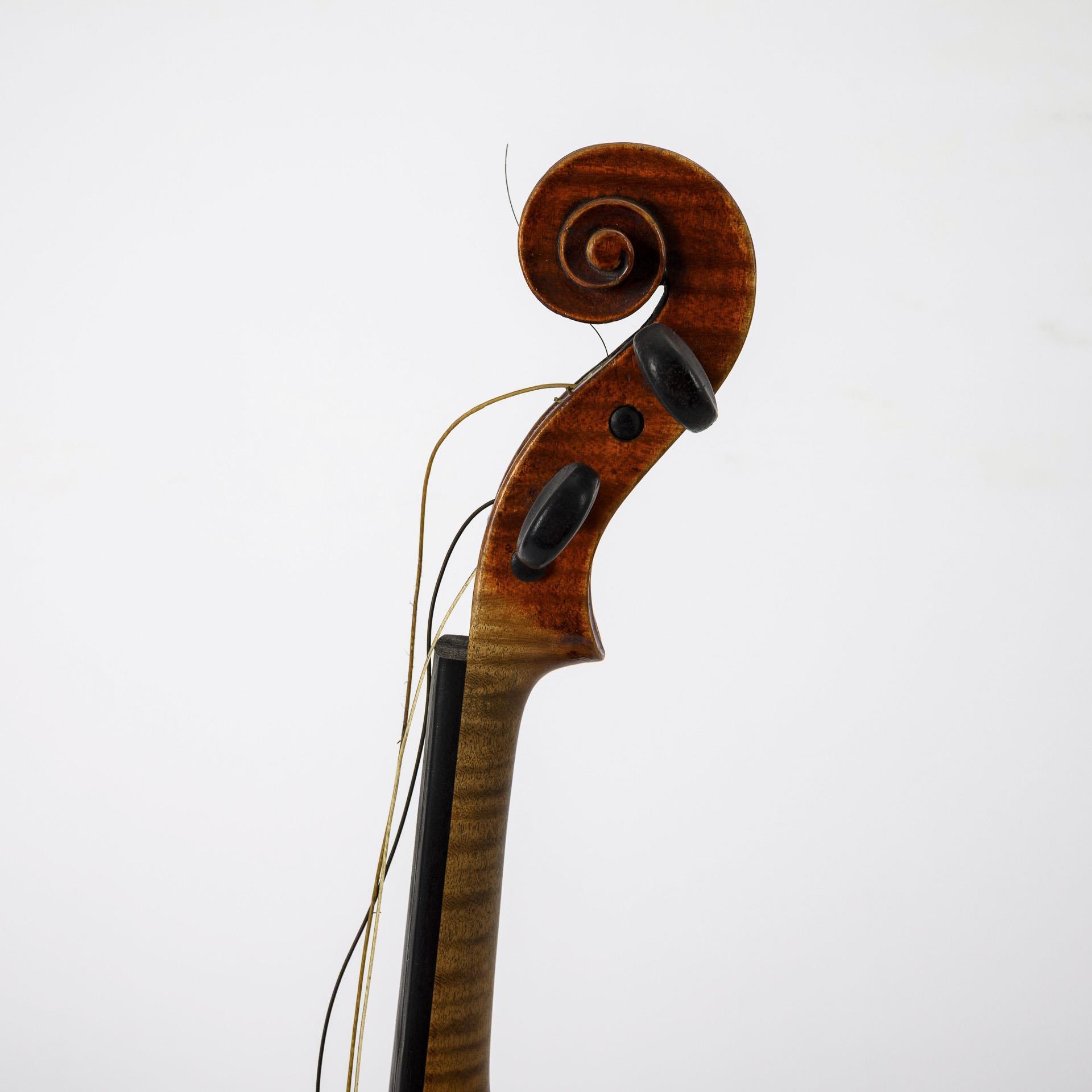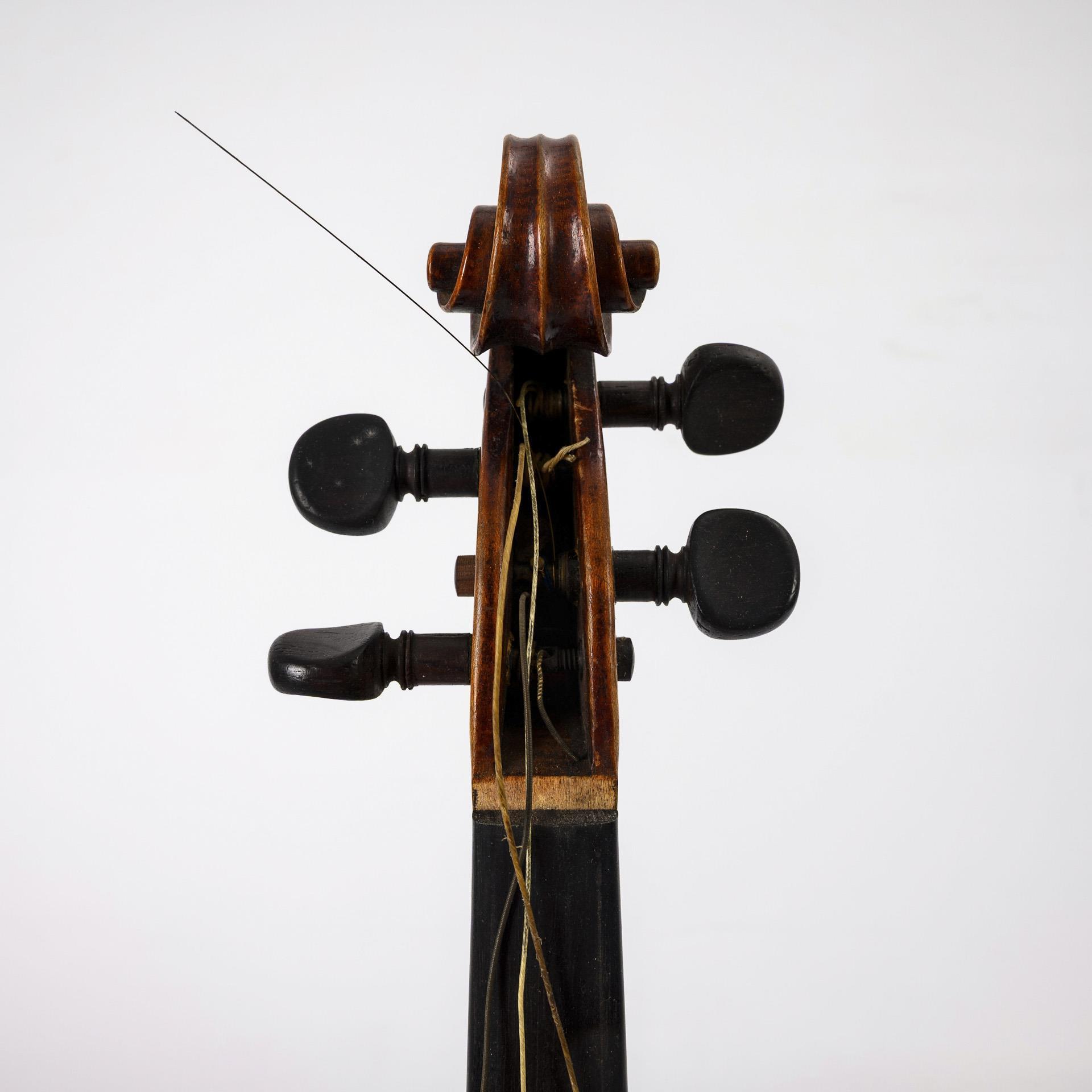 Geige mit Kinnschutz sowie beiliegende Ersatz-Saiten und 2 zusätzliche Wirbel. Bogen mit runder Bogenstange und ungewöhnlichem Frosch. Offene Leimfuge 6 cm an der Decke, Band Saitenhalter ausgerissen, Lackschäden. Bogenplättchen fehlt, Wicklung teils gelöst. Kasten mit Alters-/Gebrauchsspuren.