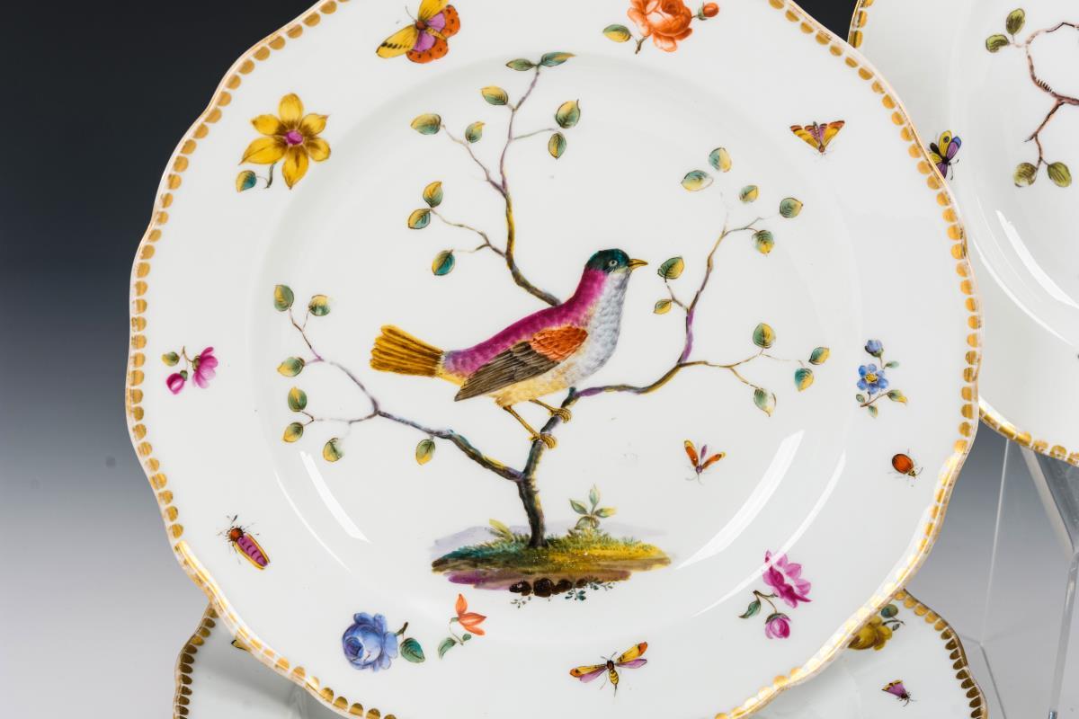 6 Speiseteller und 2 Salatteller mit gewelltem Rand. Im Spiegel ein im Baum sitzender Vogel, auf der Fahne Streublümchen und Insekten. Partieller Goldabrieb.