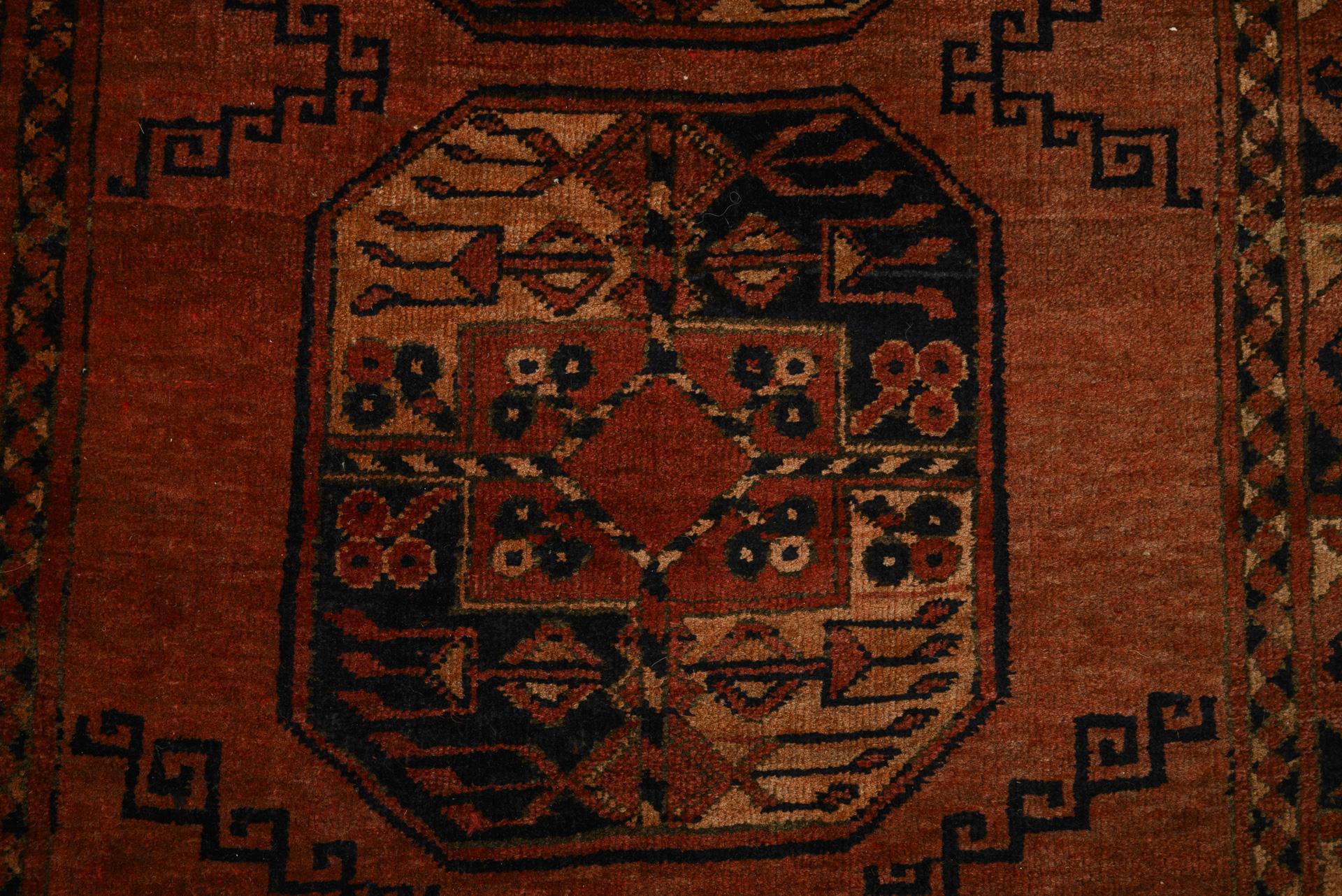 Schmales, offenes Mittelfeld mit 4 großen oktogonalen Güls und hakenbesetzten Begleitmustern. Breite Bordüre mit verschiedenen Dekorstreifen. Kurzer Kelim und geknotete Fransenabschlüsse.