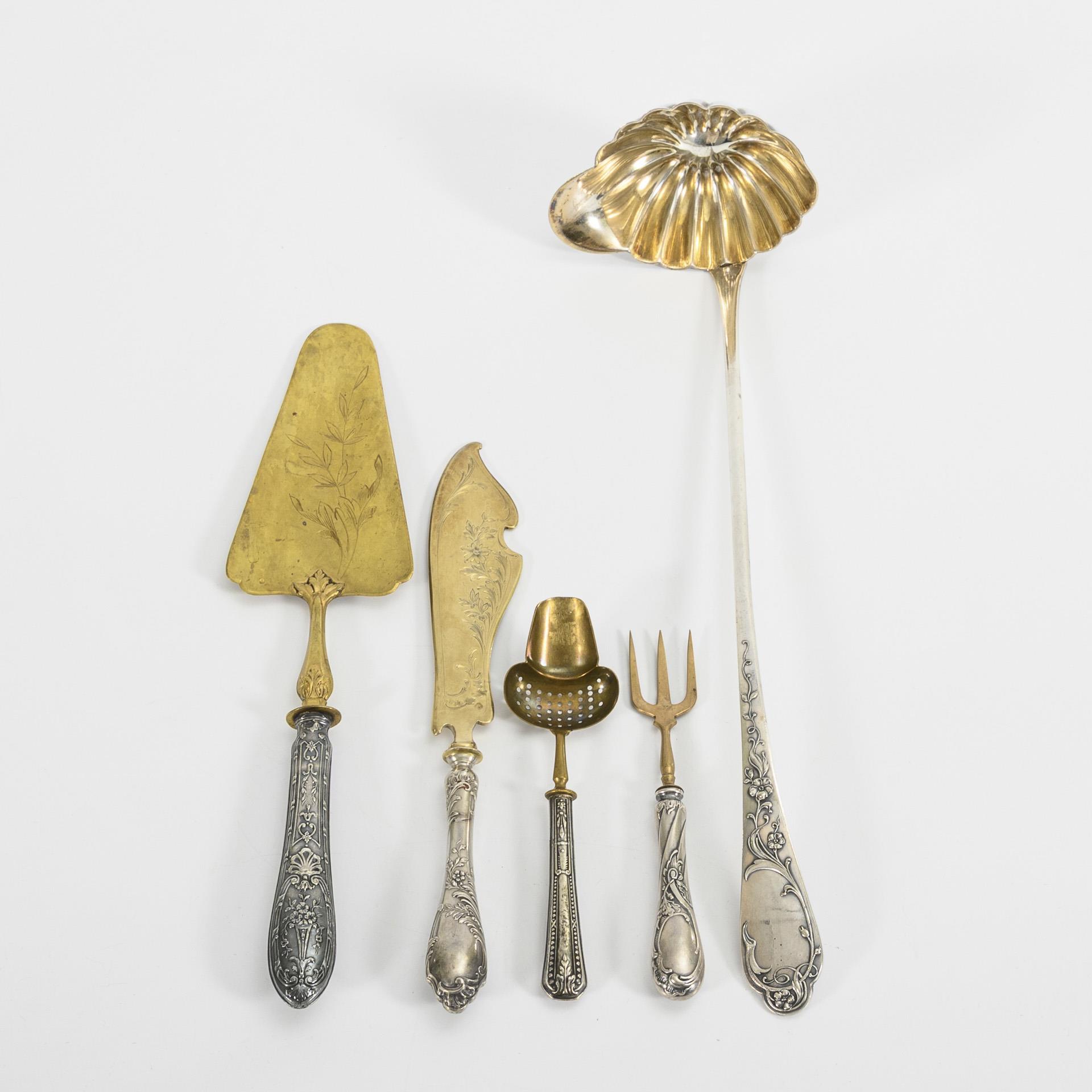 Alle mit reliefierten Silbergriffen. Bowlenkelle, Tortenheber, Vorlegemesser, Zuckerlöffel und kleine Gabel. Einige Alters- und Gebrausspuren, v. a. am Vorlegemesser und am Tortenheber.