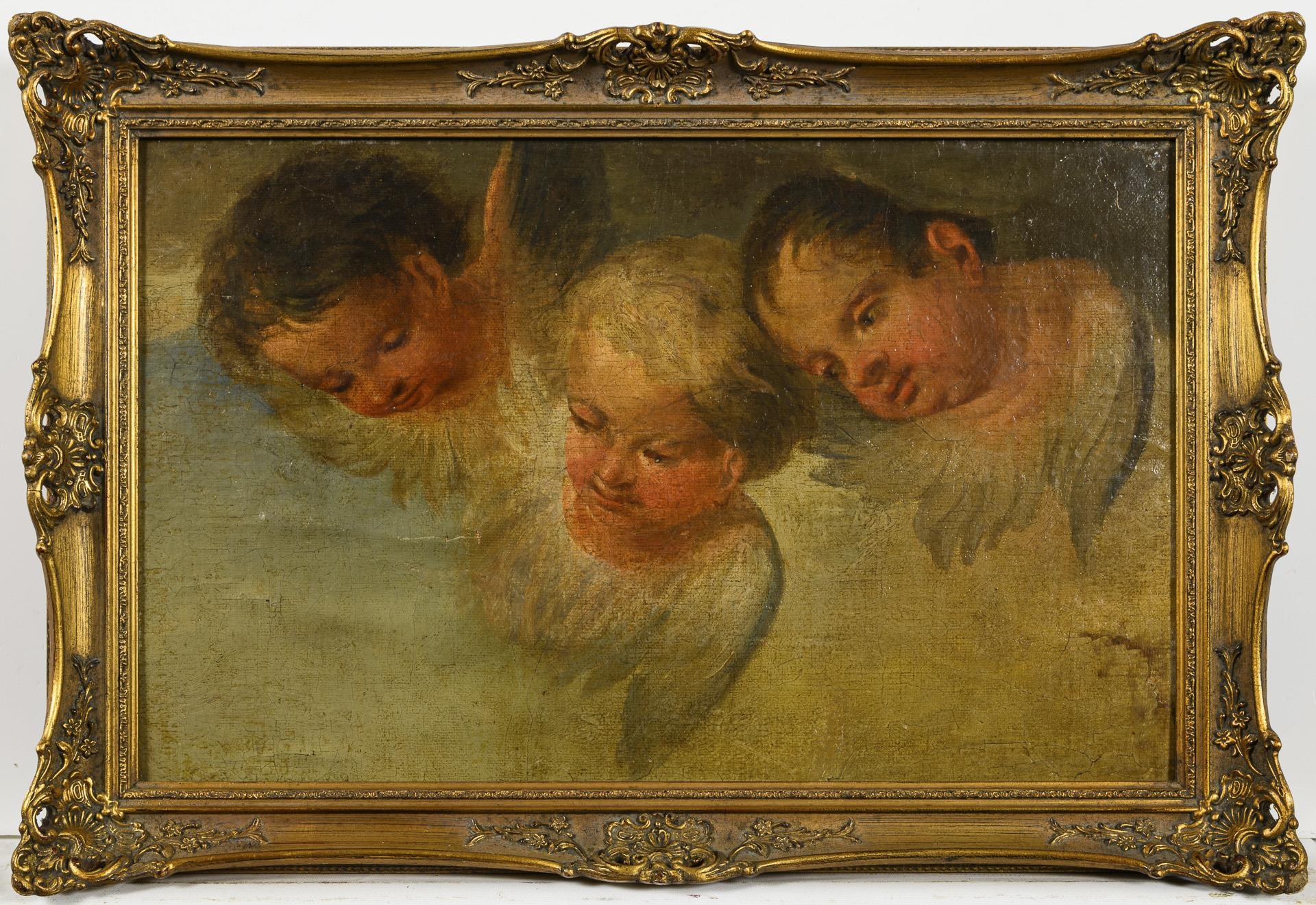 Wohl Ausschnitt aus einem größeren christlich-sakralem Gemälde mit den drei beflügelten Köpfen umgeben von Wolken. Altersspuren.