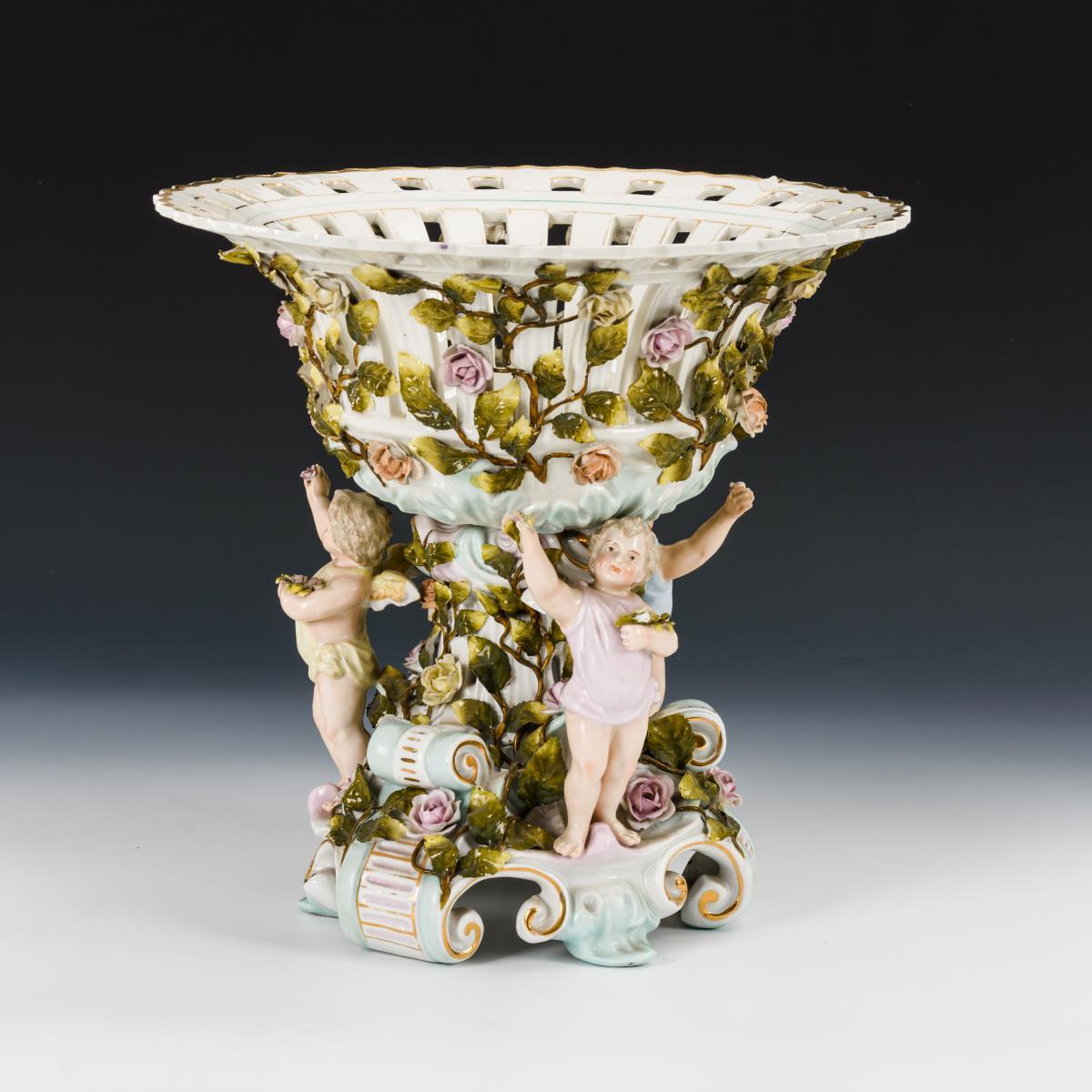Reich mit Rosenranken belegter Tafelaufsatz, mit Durchbruchkorb und drei Putten am Schaft. Partieller Goldabrieb, Bestoßungen am Belag.