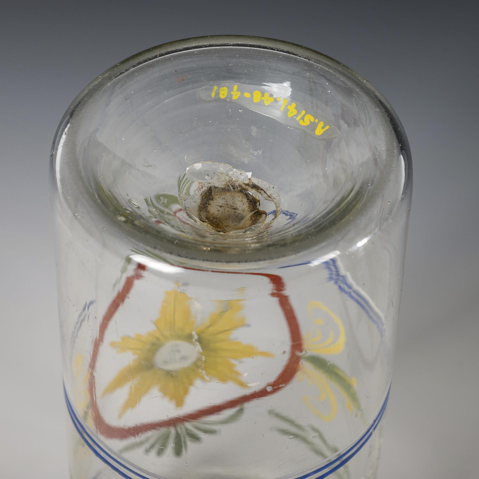 Farbloses, leicht graustichiges Glas, polychrome Emailmalerei. H 21 cm. 300 g.