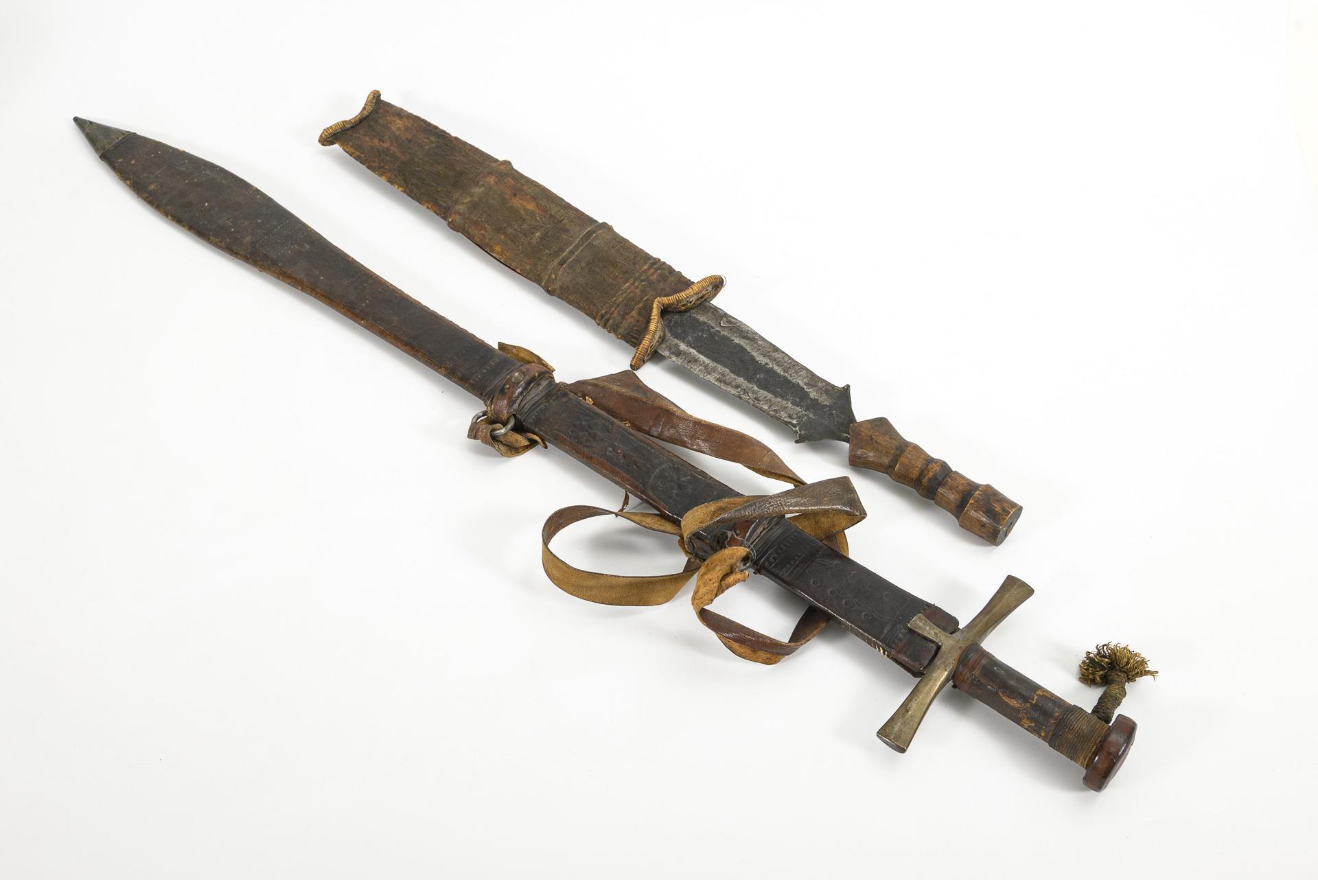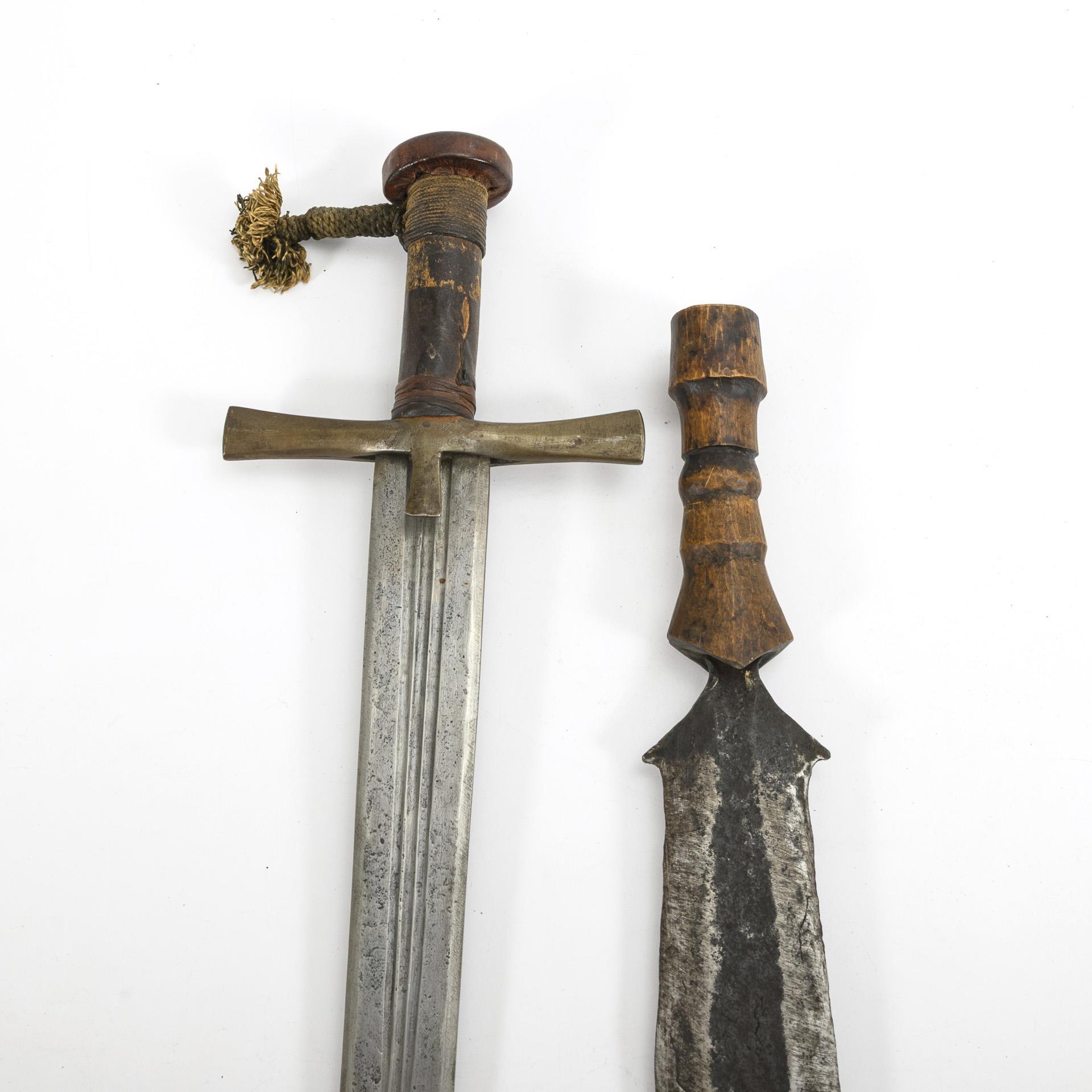 Gerades zweischneidiges Schwert mit einem durchgehenden und zwei kurzen Hohlschliffen, beidseitig je zwei Kreismarken. Parierstange aus Eisen, Griff mit Leder bezogen. Kunstvoll gearbeitete Lederscheide. Gesamtlänge 106 cm. / Messer mit unregelmäßig geformter Klinge und gegliedertem Holzgriff. Ebenfalls schön verzierte Lederscheide. Gesamtlänge 54 cm.