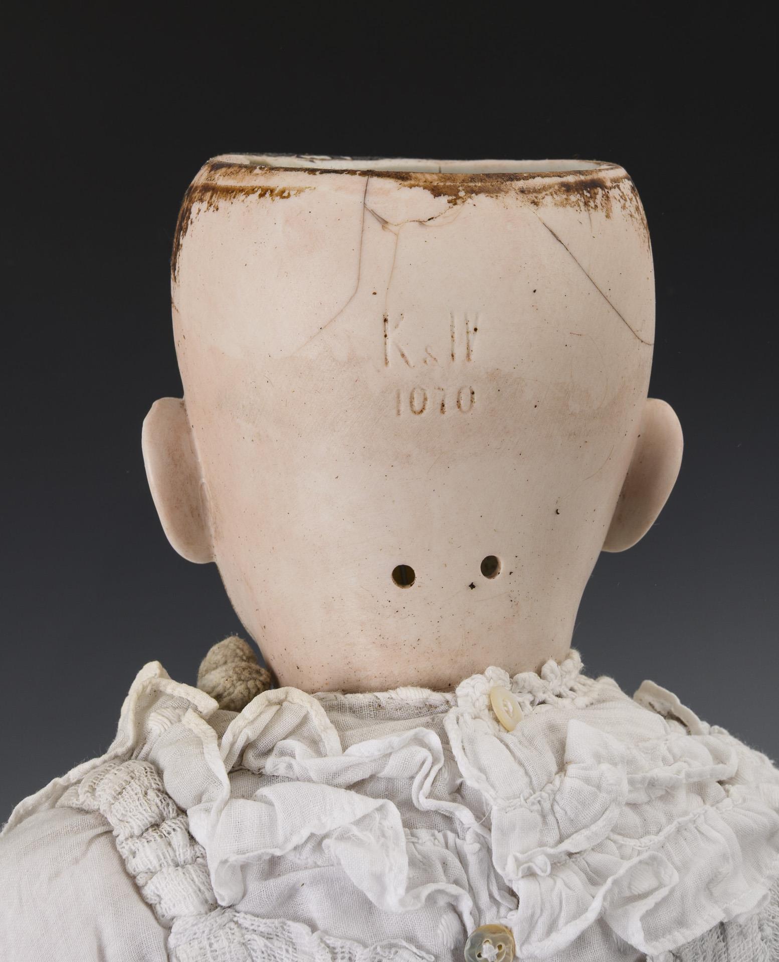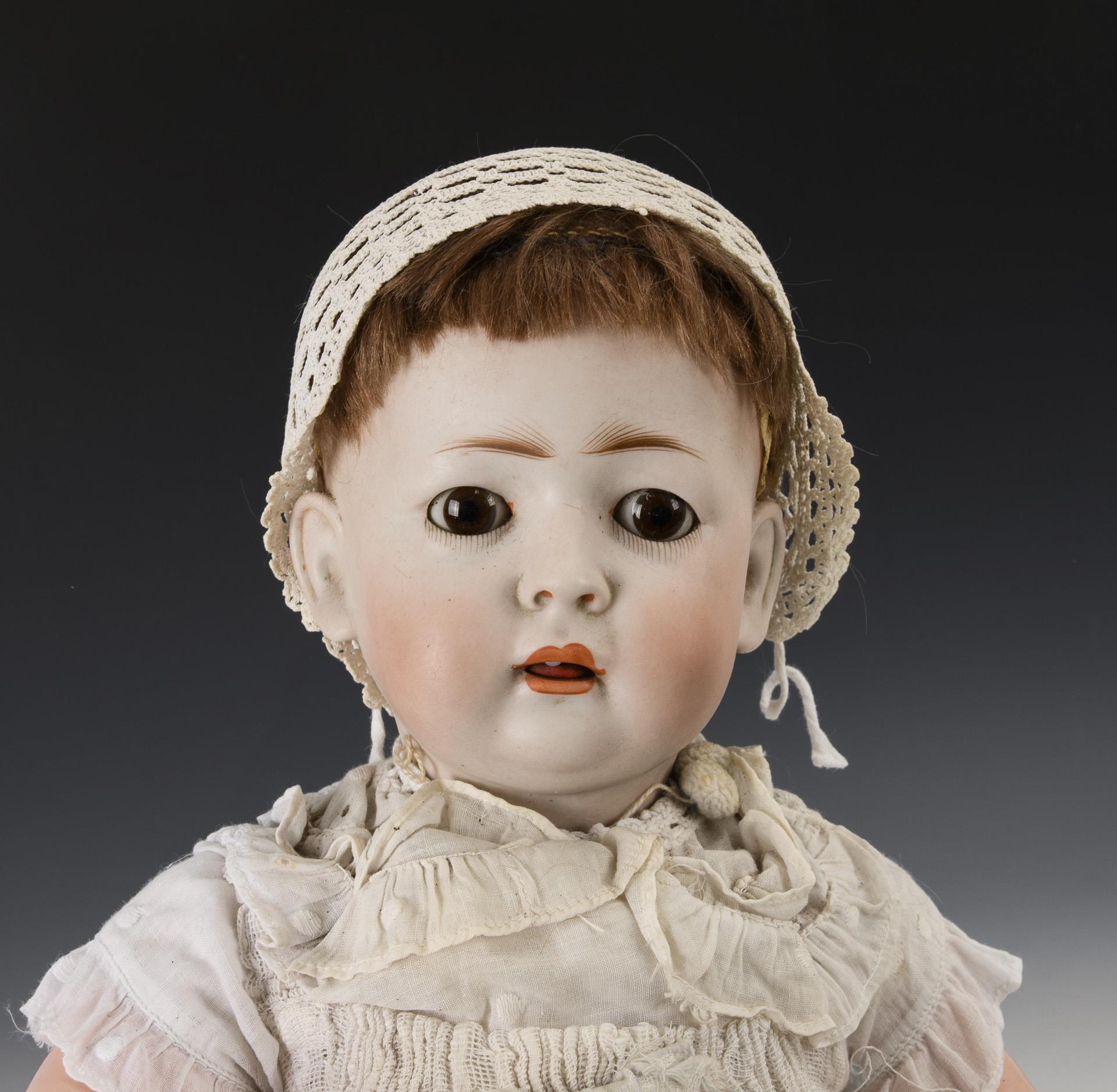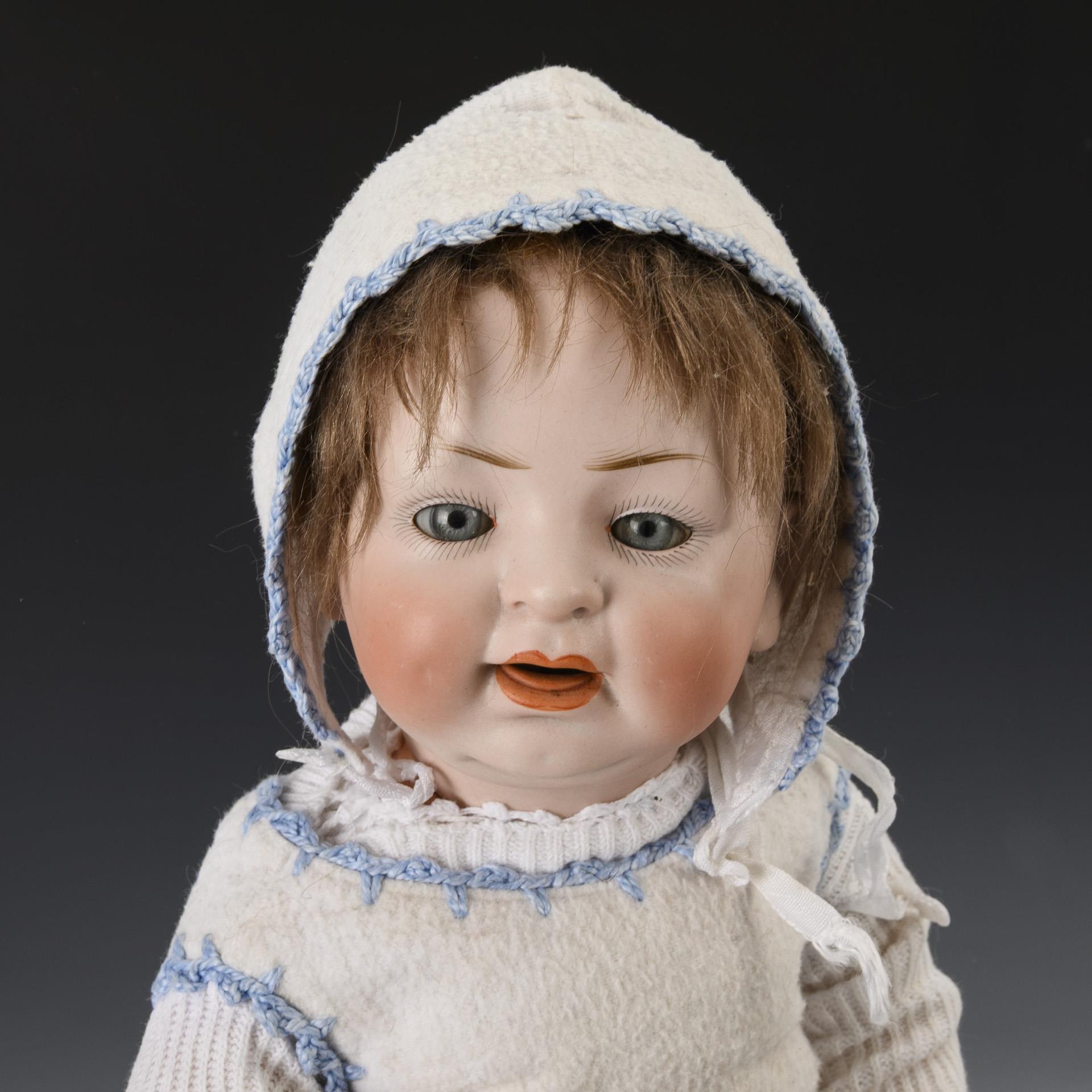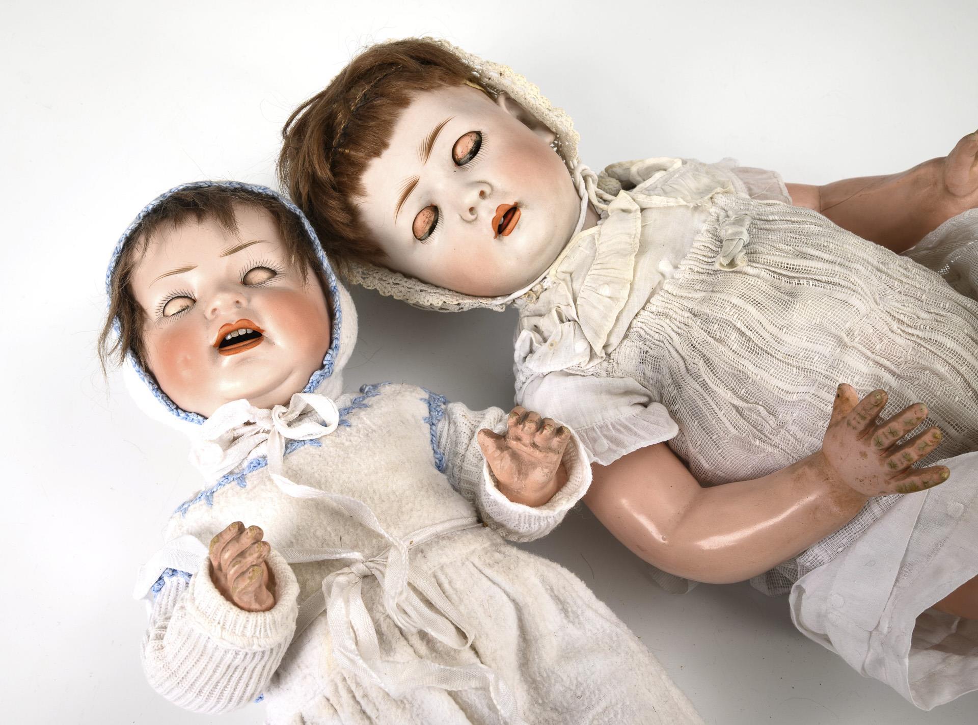 Beide mit Kurbelkopf, Schlafaugen, Mohairperücke, 5-teiligem Sitzbabykörper und weißer Kleidung. Charakterbaby Hertel, Schwab & Co (152). Kopf durchleuchtet: ohne Defekte, L 40 cm. / Babypuppe König & Wernicke (K & W 1070). Perücke defekt, 1 Zahn fehlt, Risse am Hinterkopf, L 48 cm.
