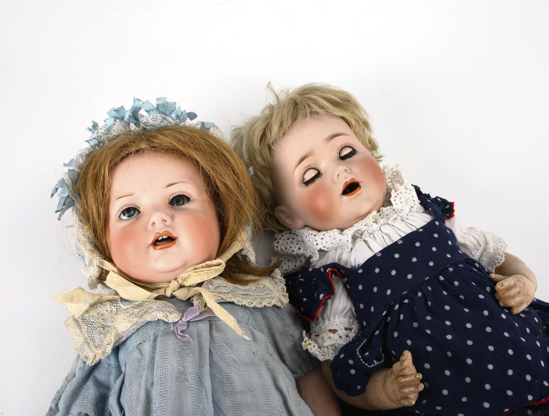 Beide mit Kurbelkopf, blauen Schlafaugen, Perücke und 5-teiligem Sitzbabykörper. Kestner-Baby (JDK 257) mit blonder Mohairperücke und dunkelblauem Kleid mit weißen Punkten. Zunge fehlt. / Puppenmädchen Baehr & Proeschild (585) mit rotblonder Echthaarperücke und hellblauem Kleidchen, 1 Bein mit retuschiertem Riss. Perücken fest, Köpfe nicht durchleuchtet: keine Defekte sichtbar.