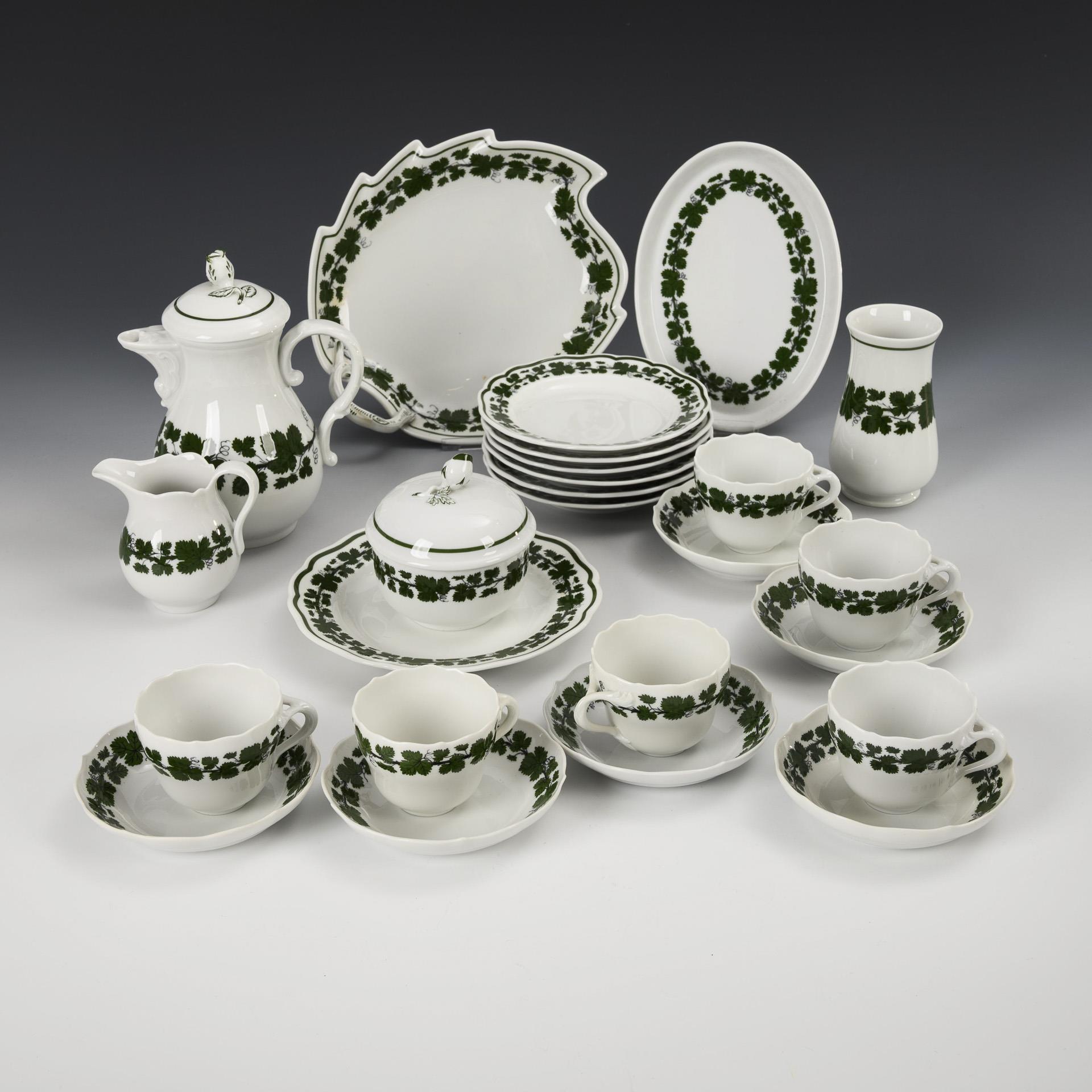25 Teile. Form "Neuer Ausschnitt". Mokkakanne (H 16,5 cm), Milchkännchen, Zuckerdose, 6 Mokkatassen, 6 Untertassen, 6 Gebäckteller, 1 Vase (H 11 cm), 1 ovales Tablett (L 18 cm), 1 Blattschale (L 22 cm) und 1 Teller (Ø 16,5 cm). Chip an 1 Untertassenrand, Bestoßung an 1 Untertassenrrand.