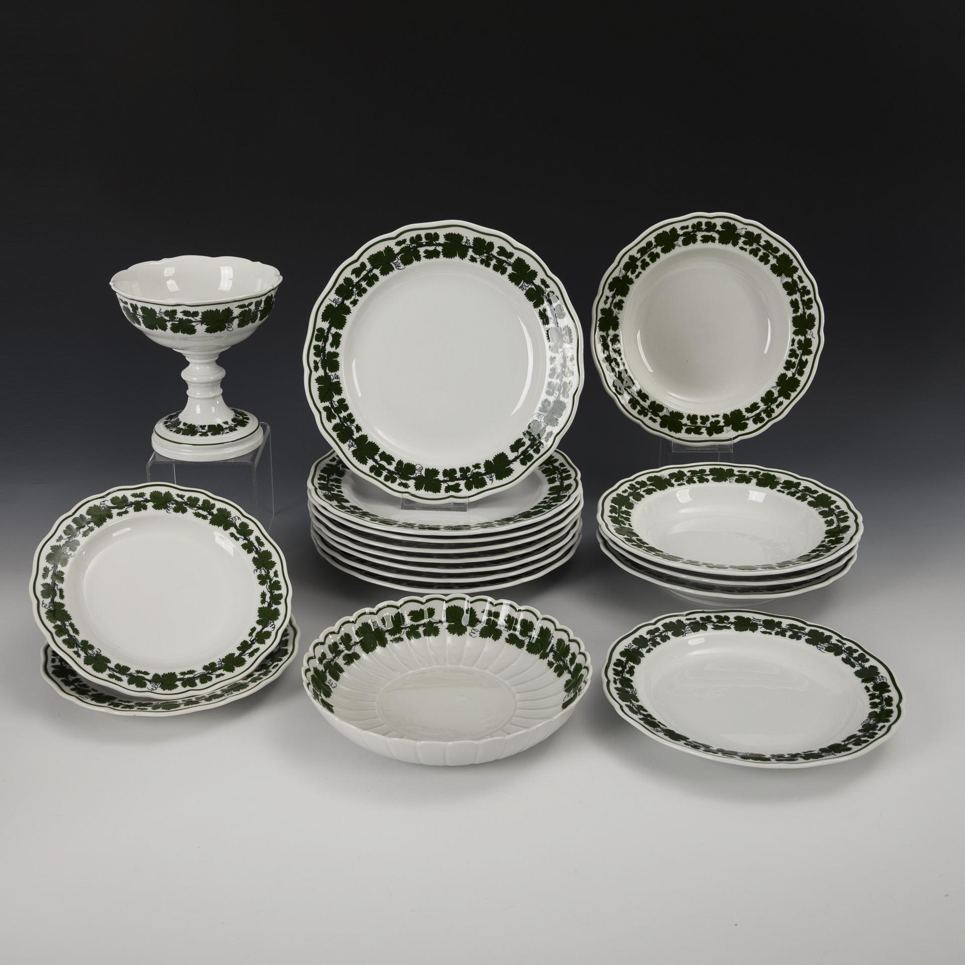 15 Weinlaub-Teller und 1 -Tafelaufsatz mit Presentoir. Meissen.