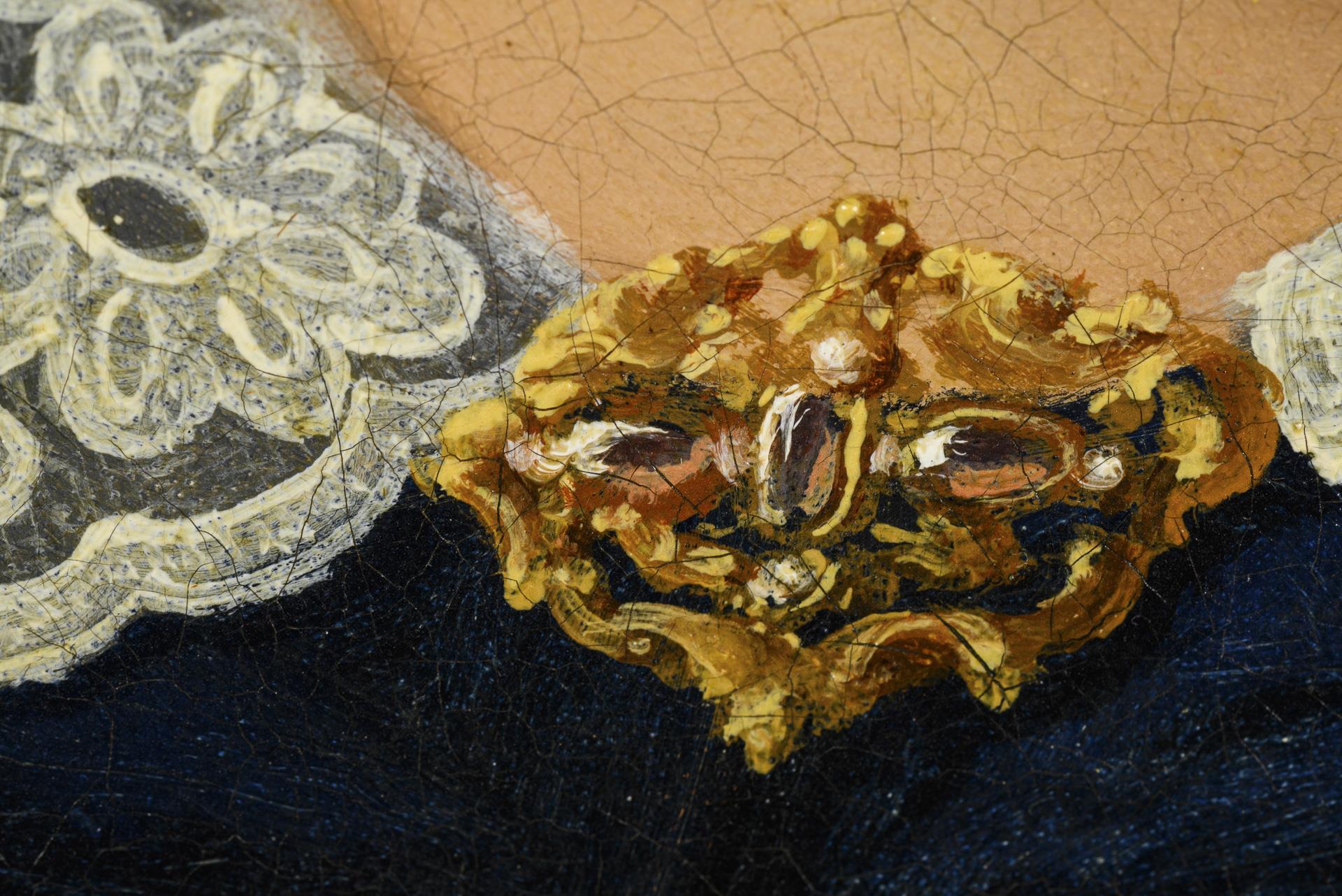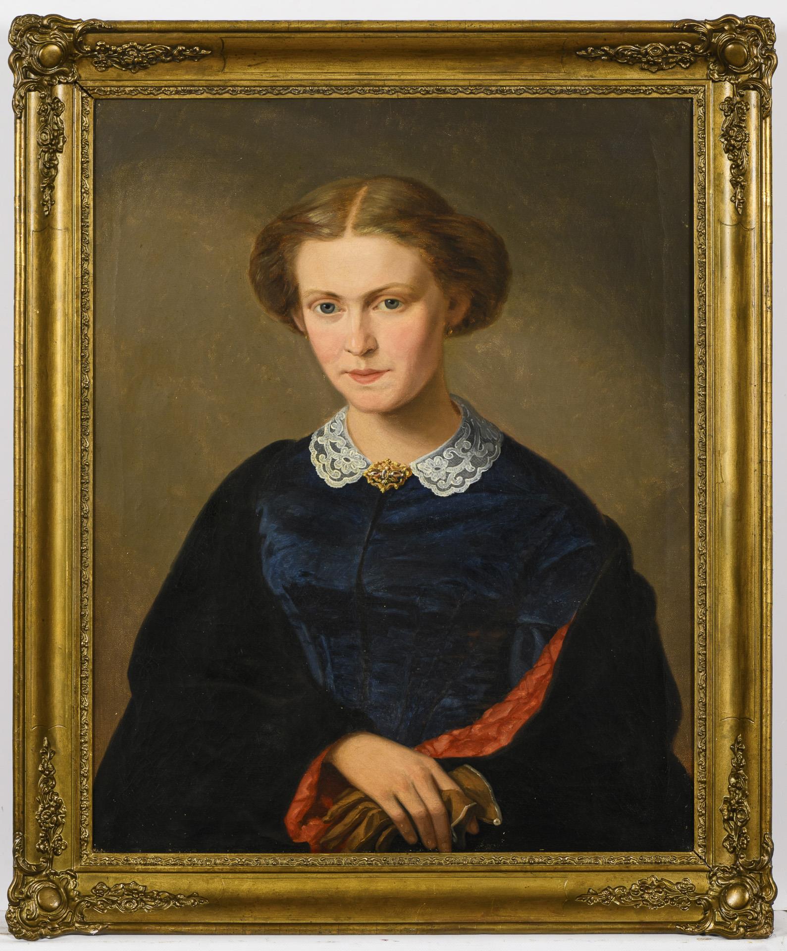 Bildnis einer jungen Frau im dunkelblauen Kleid mit goldener Brosche und schwarzem Mantel. Leichte Altersspuren.