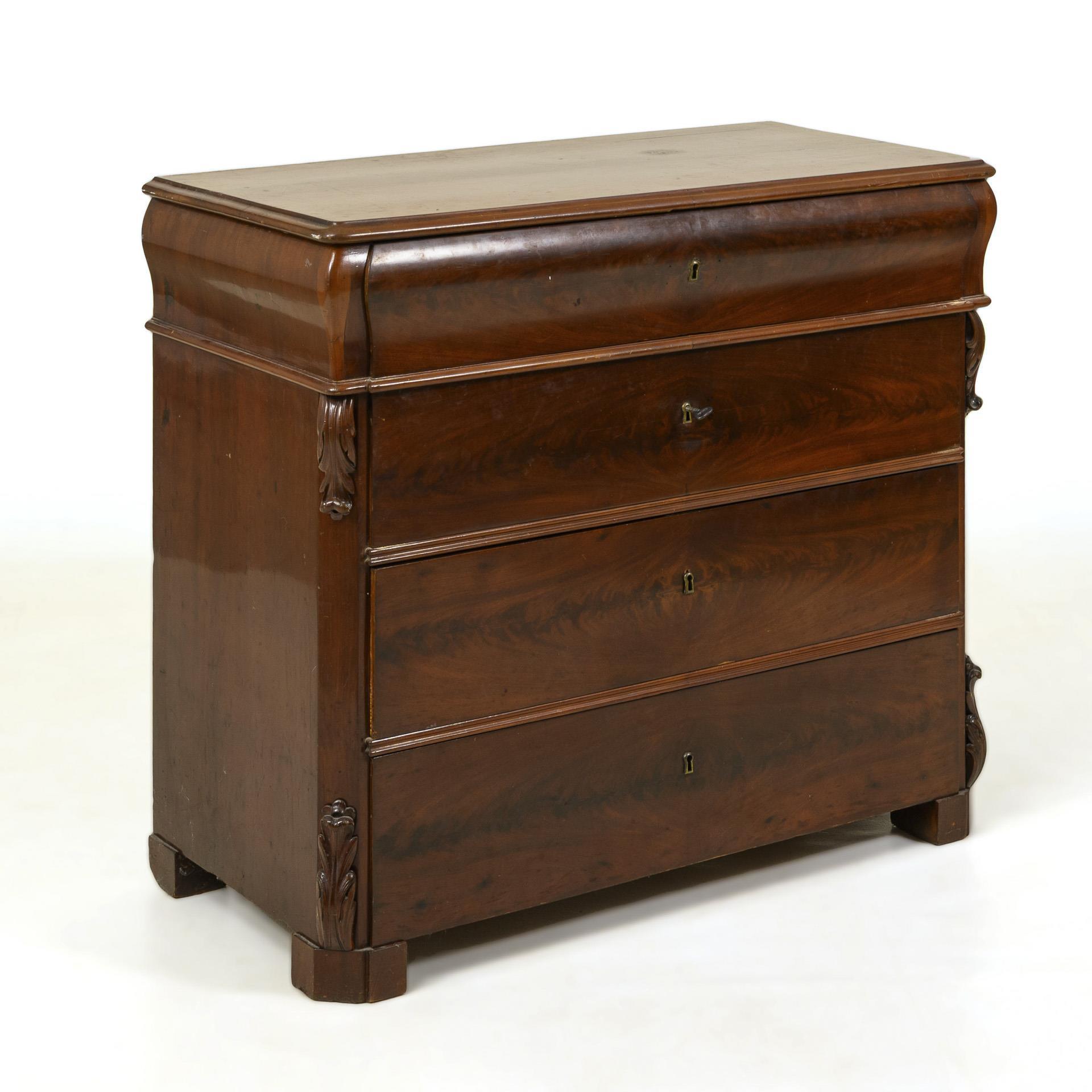 Korpus mit profilierter Deckplatte und 4 größendifferenten Schüben, geschwungener Kopfschub und abgeschrägte Ecken mit geschnitzter Blattzier, auf 4 Klotzfüßen. Schlüssellocheinlage aus Messing. Gebrauchs- und Altersspuren, partiell Defekte.