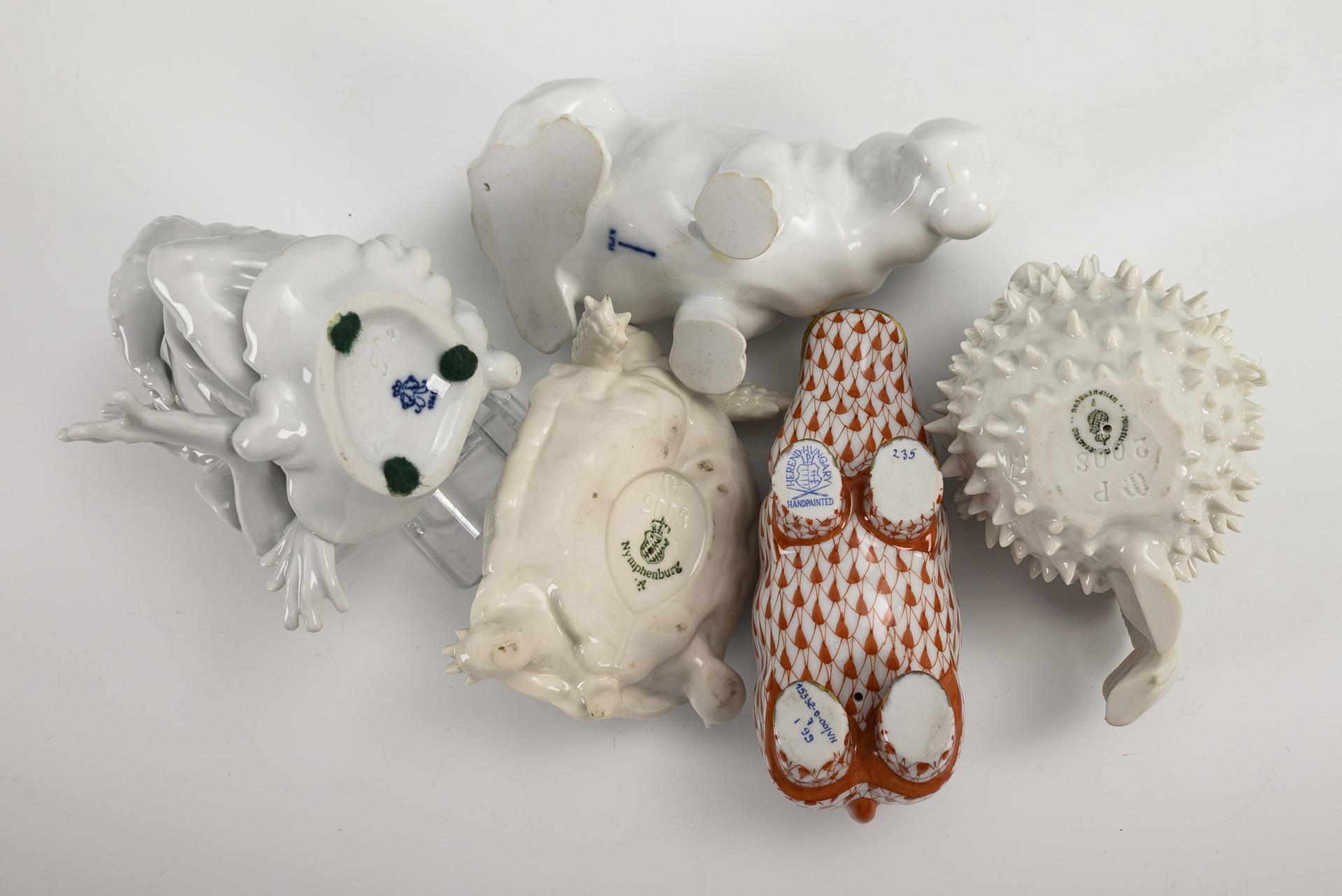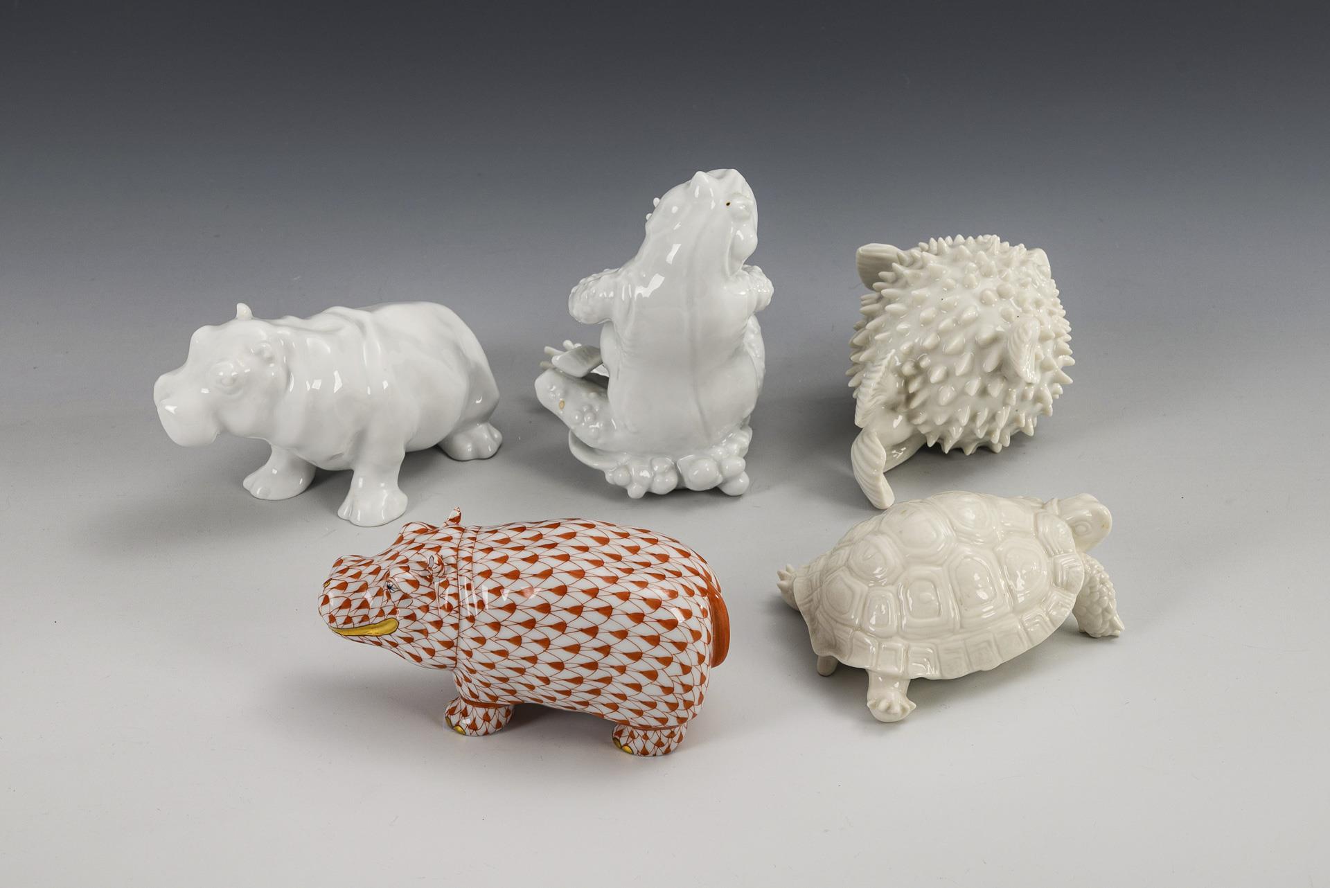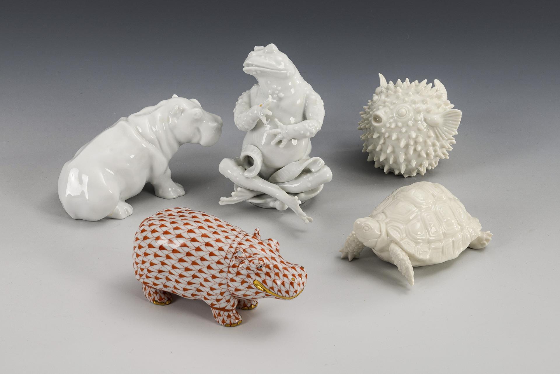 2x NYMPHENBURG: Schildkröte, Modell-Nr. 2093 (L 9,5 cm) und Kugelfisch, Modell-Nr. 2008 (H 6,5 cm). / 1x KPM BERLIN: Flusspferd (L 12 cm). / 1x HEREND: Flusspferd (L 11,5 cm). / 1x AELTESTE VOLKSTEDTER, Modell-Nr. Eb 112: sitzende Kröte (H 11 cm).