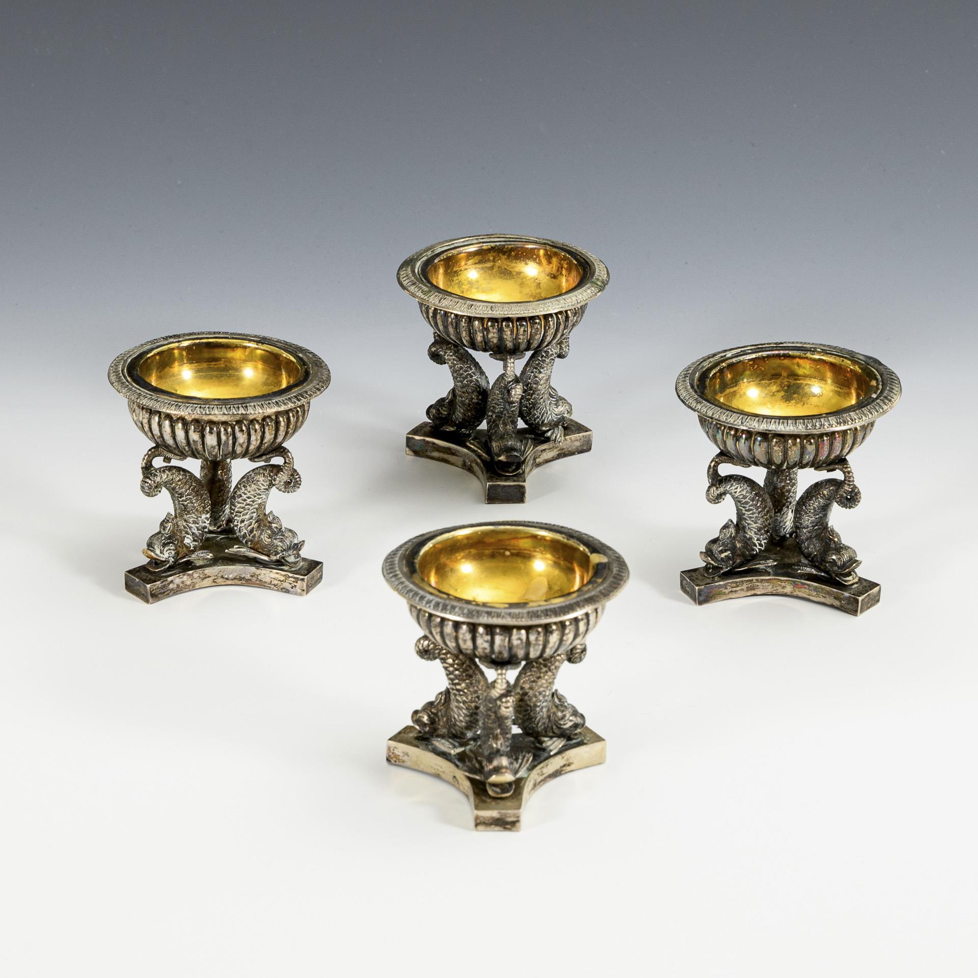 Im Stil des Klassizismus gestaltete Schälchen, auf je 3 plastischen Delfinen. Stärkere Gebrauchsspuren.