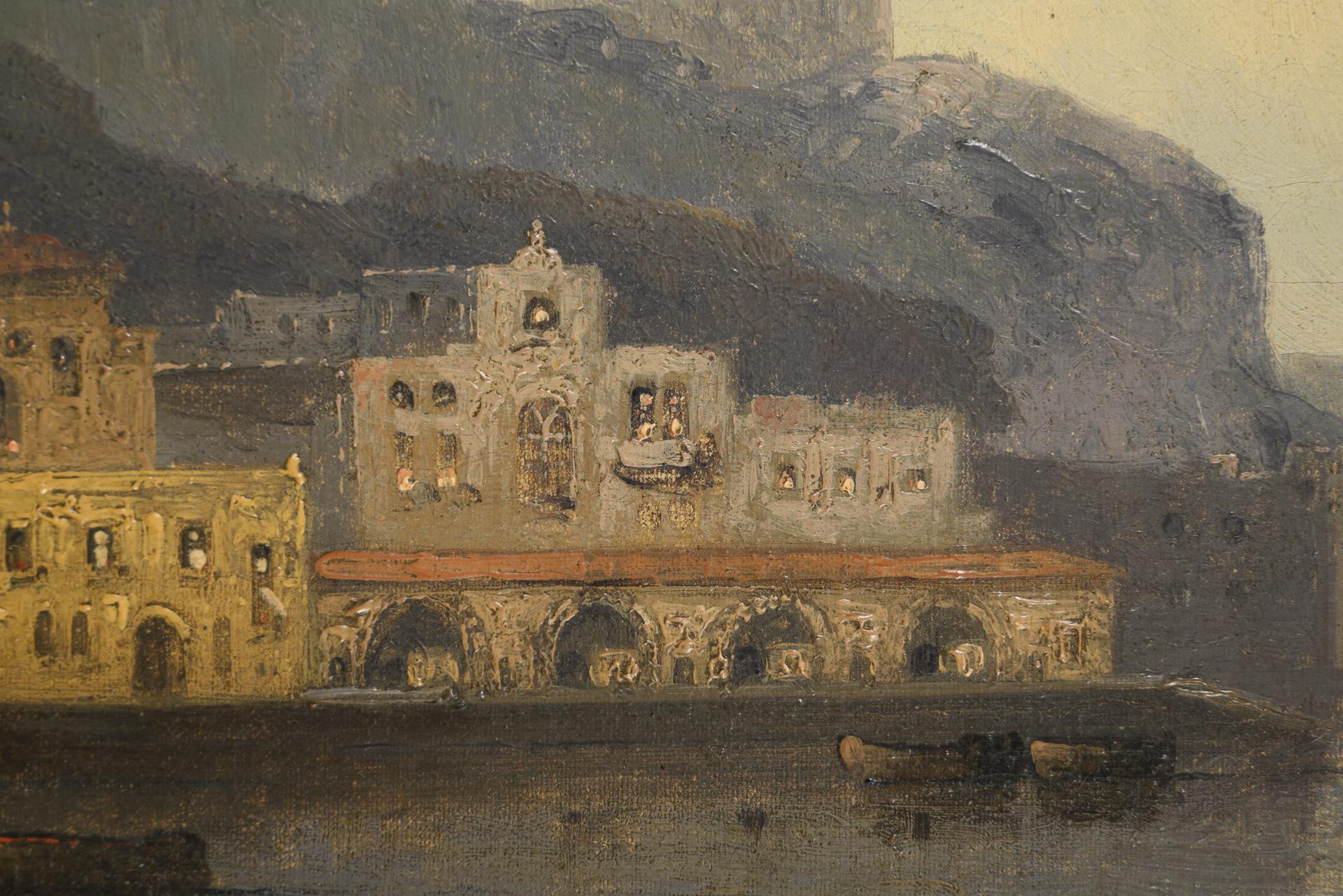 Boote auf dem Wasser nahe dem Hafen und der Stadt vor dem Gebirge. Eine kleine restaurierte Stelle mit Hinterklebung.