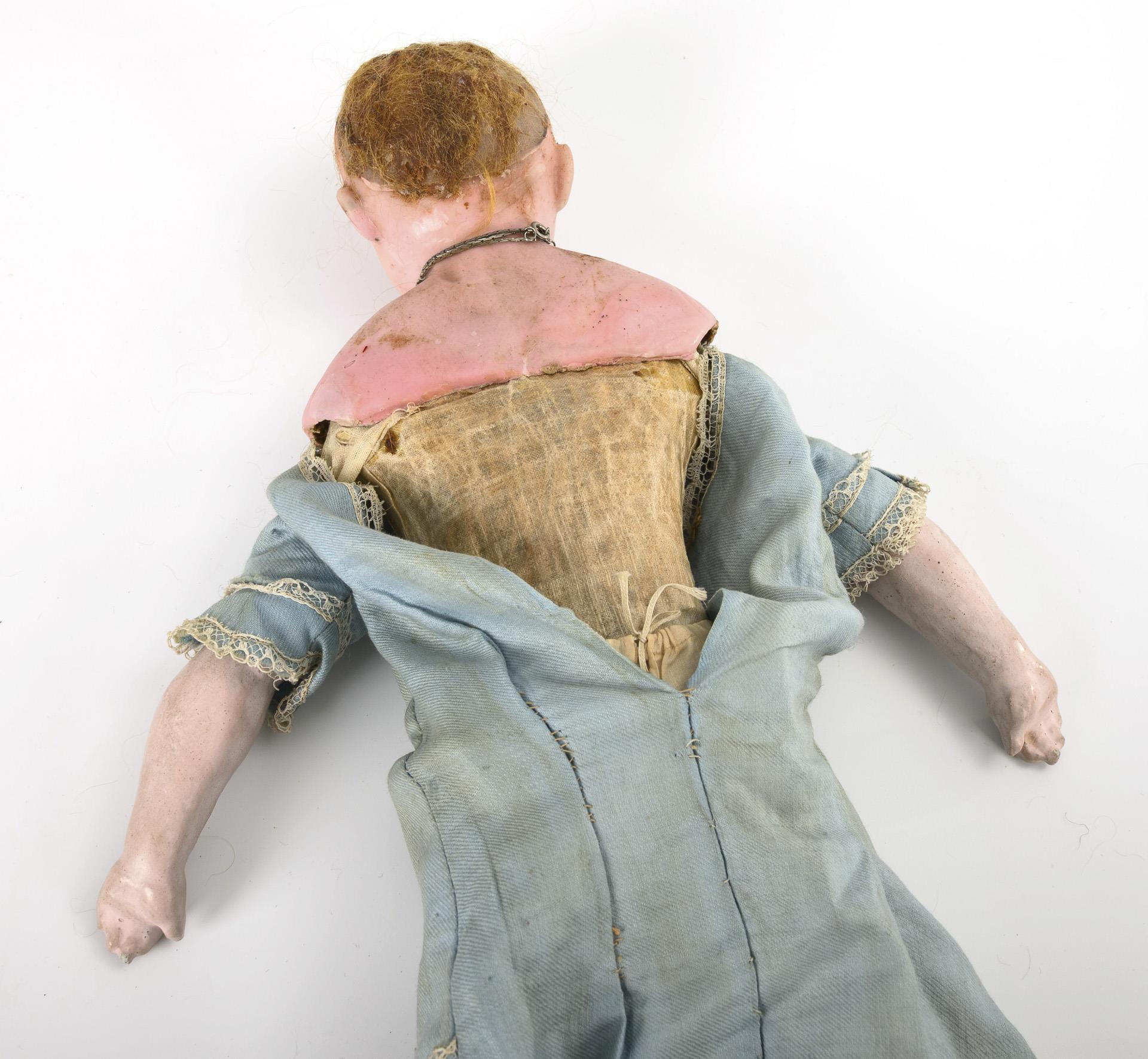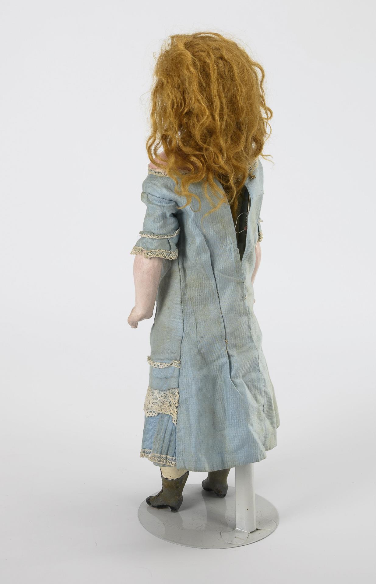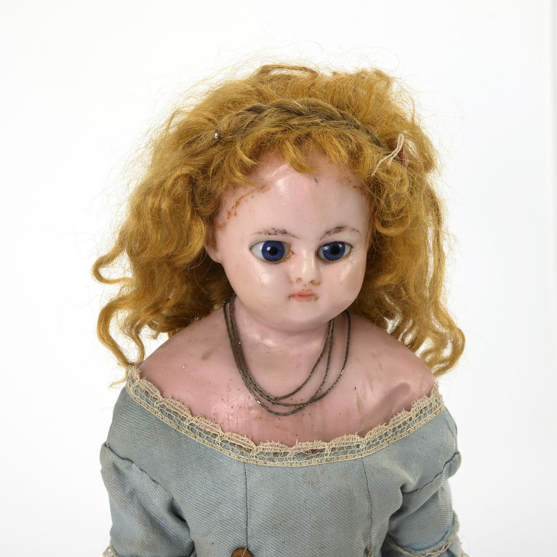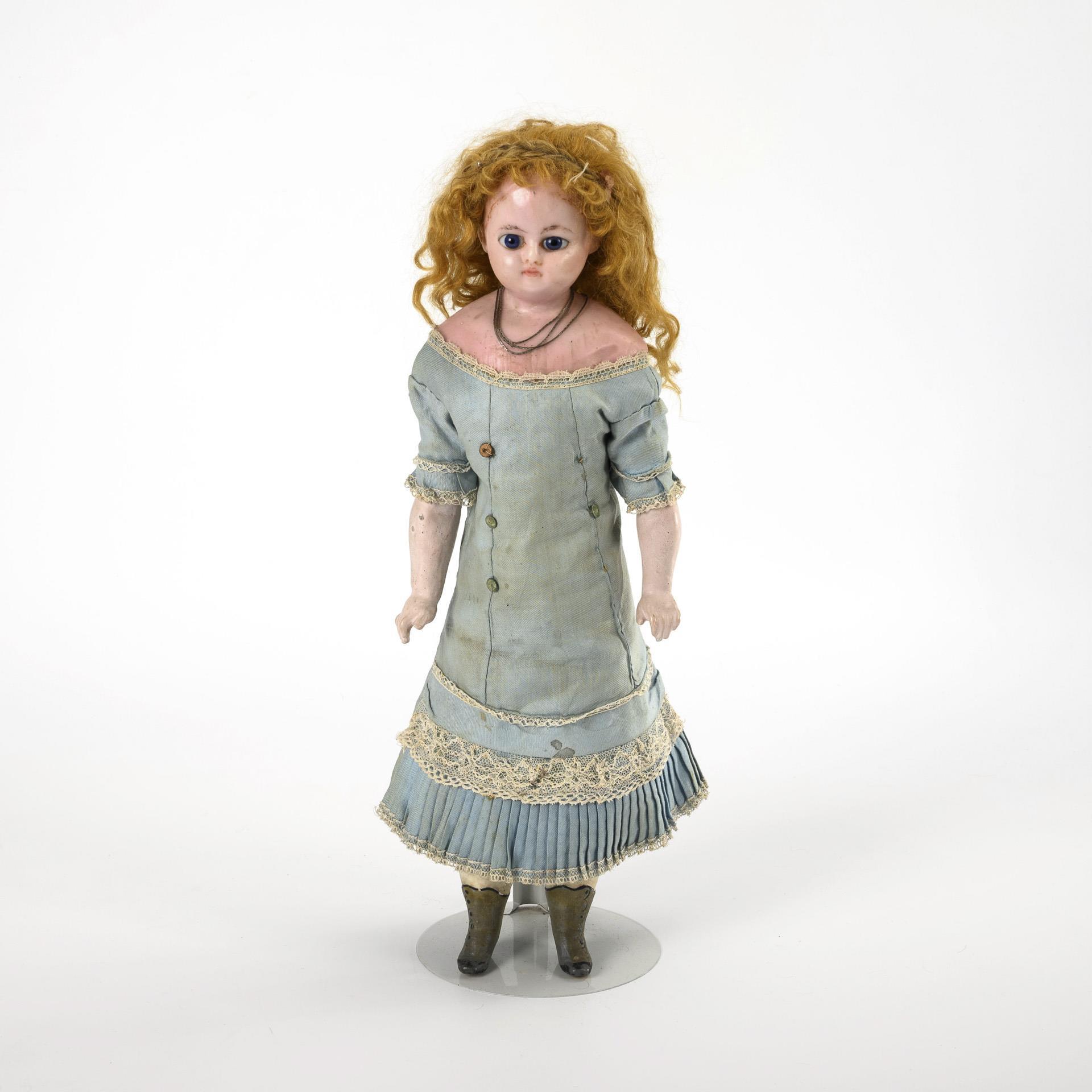 Wachsierter Kopf aus Papiermaché, feste blaue Glasaugen, rotblonde Mohairperücke. Holzwollegestopfter Stoffkörper mit Massegliedern, Beine mit anmodellierten und wachsierten Stiefelchen. Altes, hellblaues Kleid. Altersspuren.