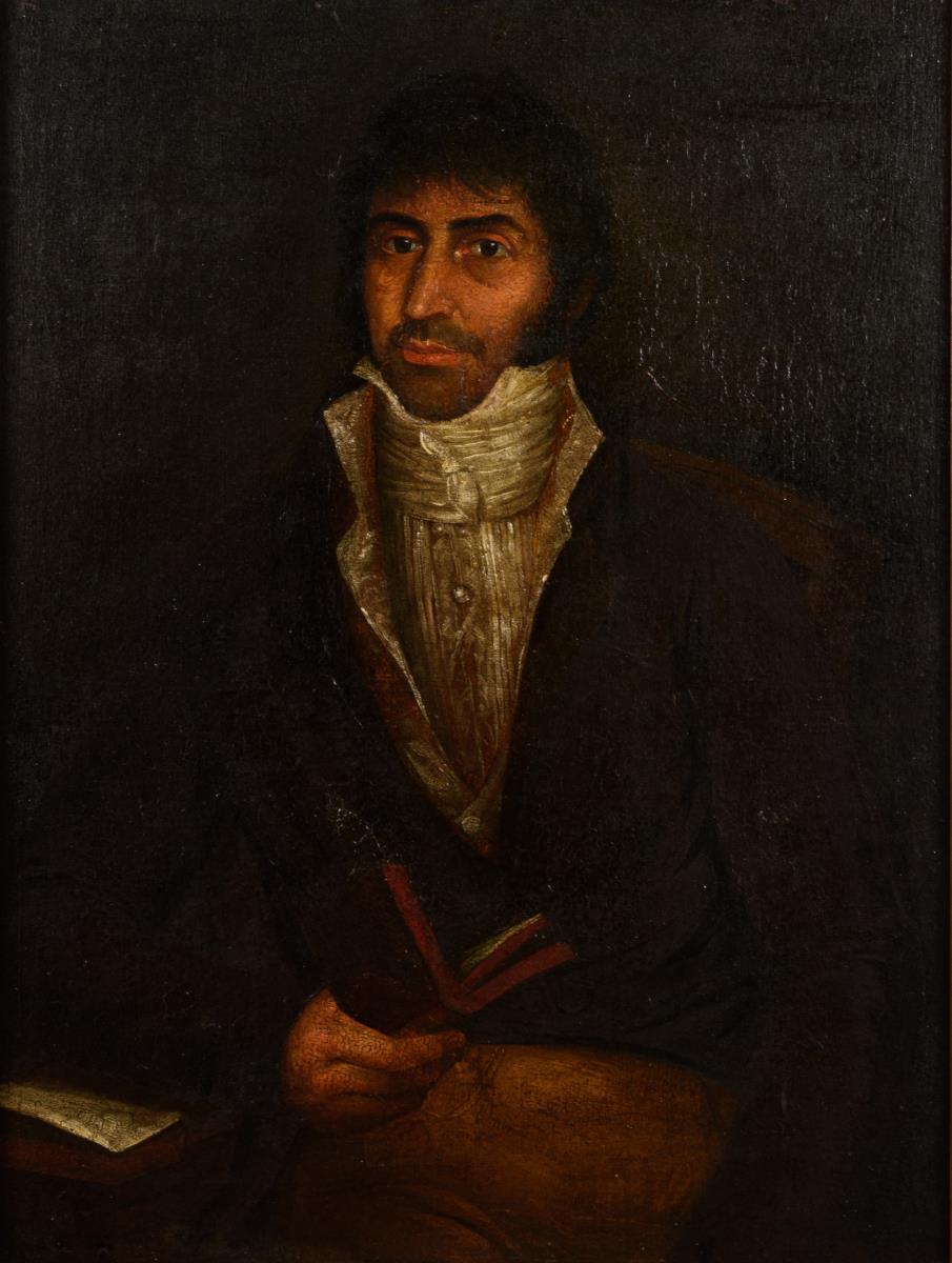 Porträt eines jungen Mannes am Schreibtisch mit einem Buch. Restaurierungsbedürftig.
