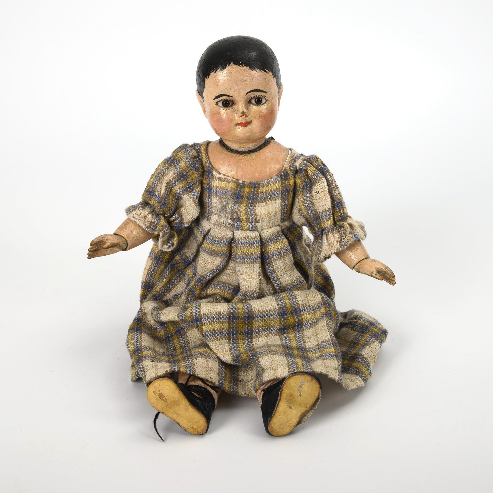 Kurbelkopf mit gemalten Haaren und eingelegten braunen Glasaugen. 13-teiliger Gliederkörper. Kariertes Kleid. Kopf partiell retuschiert, Nasenspitze bestoßen, Körperfarbe berieben, 1 Fuß geklebt, einer bestoßen.