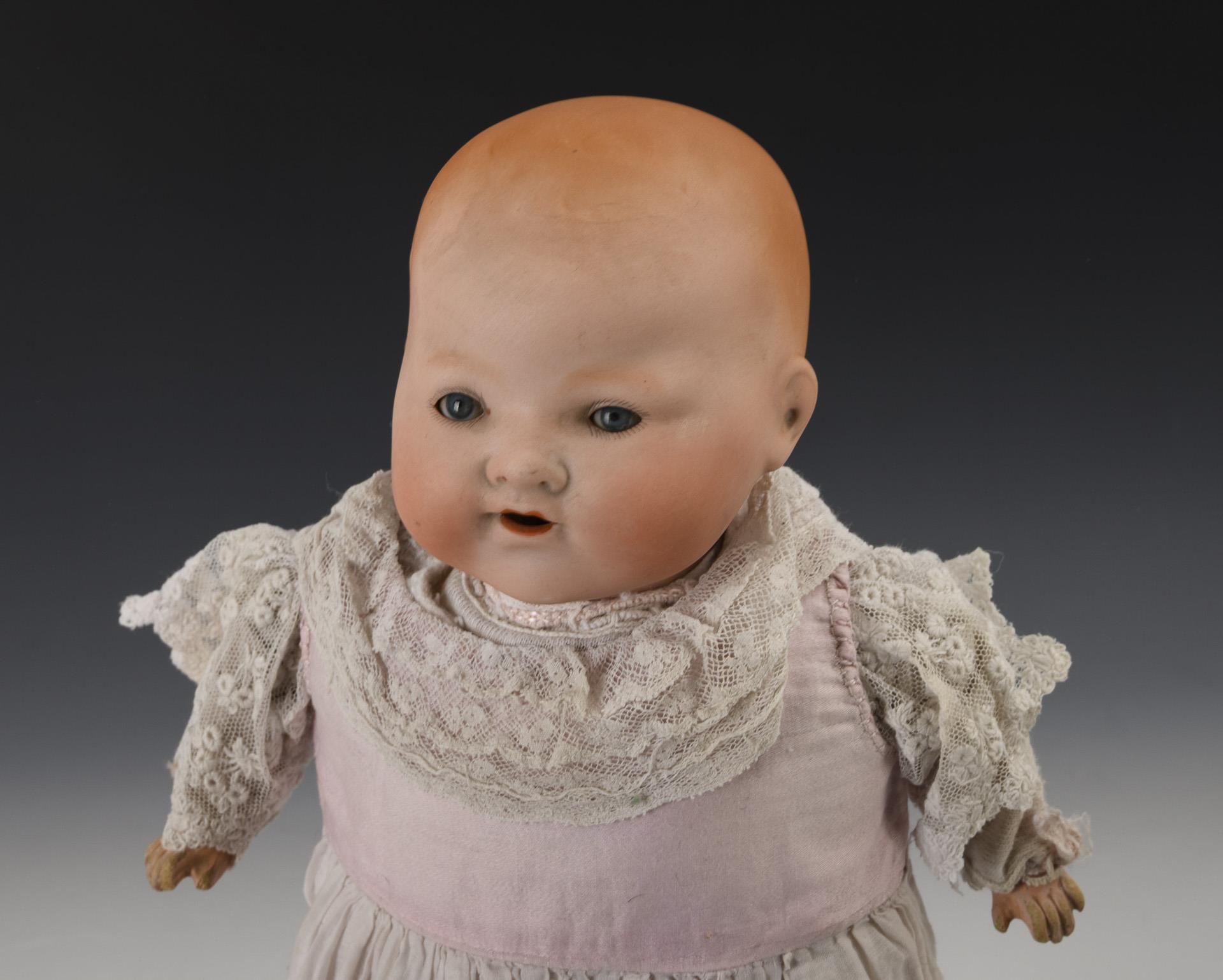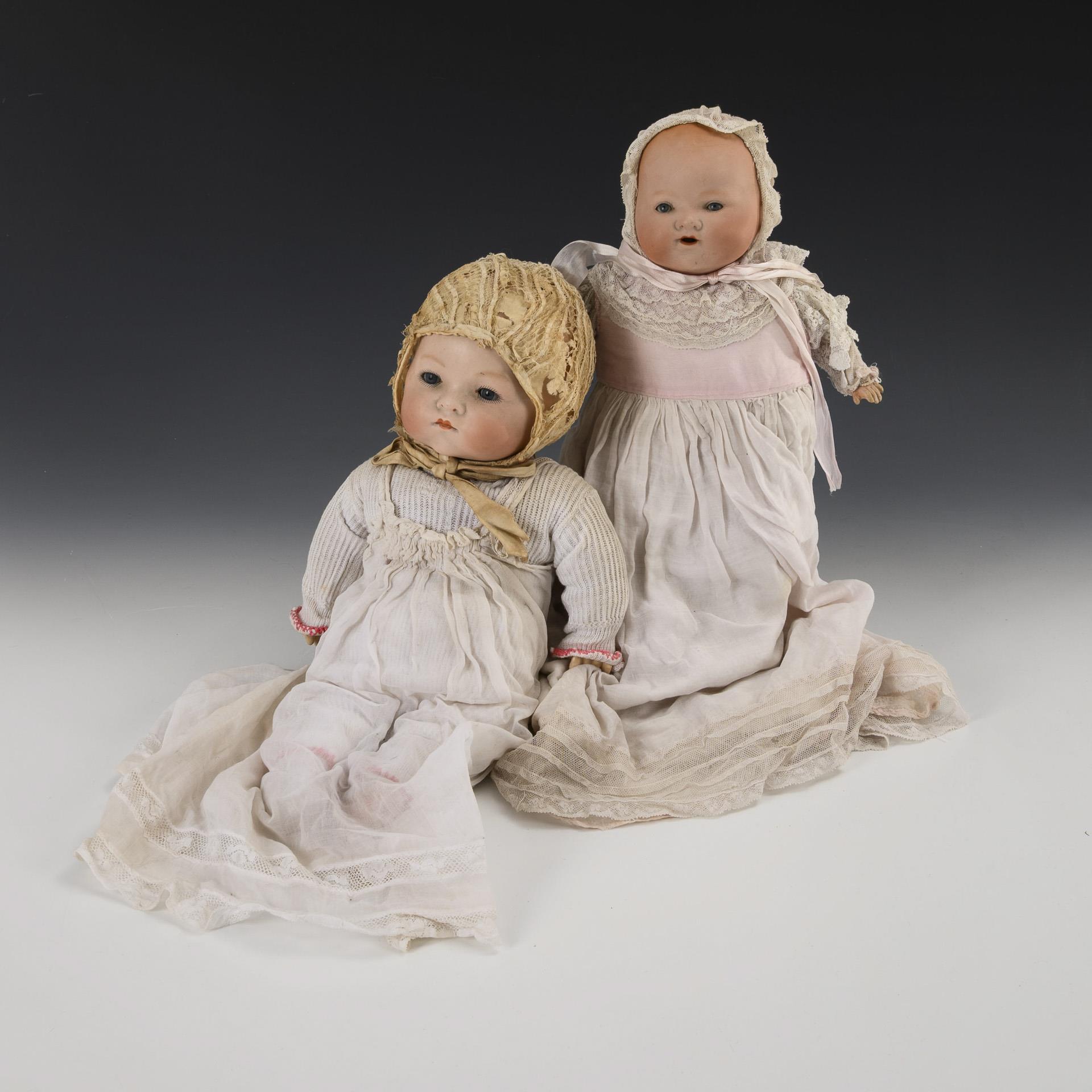 Typ Neugeborenes. Beide mit Einbindekopf, blauen Schlafaugen, braun getöntem Haarboden, Stoffkörper, Massehänden und weißem Taufkleid. Teils mit Altersspuren.
