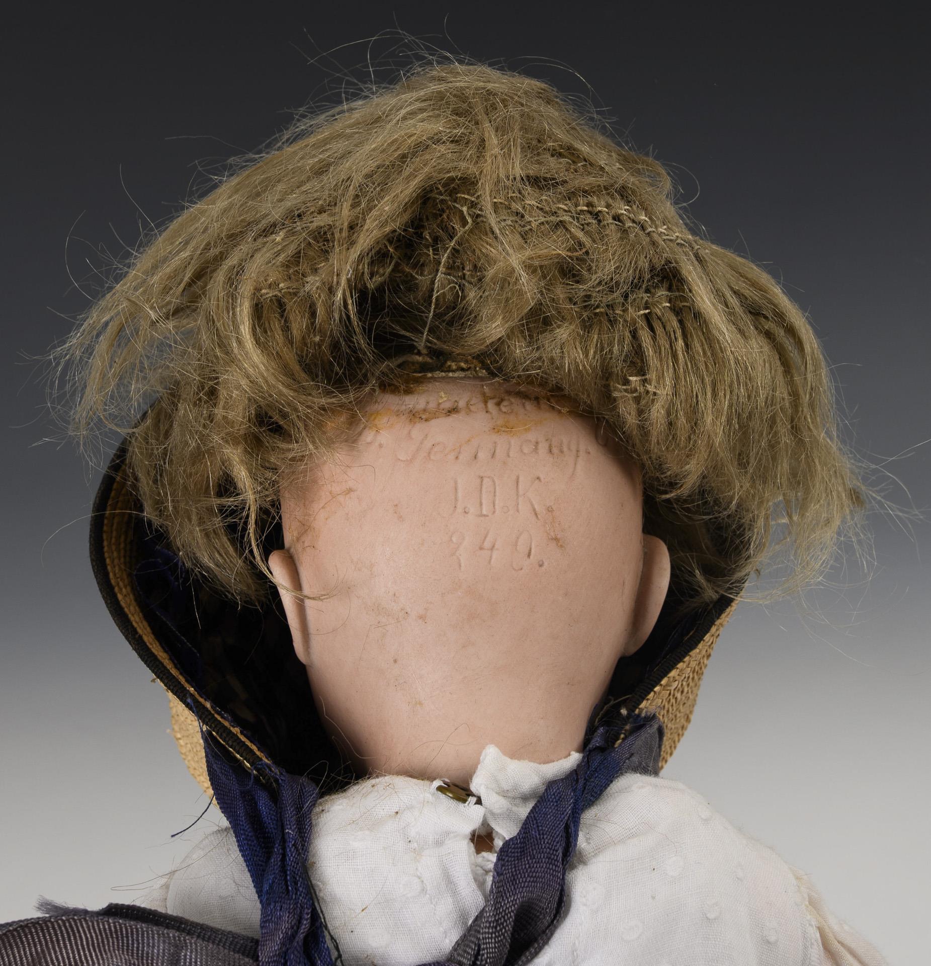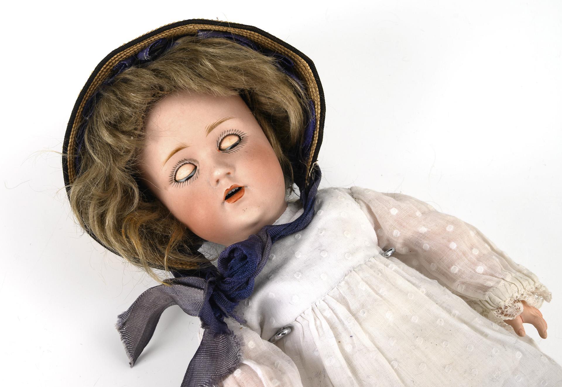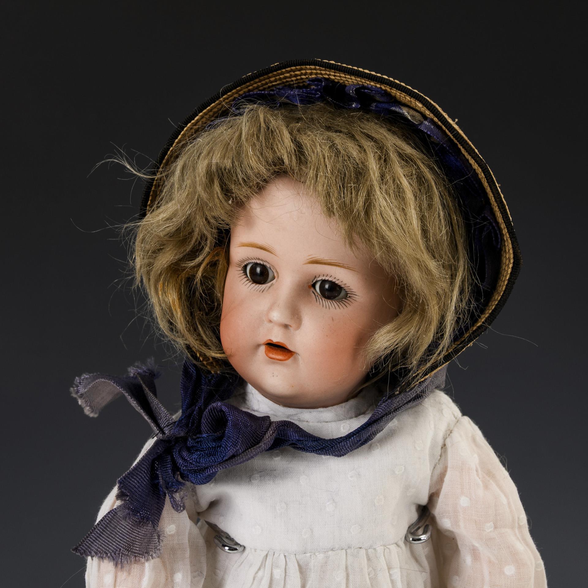 Kurbelkopf, fest vergipster Kopfdeckel, braune Schlafaugen, blonde Mohairperücke. 15-teiliger Gliederkörper. Weißes Kleid, Strohhut. Kopf nicht durchleuchtet: ohne sichtbare Defekte, lediglich 1 Brandriss hinter dem rechten Ohr. Körper übermalt, 1 Schuh fehlt.