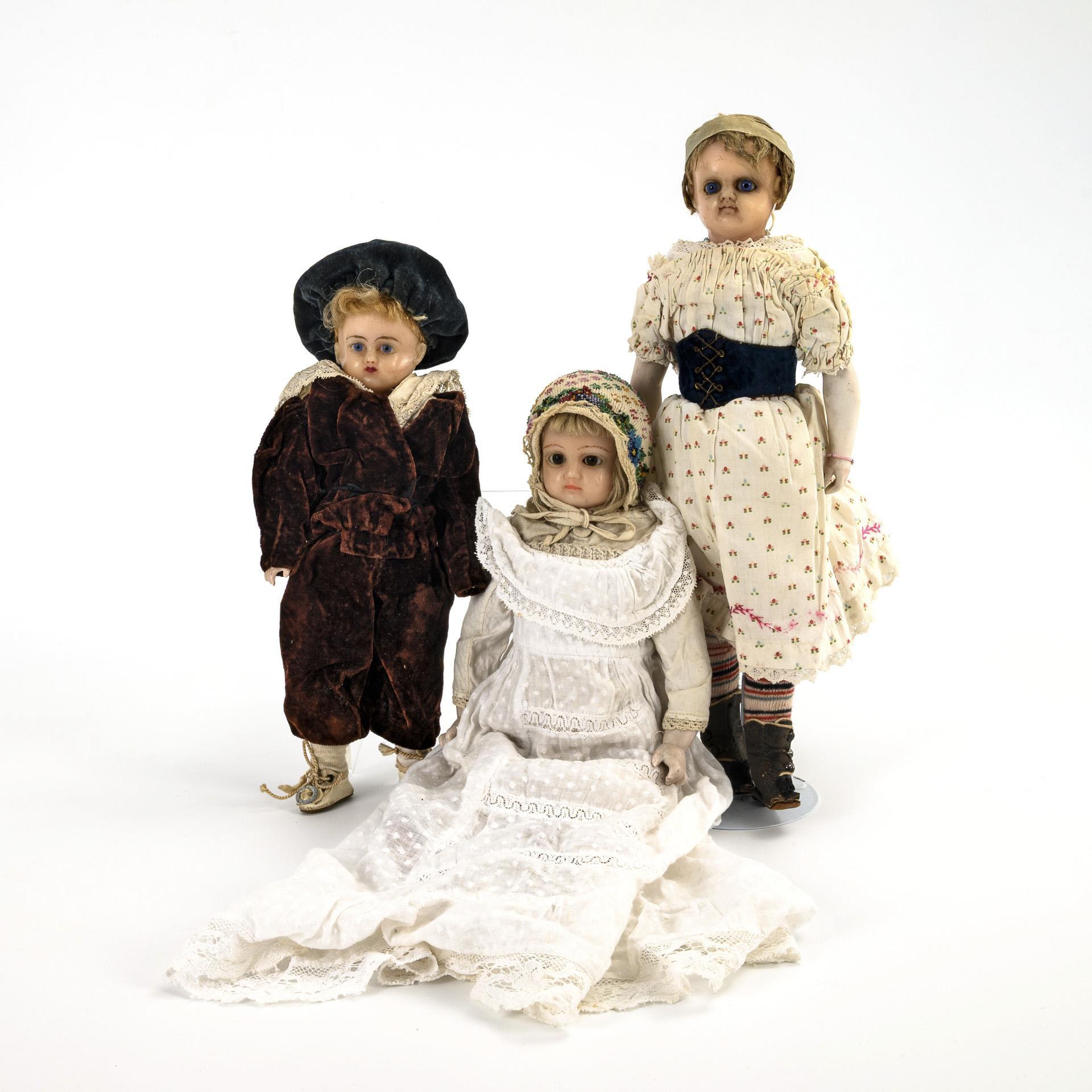 Jeweils mit Brustkopf, Glasaugen, Stoff- bzw. Lederkörper und Unterarmen aus Biskuitporzellan. 2x in hellem Kleid, 1x in braunem Samtanzug. Alters- und Reparaturspuren.