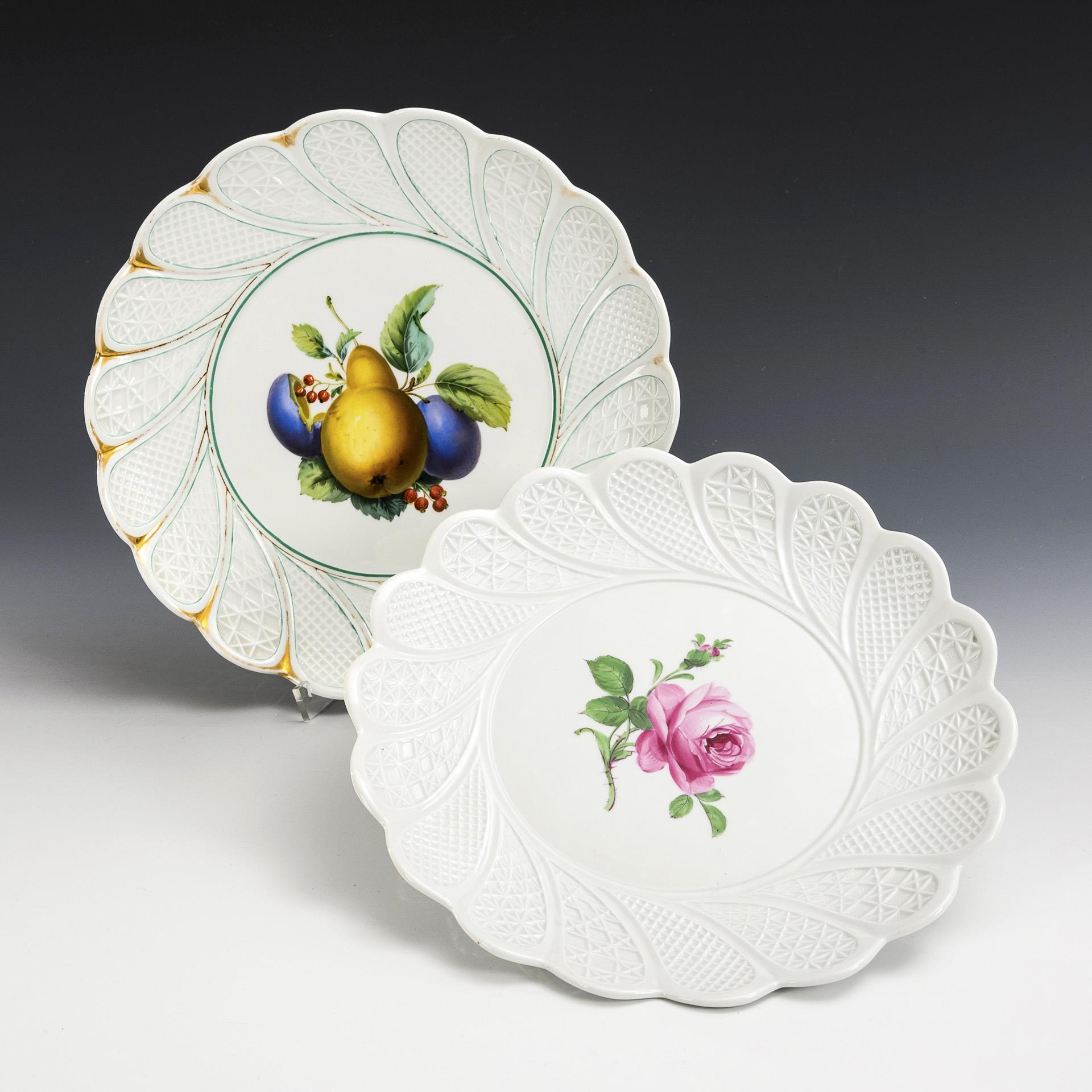 1x mit dem Dekor "Rote Rose". / 1x mit Fruchtmalerei. Gold berieben.
