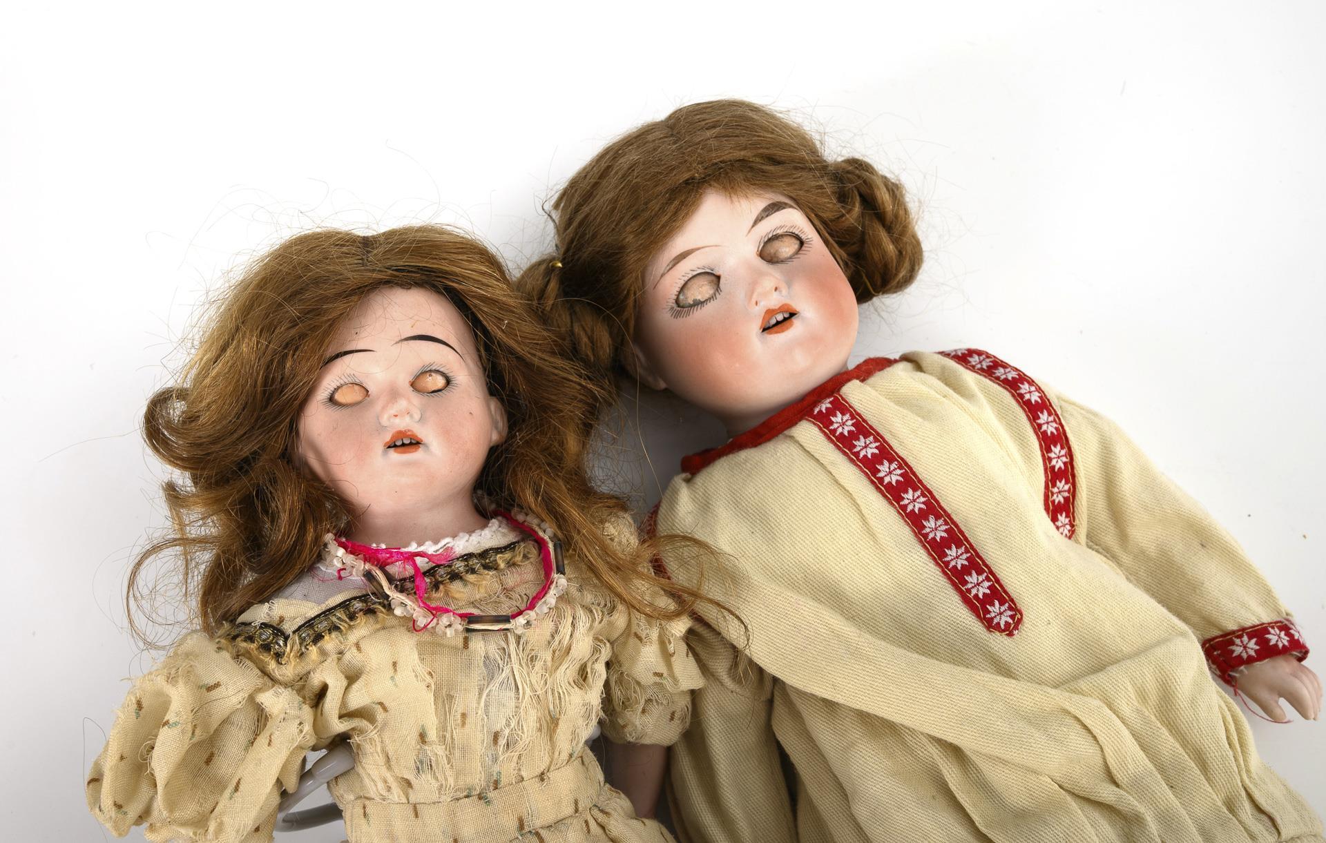 Beide mit Brustkopf, blauen Schlafaugen, blonder Echthaarperücke und Lederkörper mit Biskuitarmen. 1x AM 370 in weißem Kleid mit roten Borten. 1x AM 3200 in zerschlissenem, langen Kleid. Altersspuren. Köpfe durchleuchtet: ohne Defekte.