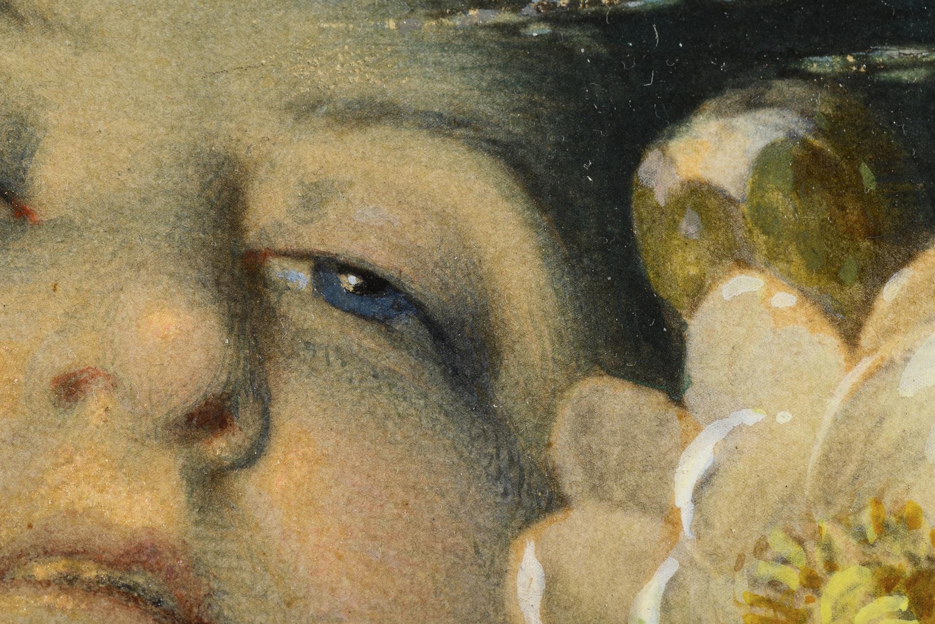 In rund gemaltem Passepartoutausschnitt Bildnis der literarischen Figur aus Shakespeares Hamlet unter der Wasseroberfläche eines Seerosenteiches.