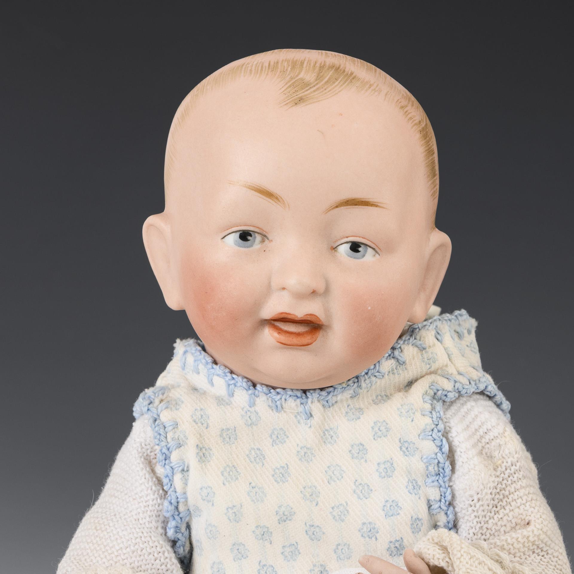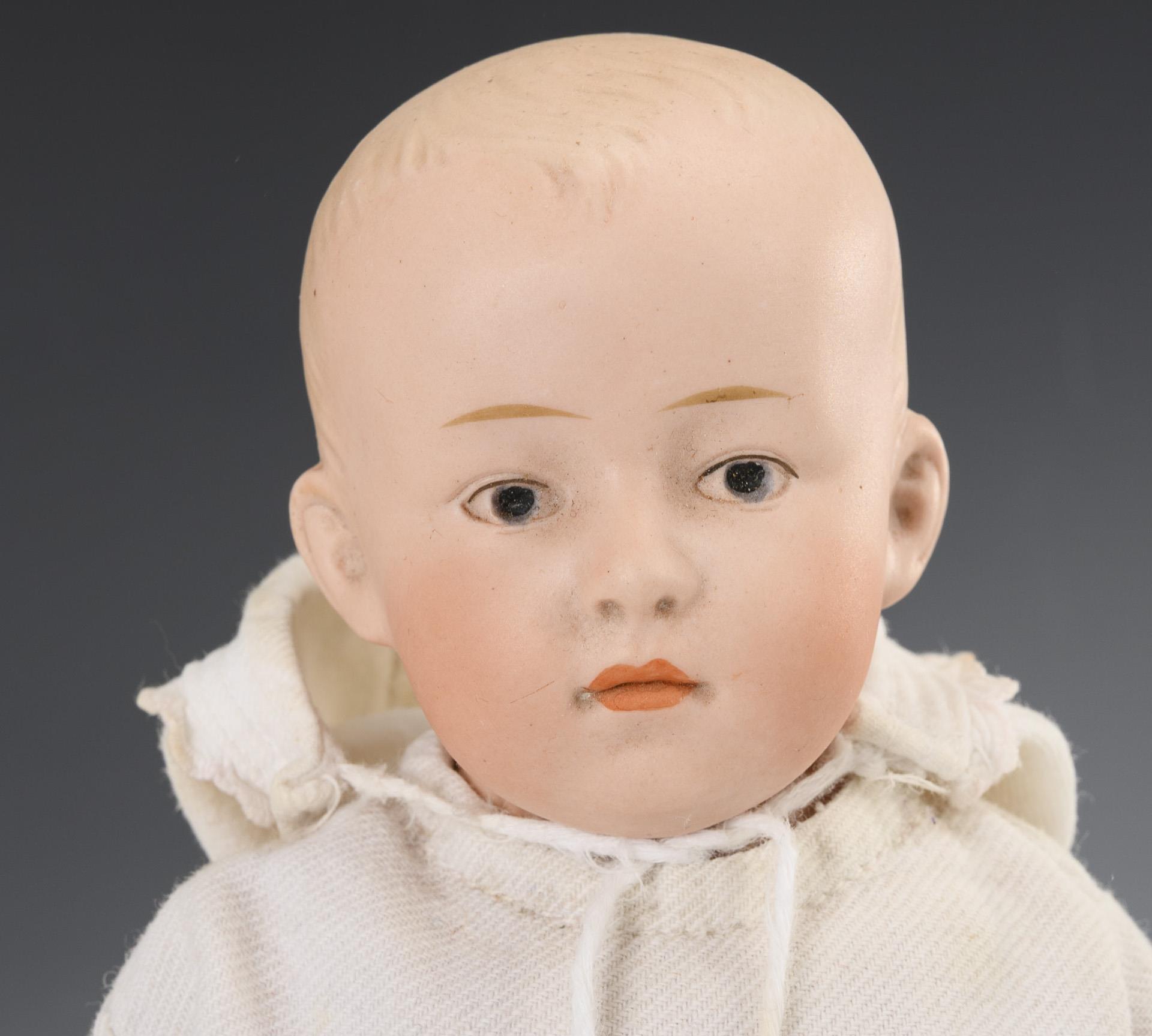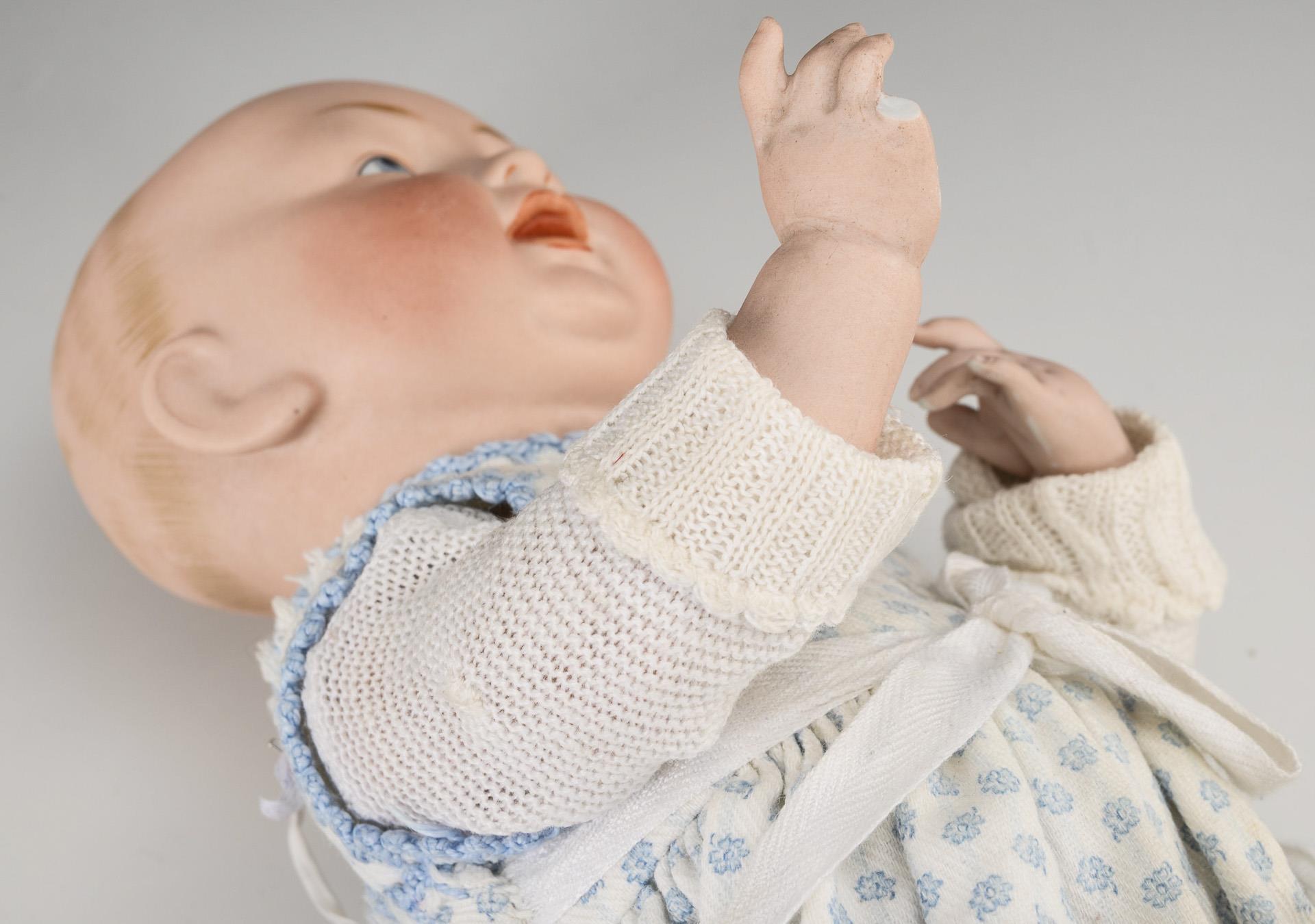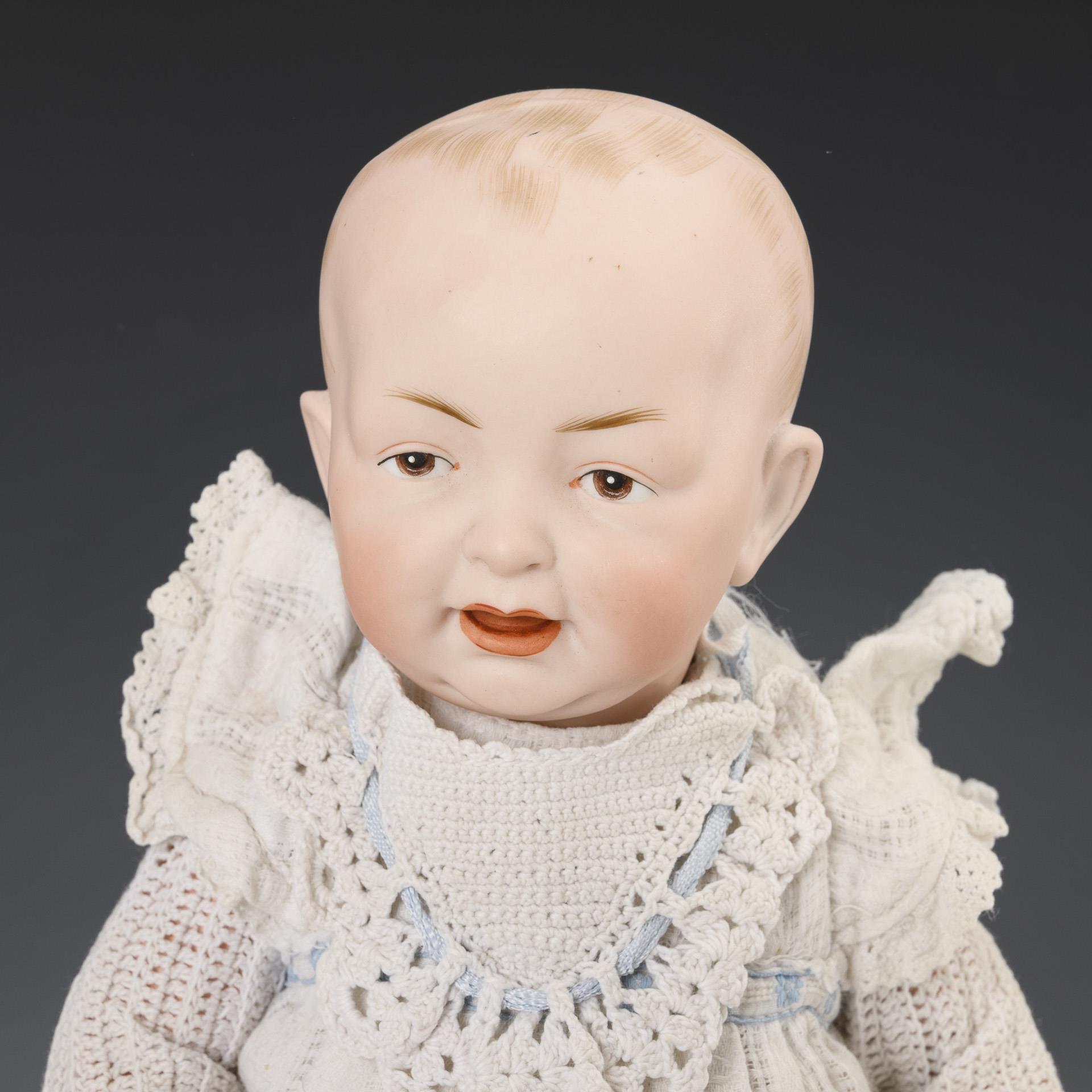 Alle mit Vollkopf, gemalten Augen, leicht modellierten Babyhaaren und heller Kleidung. Heubach-Junge mit Brustkopf und Stoffkörper, L 36 cm. / Charakterbaby Hertel, Schwab & Co mit offen/geschlossenem Mund und 5-teiligem Massekörper, L 34 cm. / Ganzbiskuit-Baby mit defektem Körper, L 30 cm. Mit Defekten.