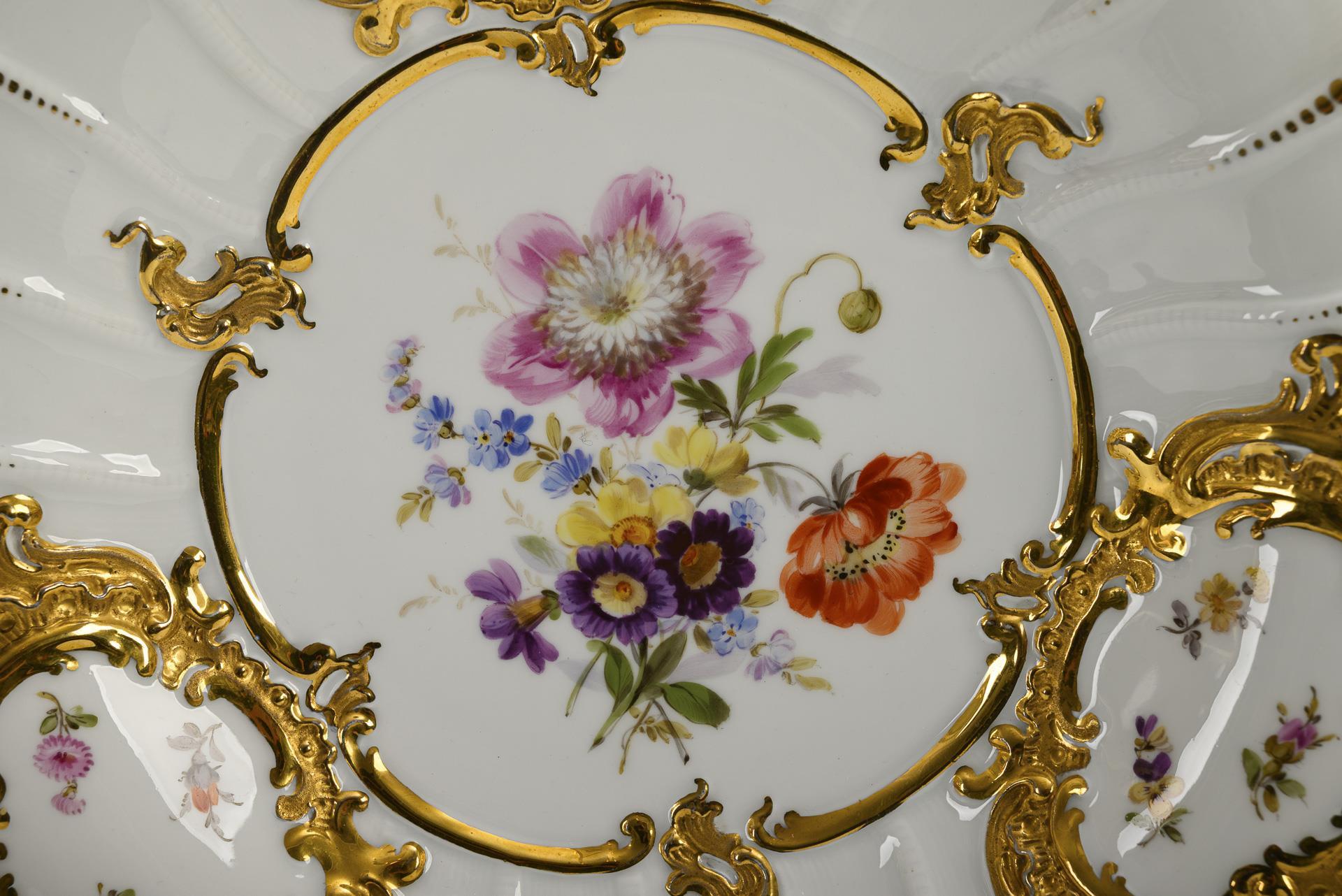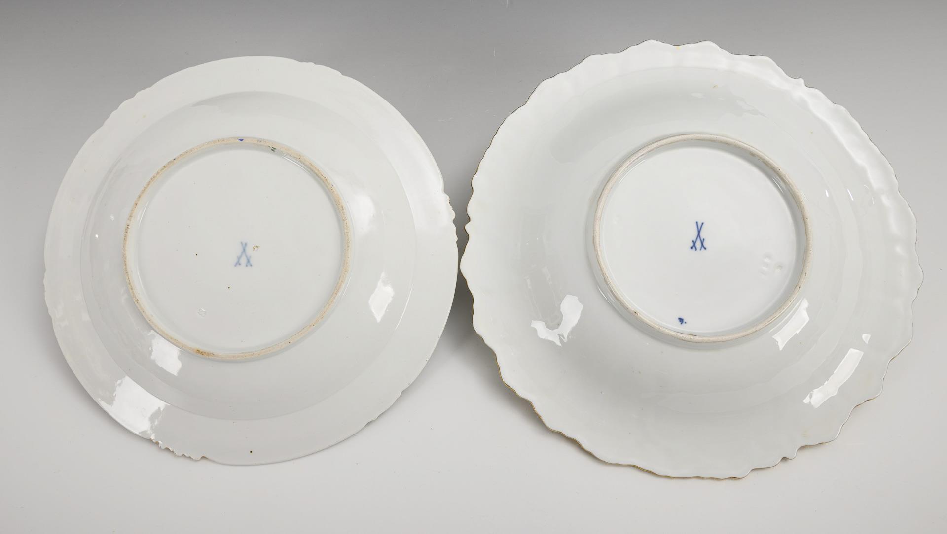 1x Knaufschwerter, ab 1850-1918, 1. Wahl: Schale mit muschelreliefierter Fahne, drei Rocailleschildern, polychromer Blumenmalerei und Goldstaffage (Ø 30 cm). / 1x Schwertermarke, um 1850, 1. Wahl: blüten- und fruchtreliefierter Teller mit blauer Staffage und Goldstaffage (Ø 27,5 cm). 1x Gold berieben.