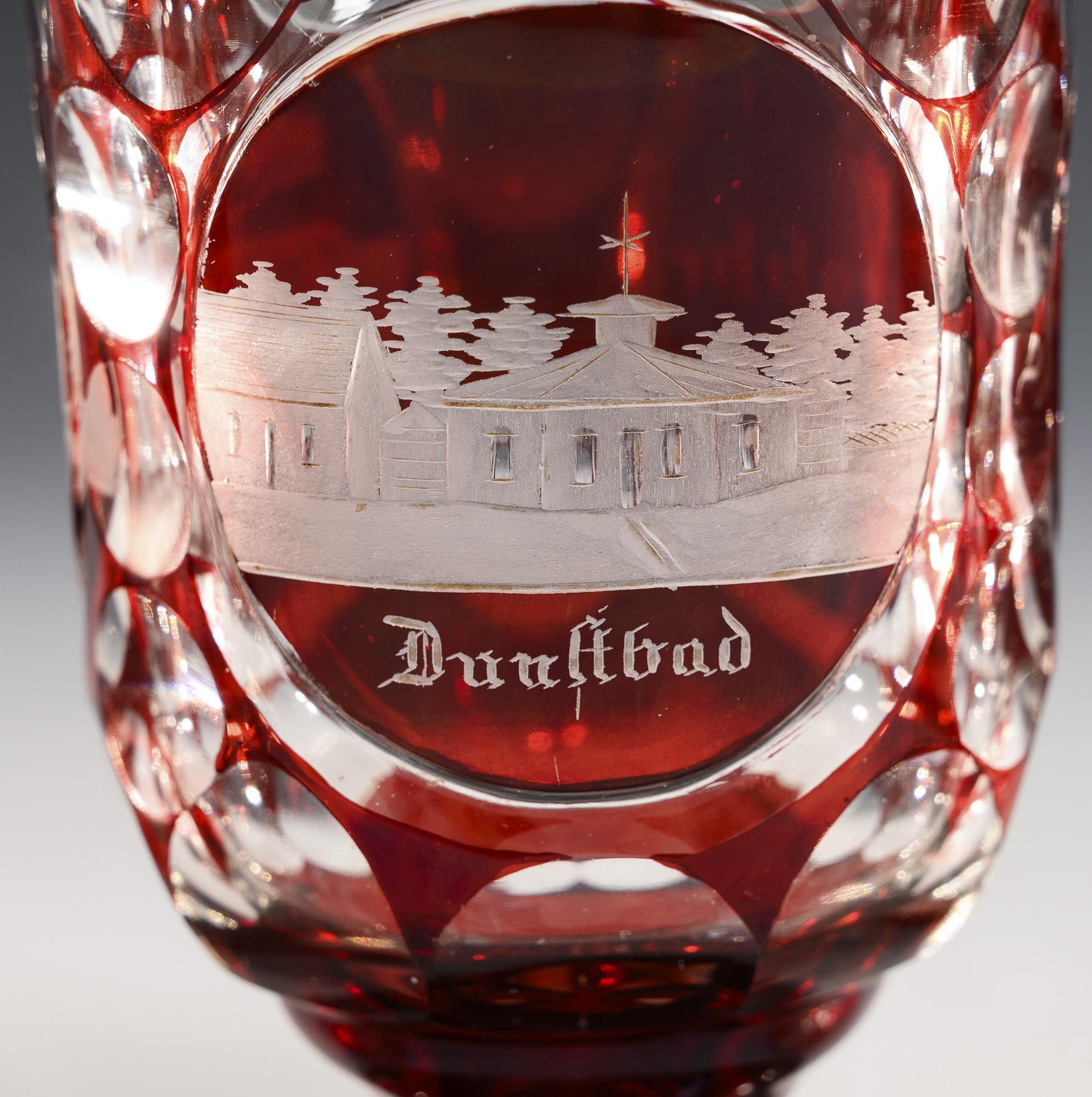 2 Ansichtengläser (Oybin, Oeynhausen) und 1 Fußbecher mit Facetten- und Linsenschliff. 1x Bestoßungen am Fußrand.