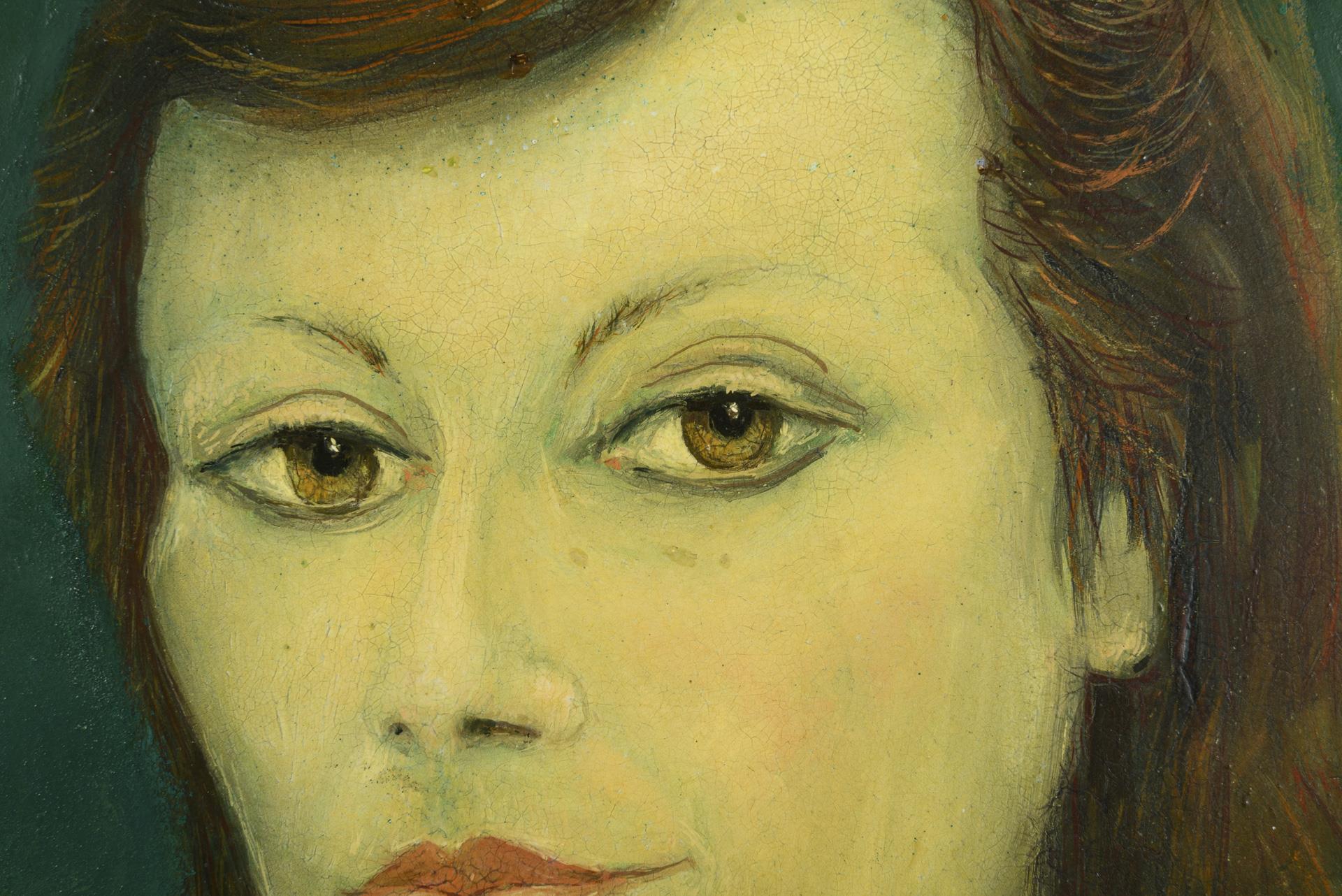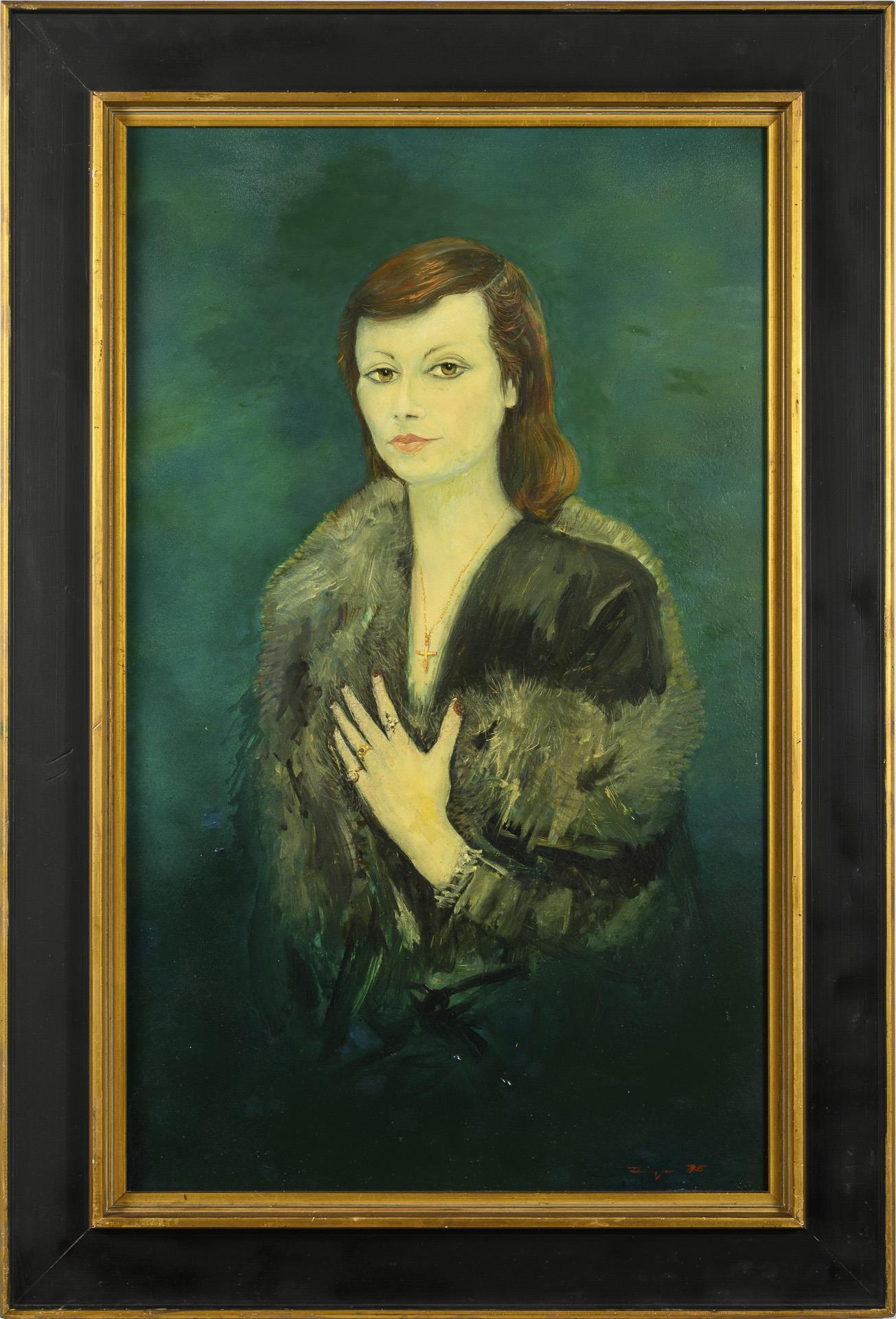 Porträt einer jungen Frau im Pelzmantel mit goldenen Ringen und Kruzifixanhänger. Retuschiert.