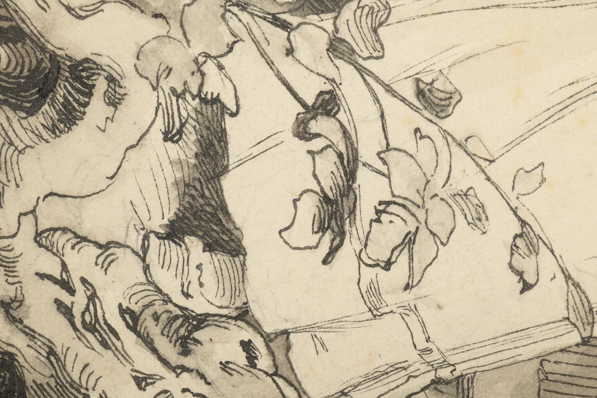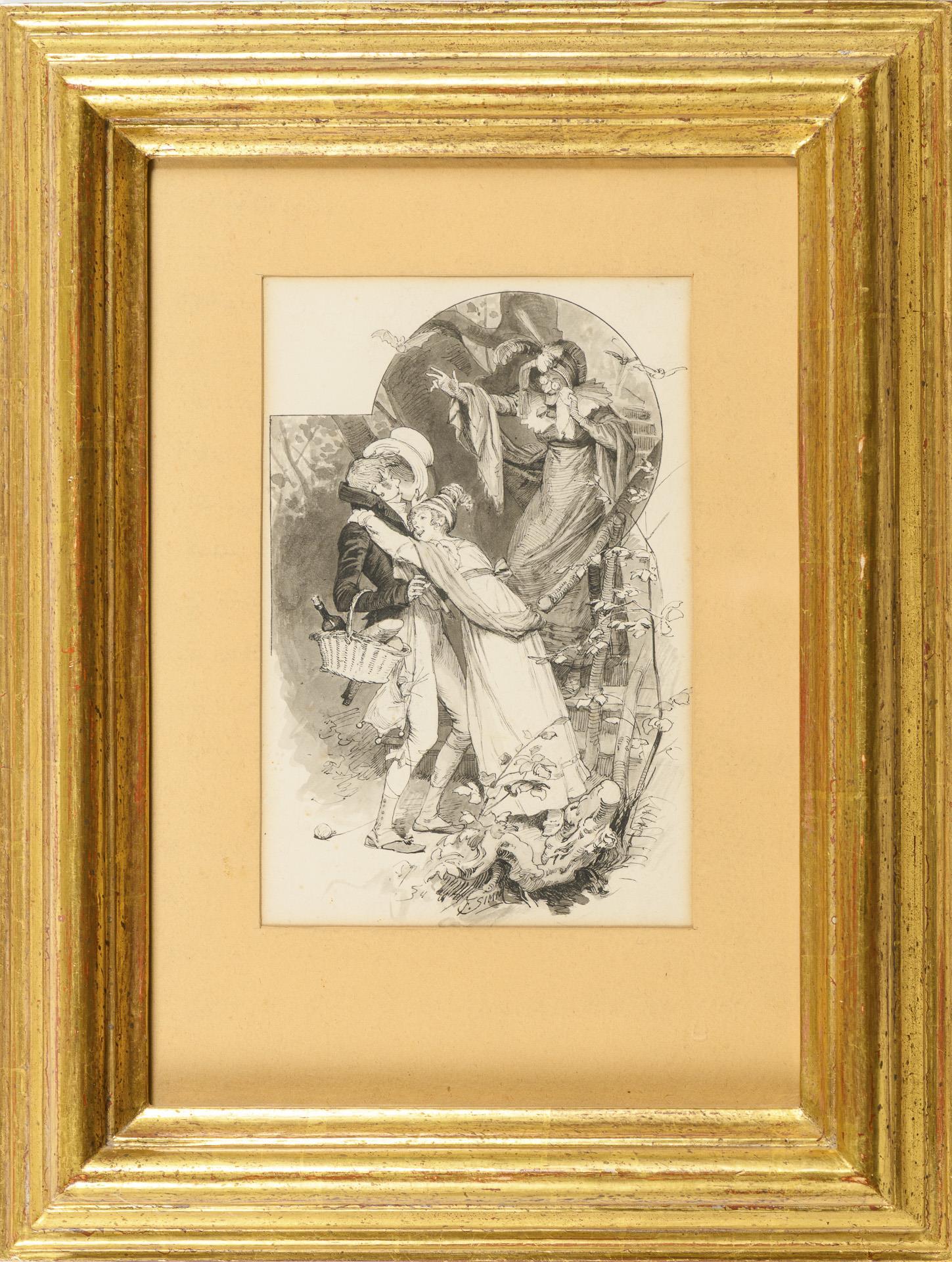 Genreszene mit jungem Paar und winkendem Mütterchen.