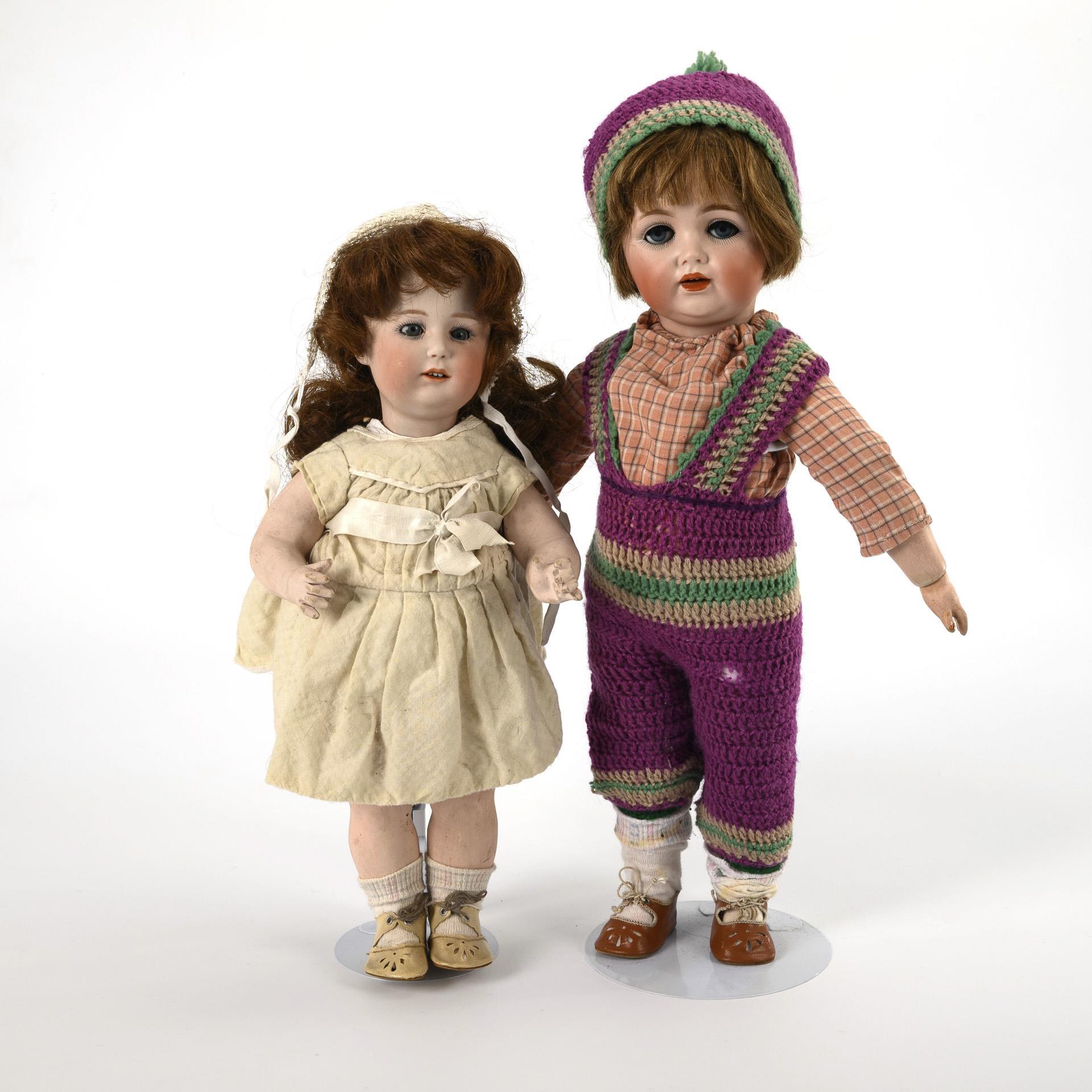 Beide mit Kurbelkopf, blauen Schlafaugen und brauner Perücke. Heubach-Mädchen mit 5-teiligem Stehkörper aus Masse, weißem Kleid und Wachstuchschuhen. Harrisse am Hinterkopf. L 39 cm. / Kestner-Puppe (JDK 260) mit 15-teiligem Toddlerkörper mit Stimme, lila Strickkleidung und braunen Wachstuchschuhen. Kopf ohne Risse, Augen wohl jünger ergänzt. L 46 cm. Teils Altersspuren.