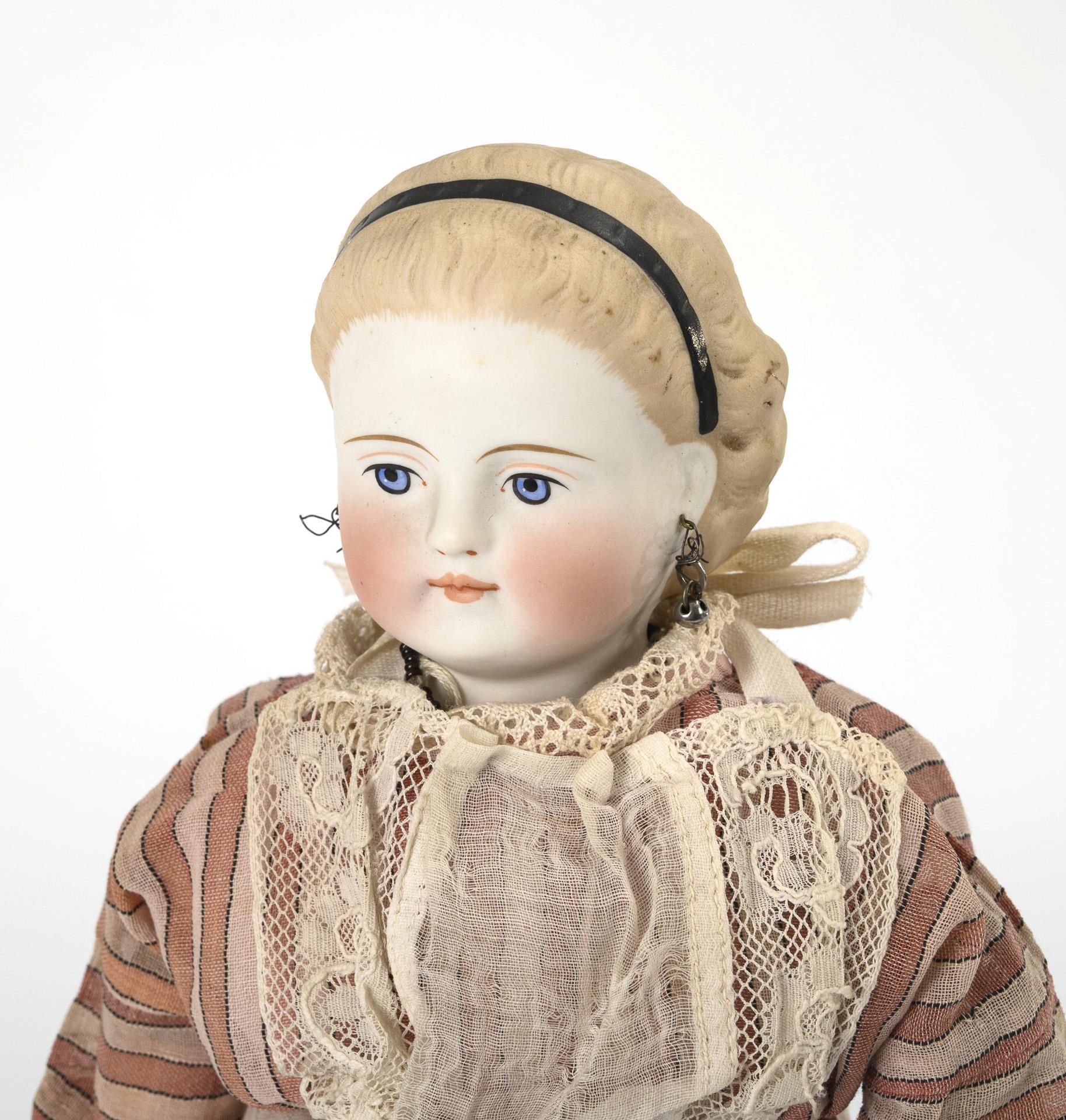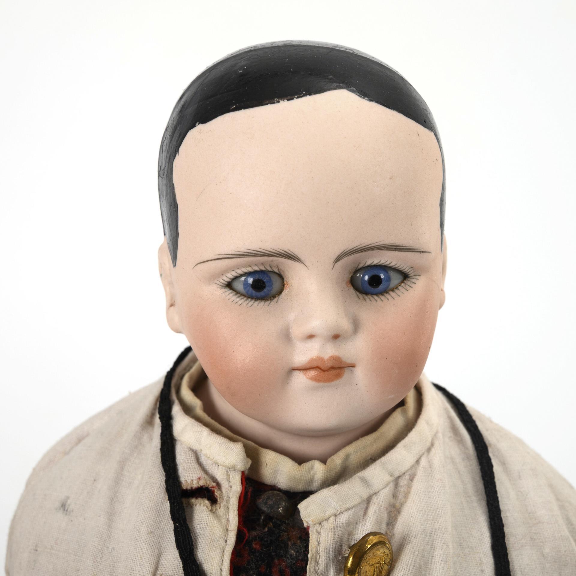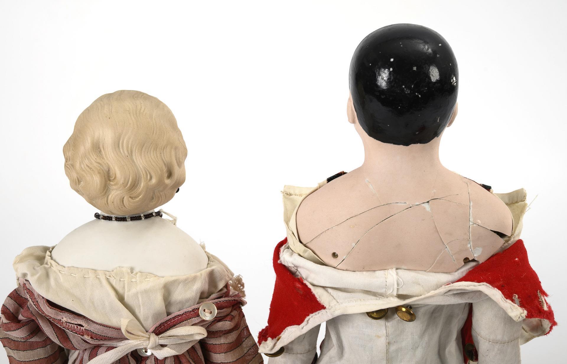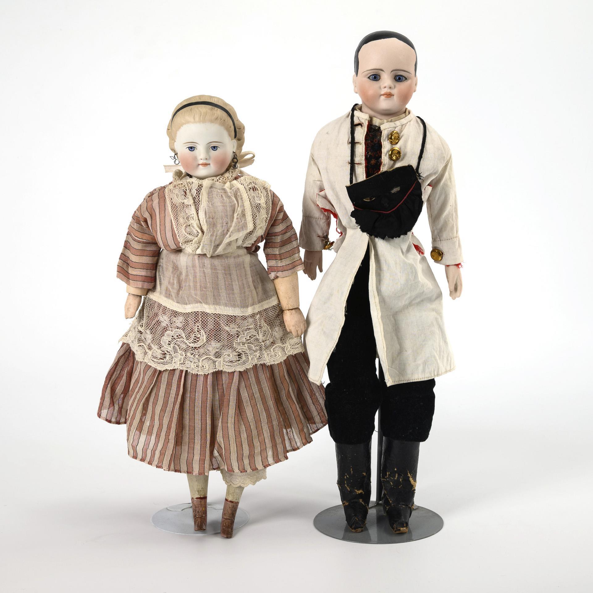 1x als Herr bekleidet, mit festen blauen Glasaugen, gemalten schwarzen Haaren, Stoffkörper und Biskuitarmen, L 42 cm. 1x als Dienstmädchen bekleidet, mit gemalten blauen Augen, modellierten blonden Haaren, Stoffkörper und Holzgliedern, L 38 cm. Altersspuren, kleine Defekte.