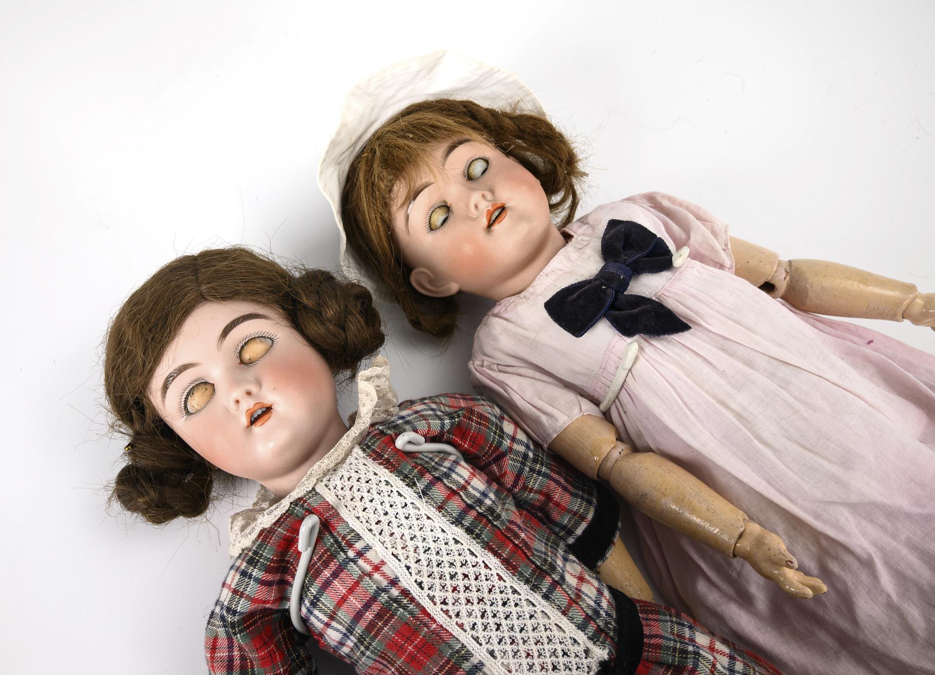 Beide mit Kurbelkopf, braunen Schlafaugen, brauner Perücke und mehrteiligem Gliederkörper. 1x F & W Goebel, für Max Handwerck (Kopfmarke 283) in rosa Kleid. Kopf mit Perückenpull, L 52 cm. / 1x Heinrich Handwerck (Kopfmarke 109) in kariertem Kleid. Kopf locker, 1 minimaler Chip an der Halskurbel, L 58 cm. Köpfe durchleuchtet: ohne Risse.