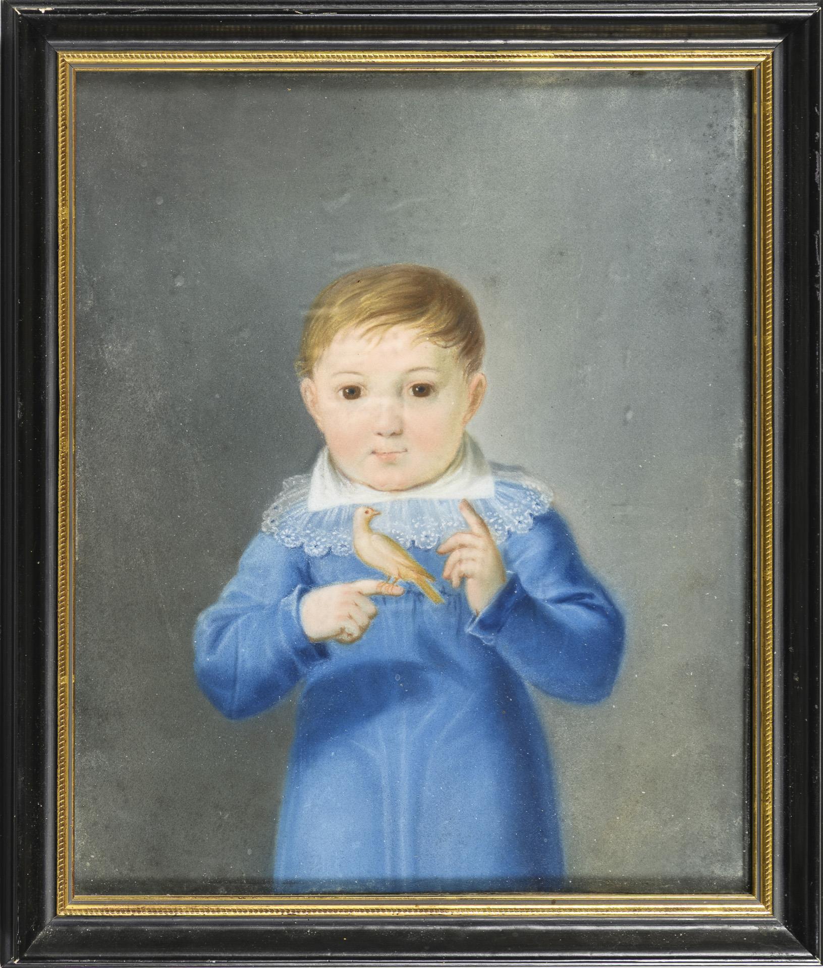 Porträt eines Jungen in hellblauer Kleidung mit Spitzekragen und dem Vogel auf dem Finger.