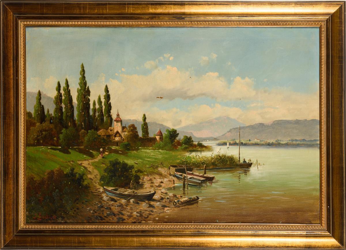 Boote am Ufer nahe einer Kirche mit Blick über den See zur kleinen Insel, bei welcher es sich um die Fraueninsel handeln könnte. Ein Defekt.