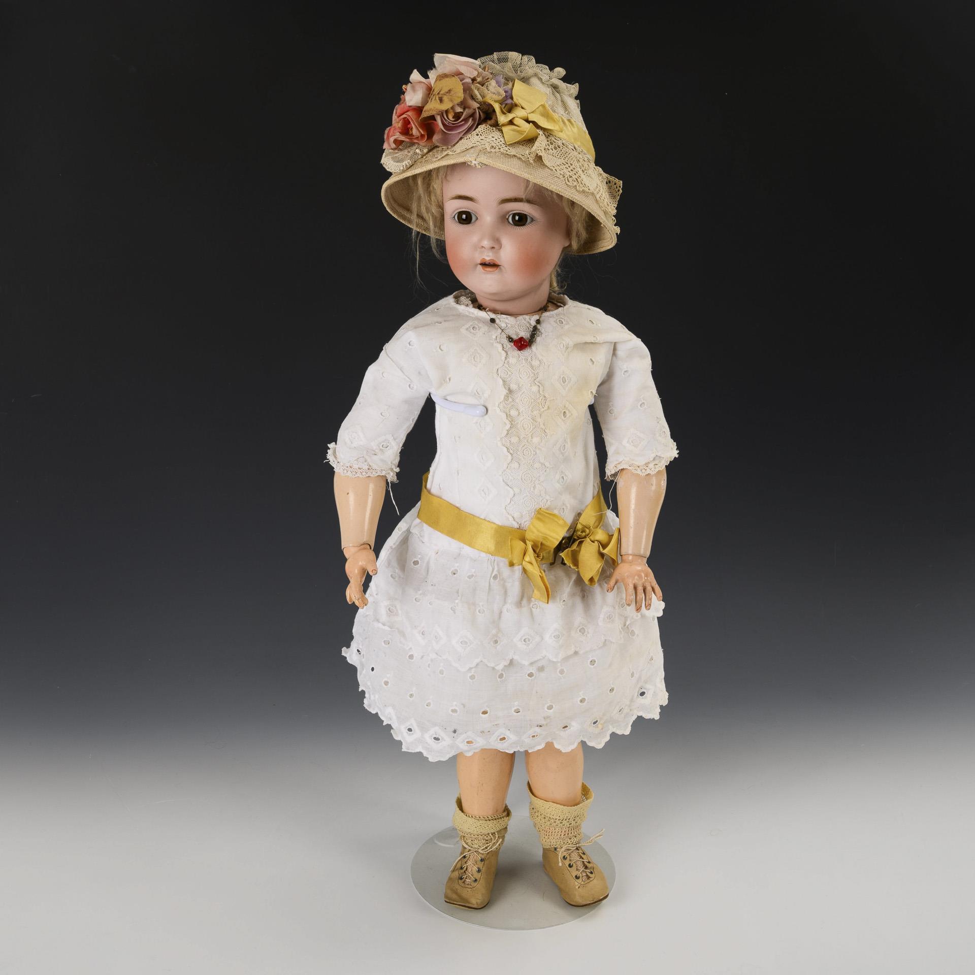 Kurbelkopf, fest vergipster Deckel, braune Glasaugen, defekte blonde Mohairperücke. 17-teiliger Gliederkörper. Weißes Kleid, Hut mit Blumenschmuck, cremefarbene Wachstuchschuhe. Kopf nicht durchleuchtet: keine Defekte sichtbar. Körper teils übermalt, kleiner Finger links repariert.