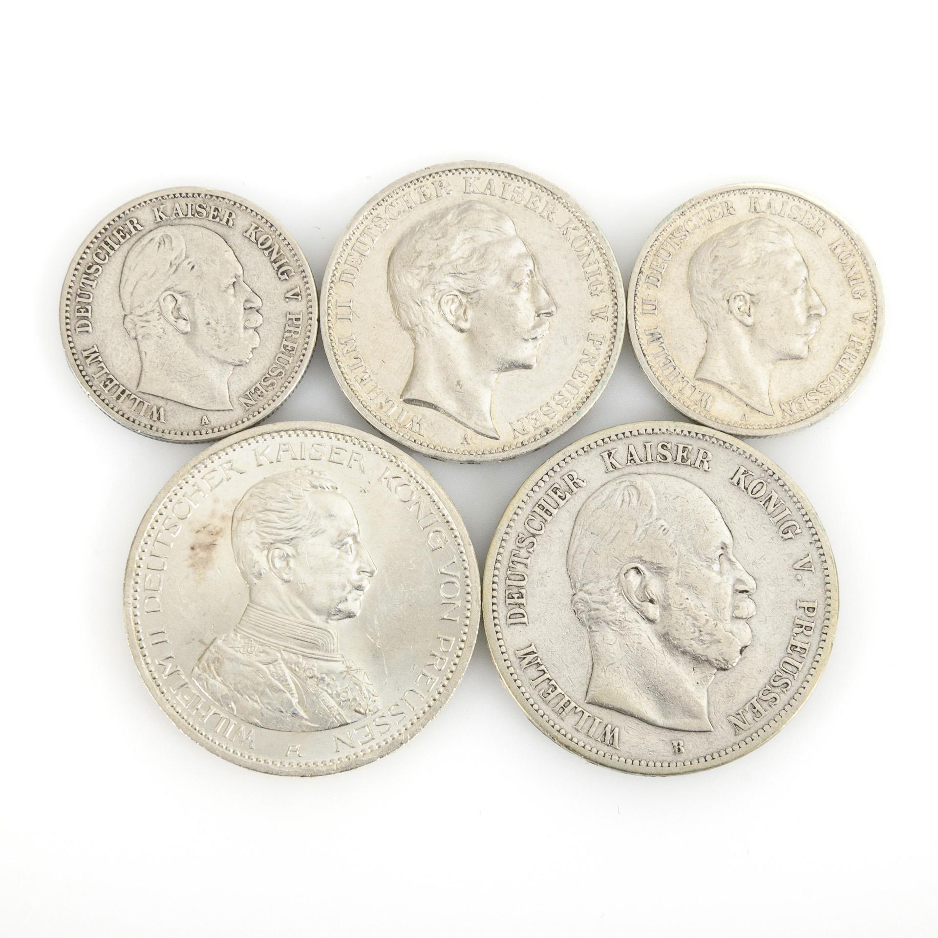 "Wilhelm Deutscher Kaiser König v. Preussen": 5 Mark von 1876, Münzort B; 2 Mark von 1877, Münzort A. / "Wilhelm II. Deutscher Kaiser König von Preussen": 5 Mark von 1914, in Uniform; 3 Mark von 1908; 2 Mark von 1902, alle Münzort A. Zustand: sehr schön.
