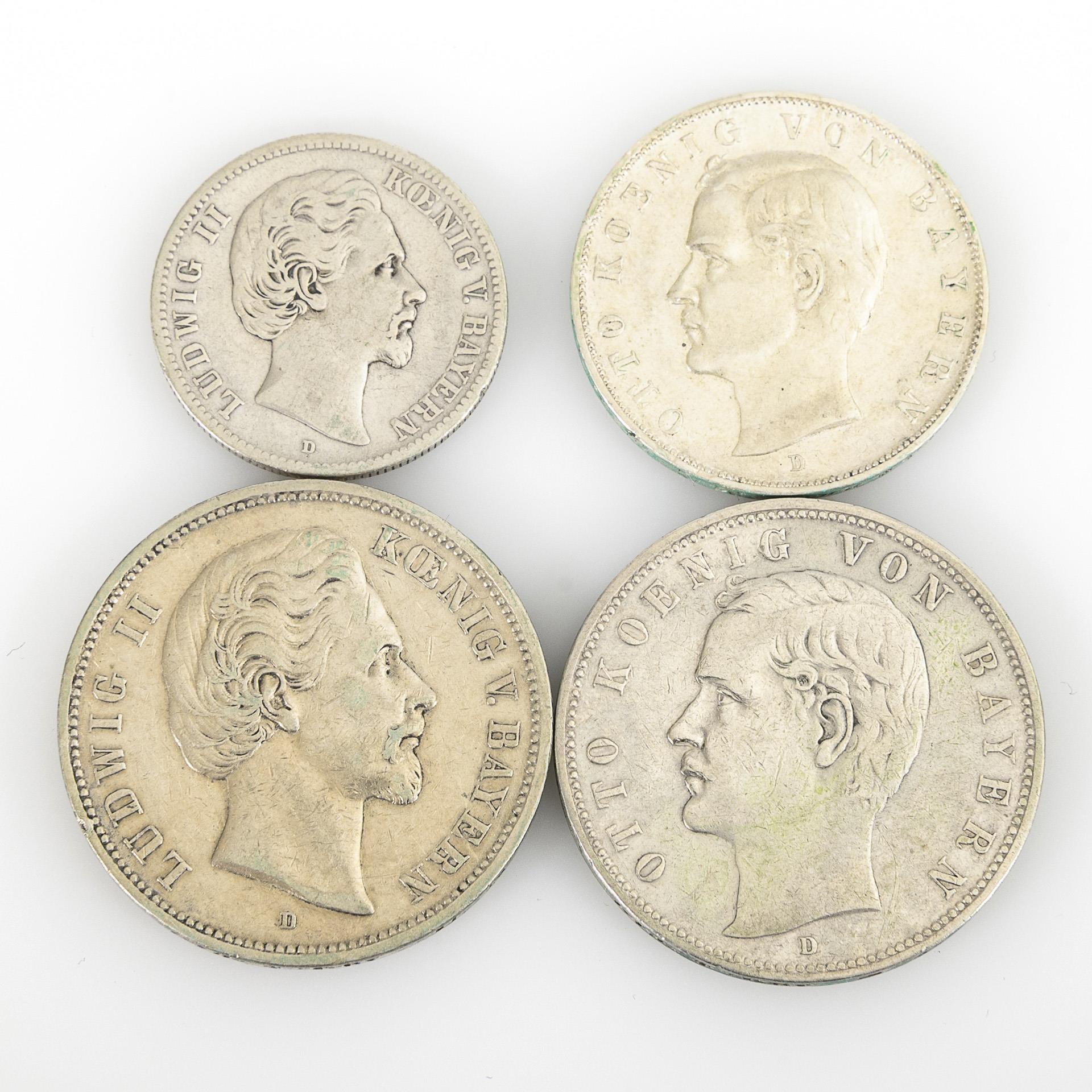 "Ludwig II. Koenig v. Bayern": 5 Mark von 1874; 2 Mark von 1876. / "Otto Koenig von Bayern": 5 Mark von 1902; 3 Mark von 1913. Alle Münzort D. Zustand: sehr schön, 2 Mark Münze: schön.