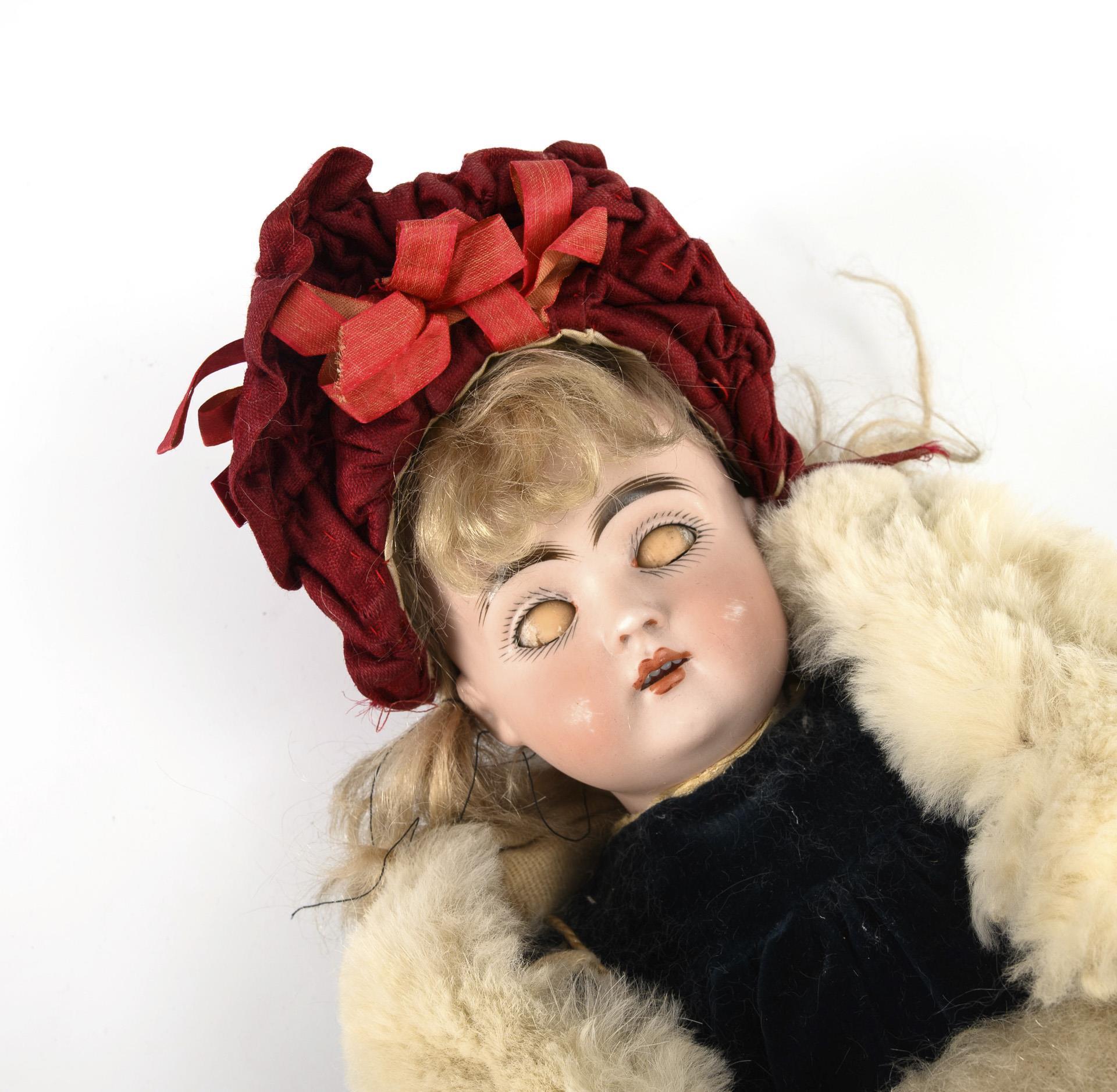 Kurbelkopf mit fest vergipstem Kopfdeckel, braune Schlafaugen, blonde Mohairperücke mit Defekten. 15-teiliger Gliederkörper. Dunkelblaues Samtkleid, weiße Fellstola, weißer Mohair-Muff, braune Lederschuhe, roter Schutenhut. Haarriss am Hinterkopf, Wangen berieben.