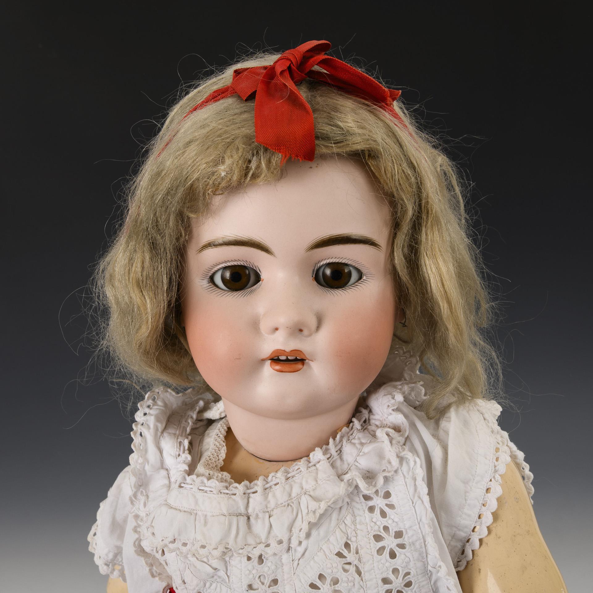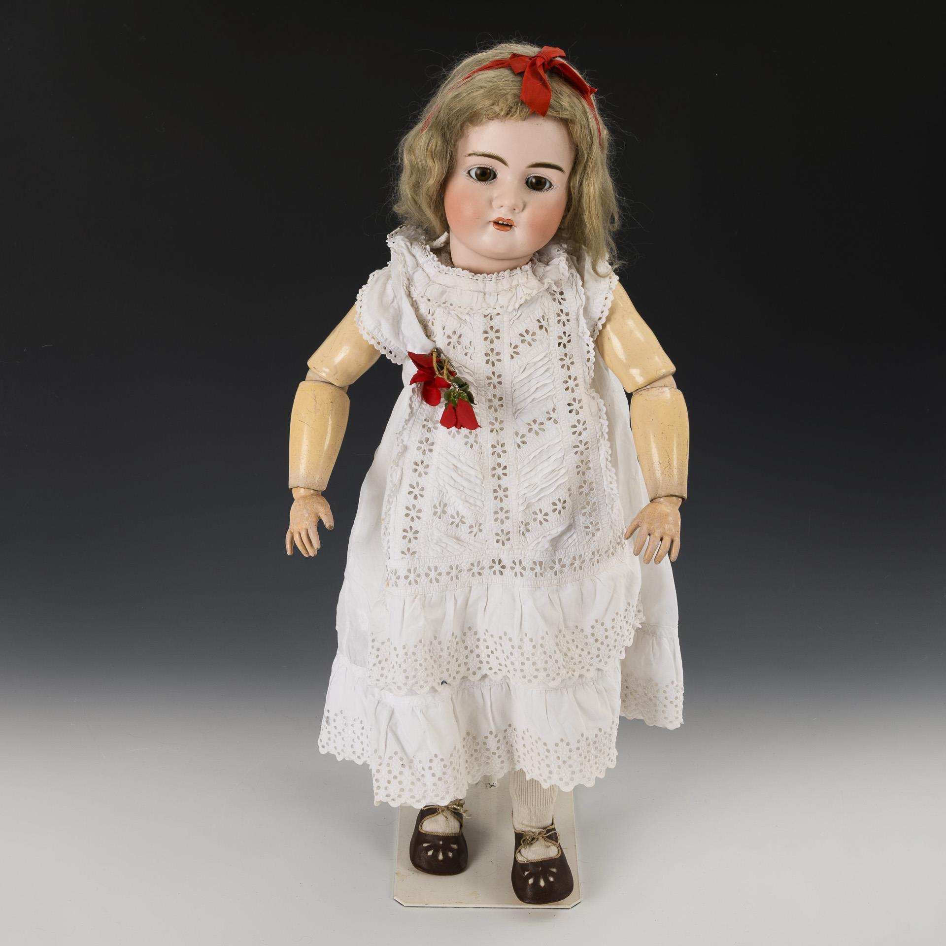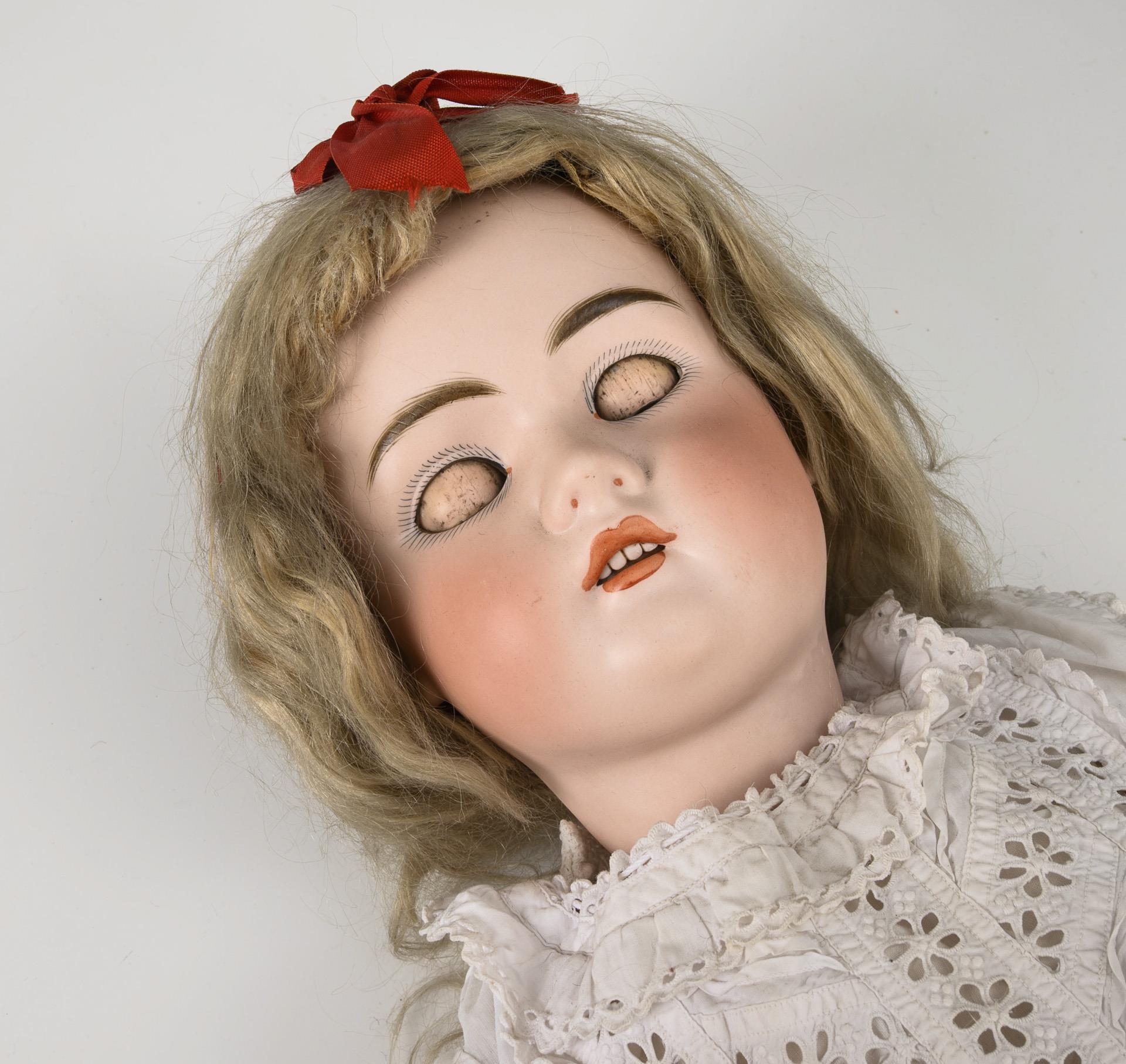 Kurbelkopf, braune Schlafaugen, Ohrlöcher, blonde Mohairperücke. 17-teiliger Gliederkörper. Weißes Kleid mit Lochstickerei, braune Wachstuchschuhe. Kopf durchleuchtet: ohne Defekte. Körper mit kleinen Retuschen.