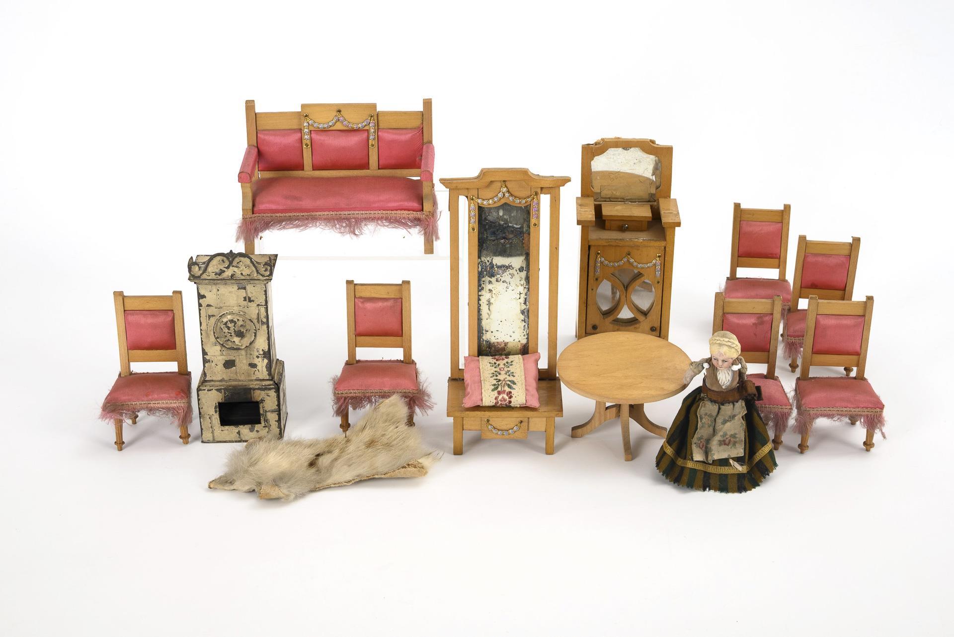 Schränkchen mit Spiegelaufsatz, großer Konsolenspiegel, gepolsterte Sitzbank, runder Tisch mit 6 Stühlen. Dazu weißer Blechofen, weißes "Eisbären"-Fell und defektes Püppchen. Meist leichte Altersspuren, Ofen mit starken Lackdefekten.