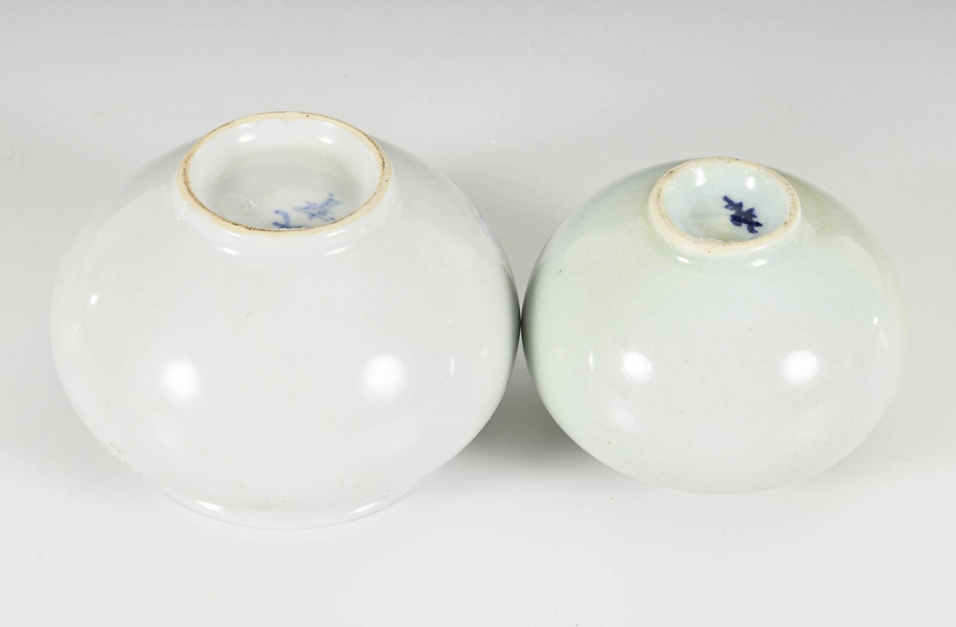 Schalenartige Vase mit locker gemalten Krabben in Unterglasurblau. H 8 cm. / Kleine Seladonvase mit feinem Krakelee. H 8 cm.