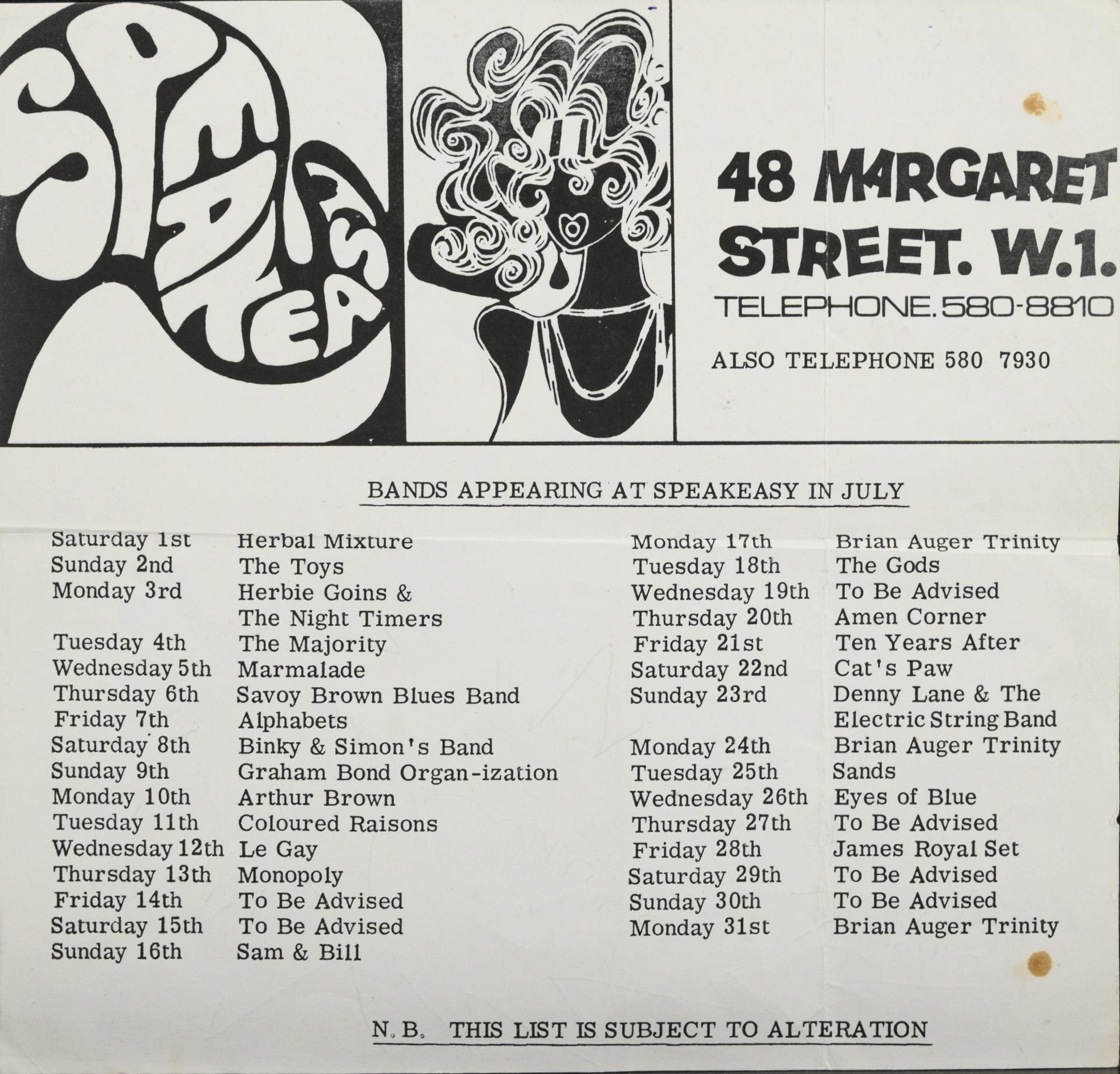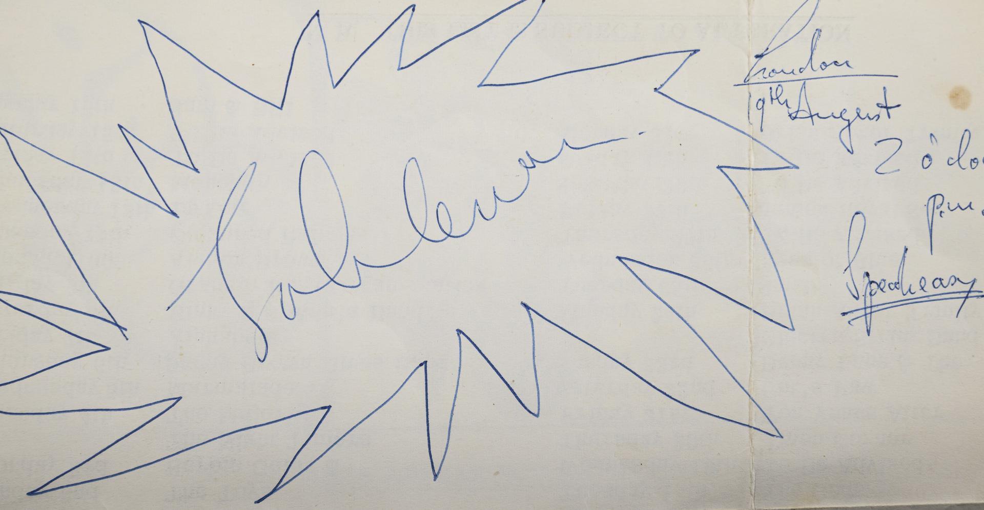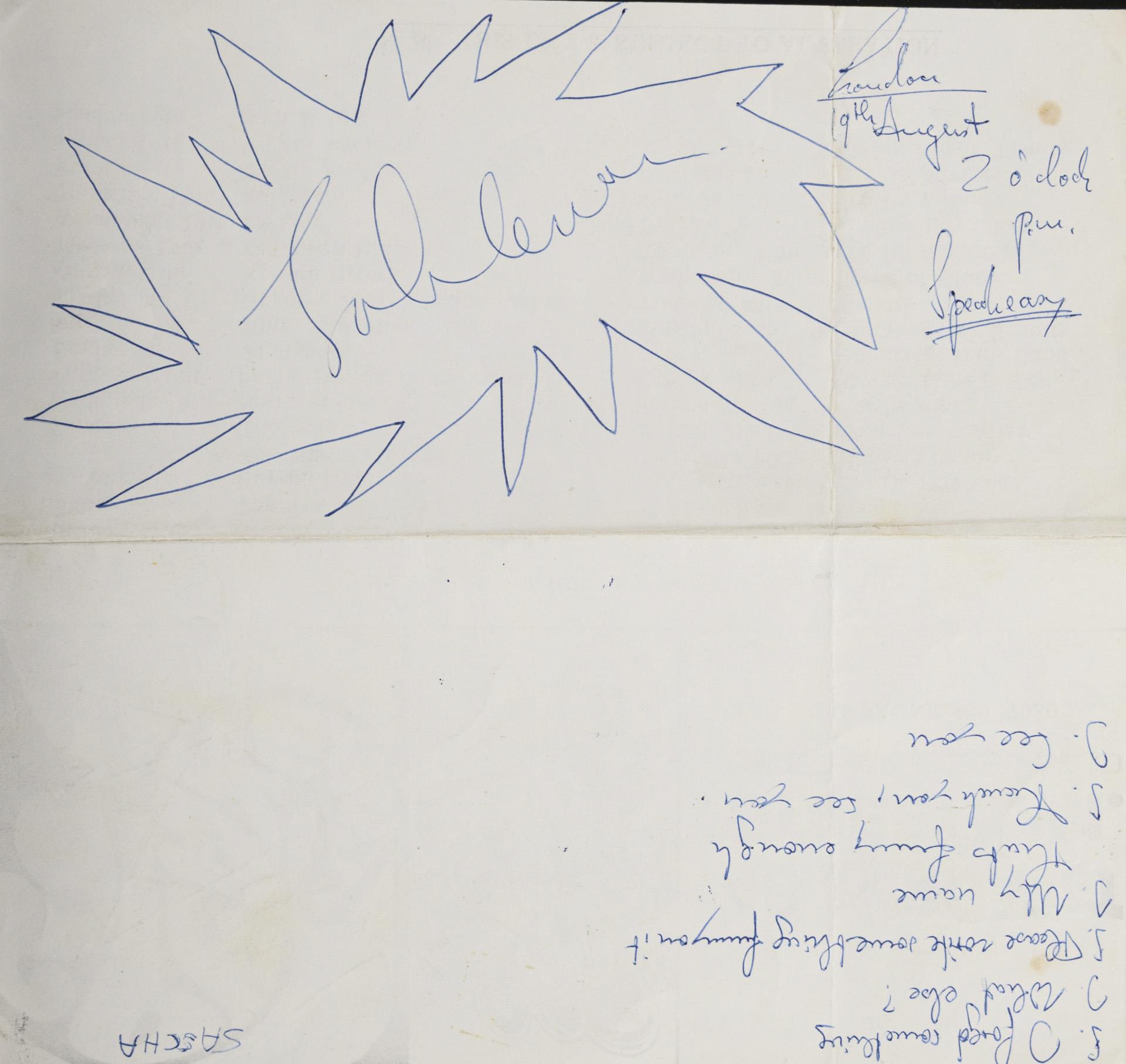 Auf dem gefalteten Programmzettel des legendären Londoner "The Speakeasy Club" vom Juli 1967 steht auf der Rückseite ein kurzer Dialog zwischen Lennon und 'Sascha', sowie das Autogramm mit Datum "London 19th August 2 o clock p.m. Speakeasy".