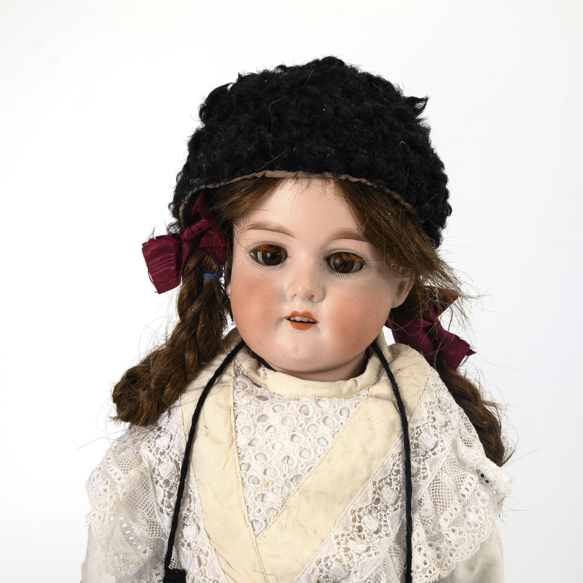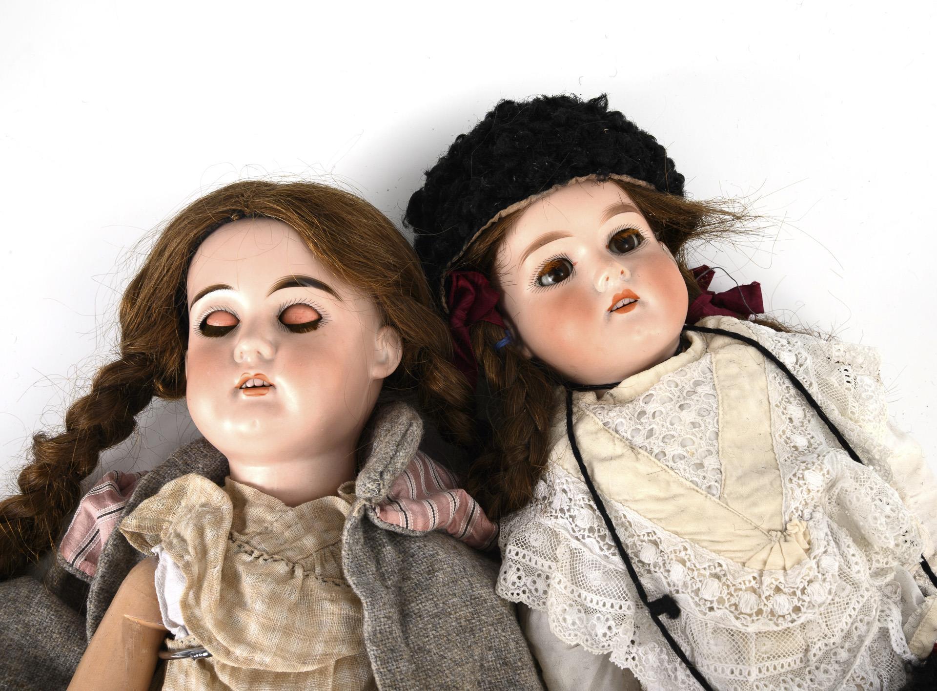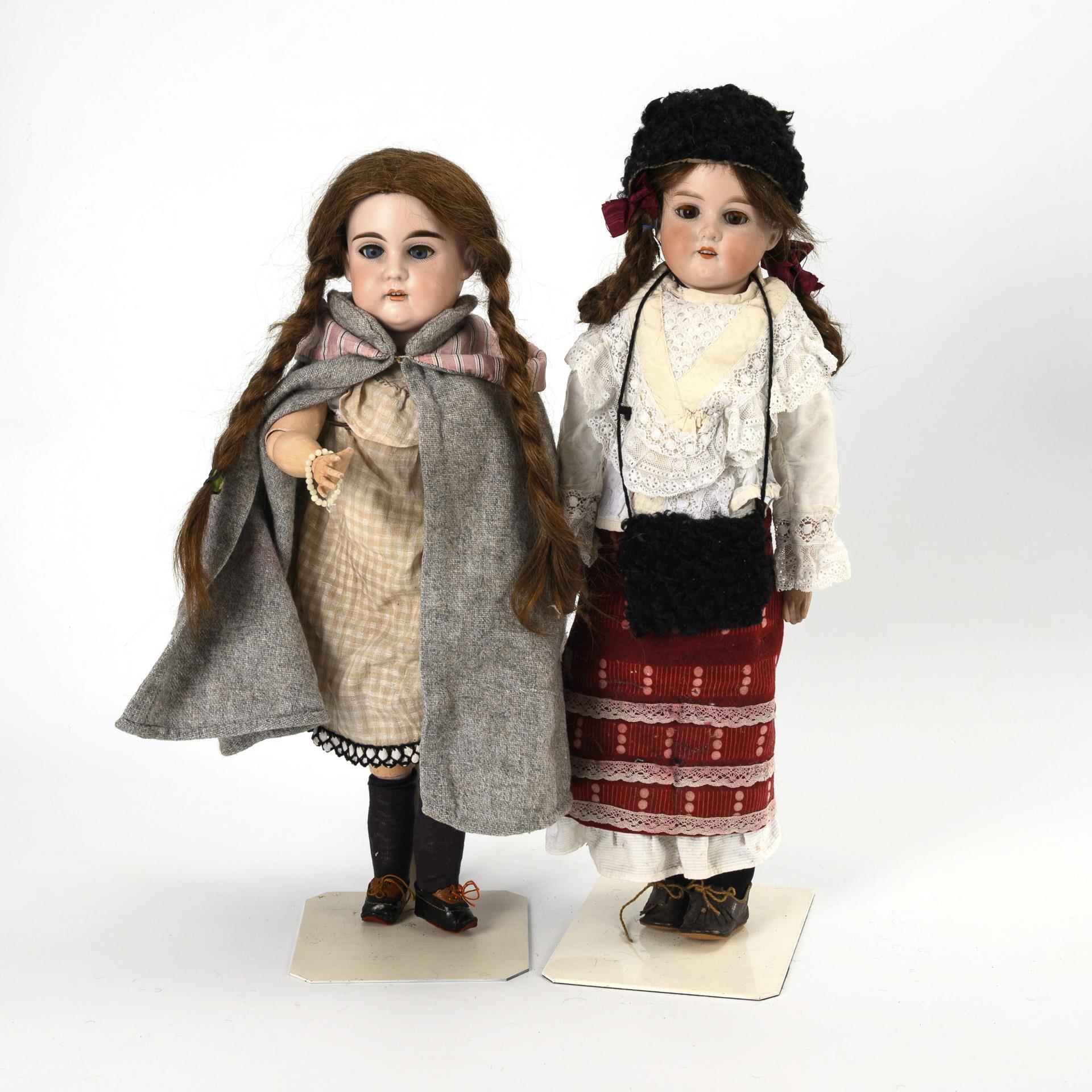 Brustkopfmädchen (AM 370) mit braunen Schlafaugen, Wimpern, Echthaarperücke, Lederkörper, Massegliedern, weißer Bluse und schwarzer Persianermütze mit passendem Muff, L 56 cm. / Puppe mit Kurbelkopf (HW & Co in Raute, AM), blauen Schlafaugen, Echthaarperücke, 15-teiligem Gliederkörper, kariertem Kleid und grauem Cape. 1 Hand ergänzt, L 54 cm. Kurbelkopf durchleuchtet: keine Risse, lediglich kleiner Chip an der Halskurbel. Brustkopf: keine Defekte sichtbar.