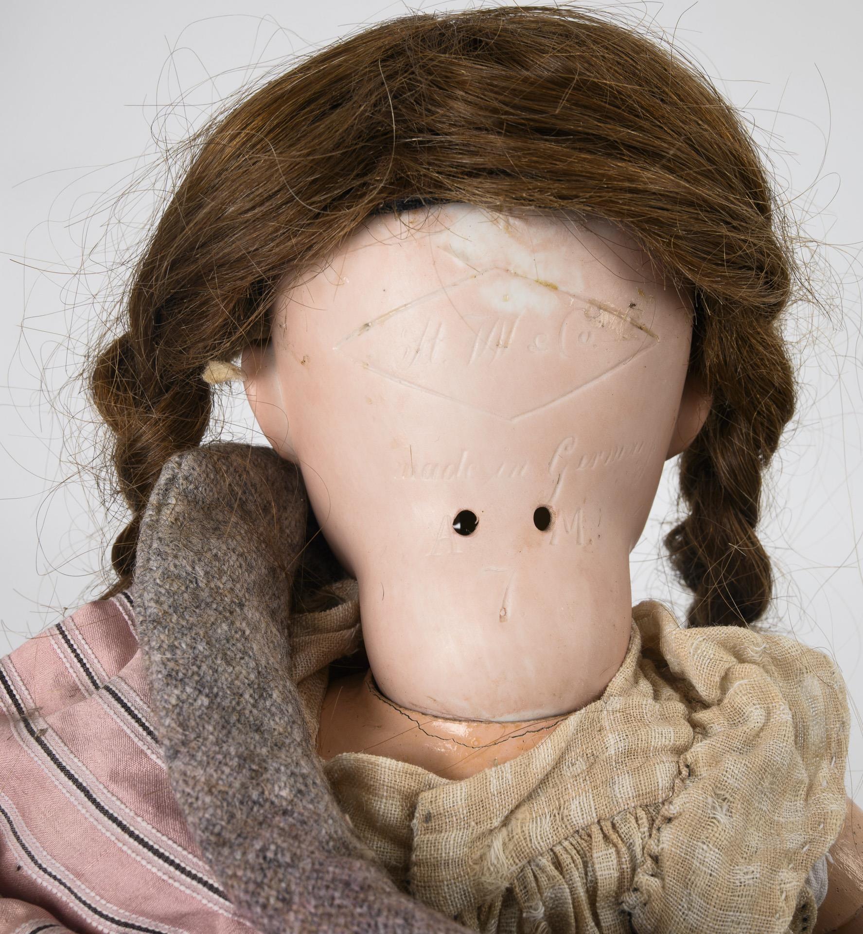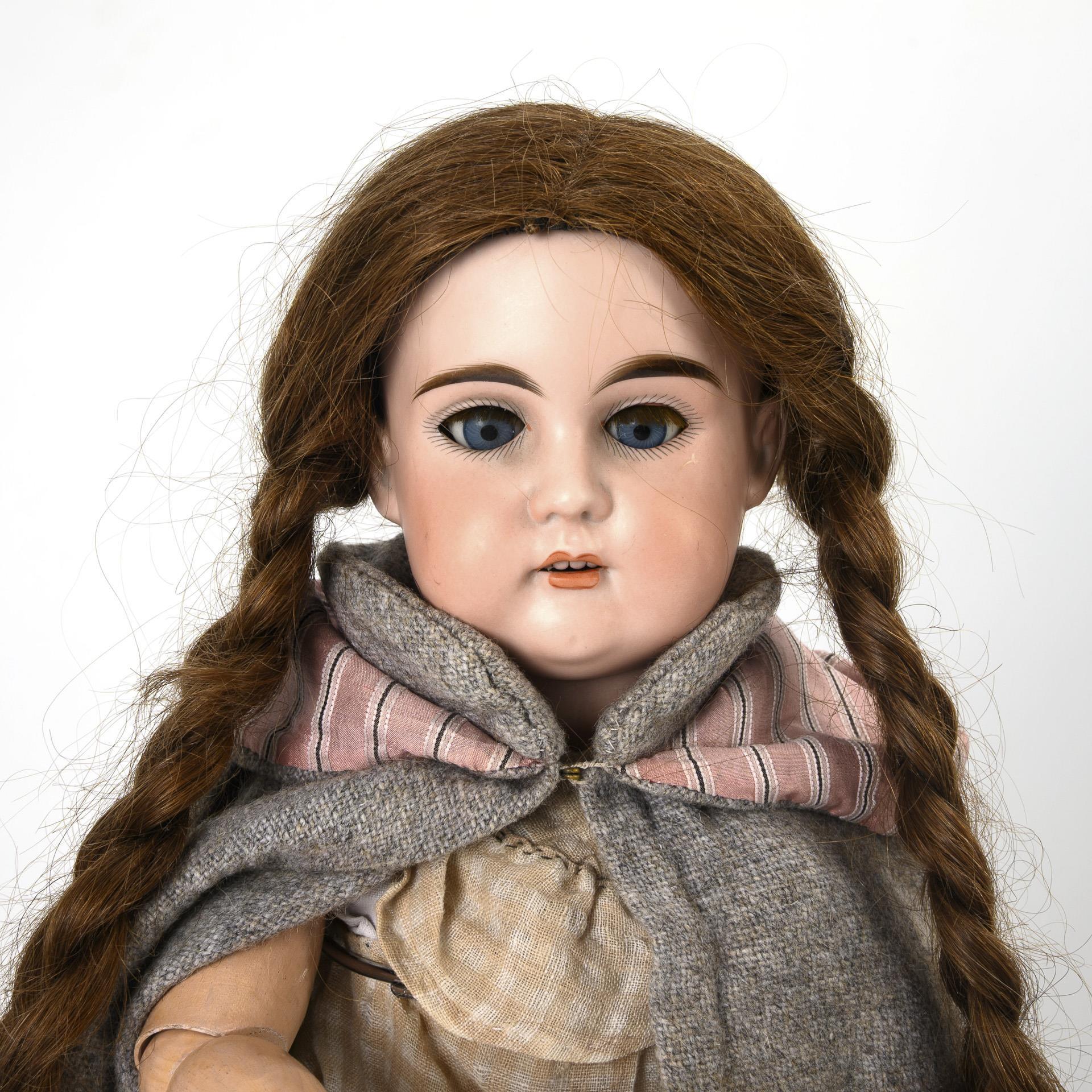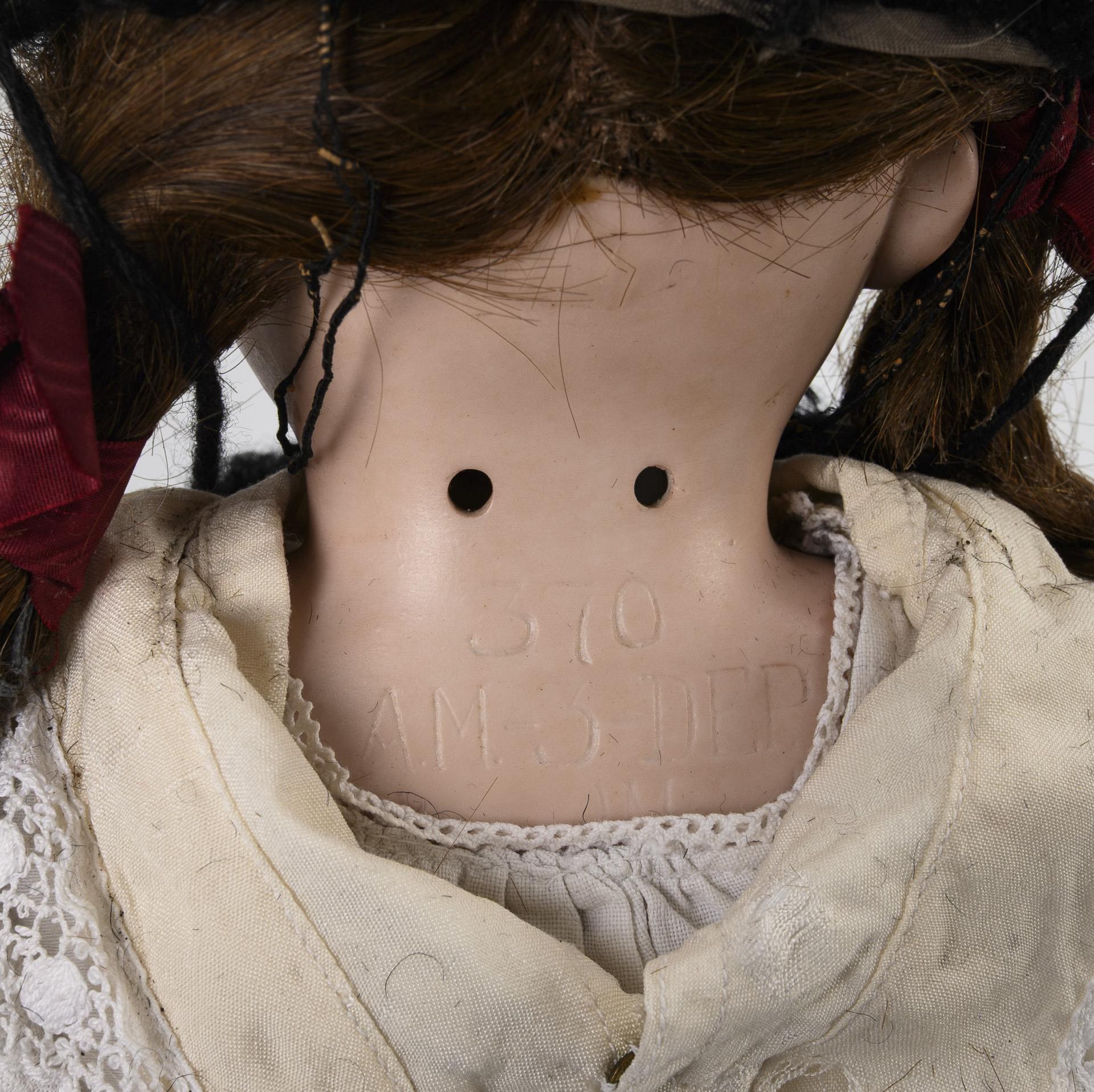 Brustkopfmädchen (AM 370) mit braunen Schlafaugen, Wimpern, Echthaarperücke, Lederkörper, Massegliedern, weißer Bluse und schwarzer Persianermütze mit passendem Muff, L 56 cm. / Puppe mit Kurbelkopf (HW & Co in Raute, AM), blauen Schlafaugen, Echthaarperücke, 15-teiligem Gliederkörper, kariertem Kleid und grauem Cape. 1 Hand ergänzt, L 54 cm. Kurbelkopf durchleuchtet: keine Risse, lediglich kleiner Chip an der Halskurbel. Brustkopf: keine Defekte sichtbar.