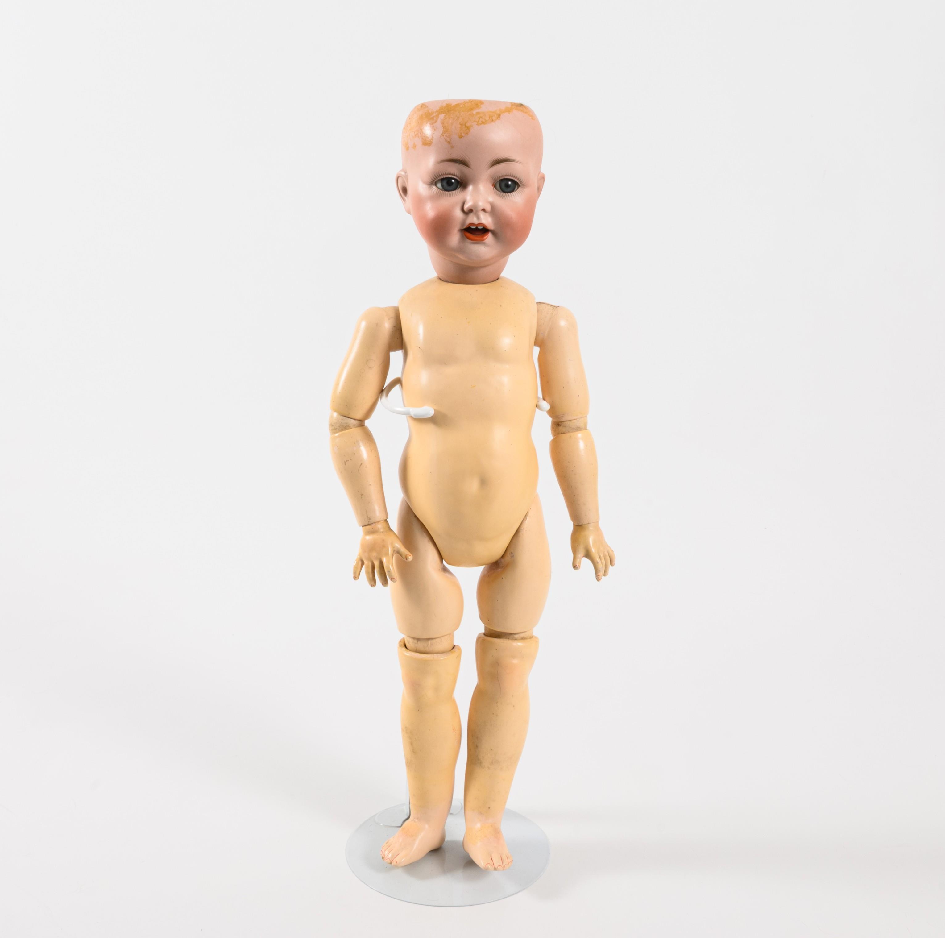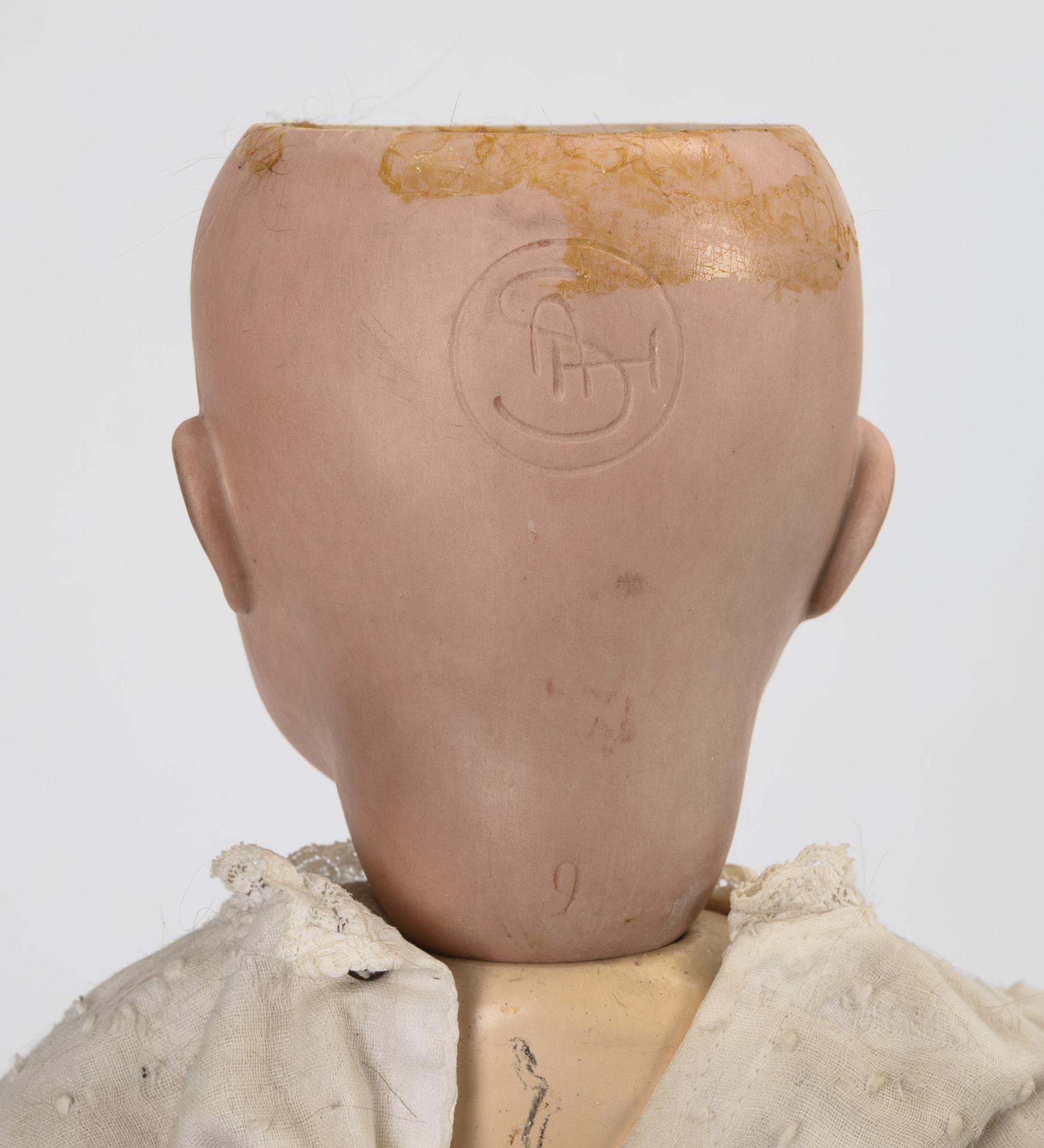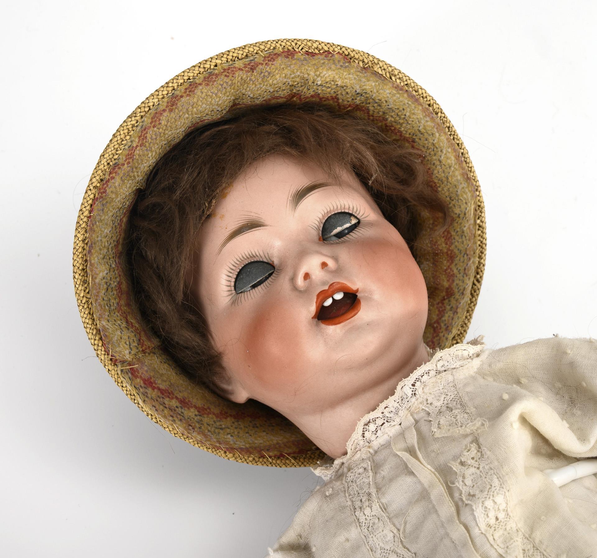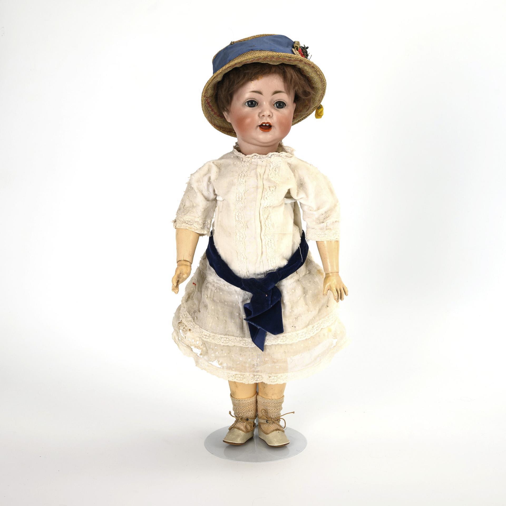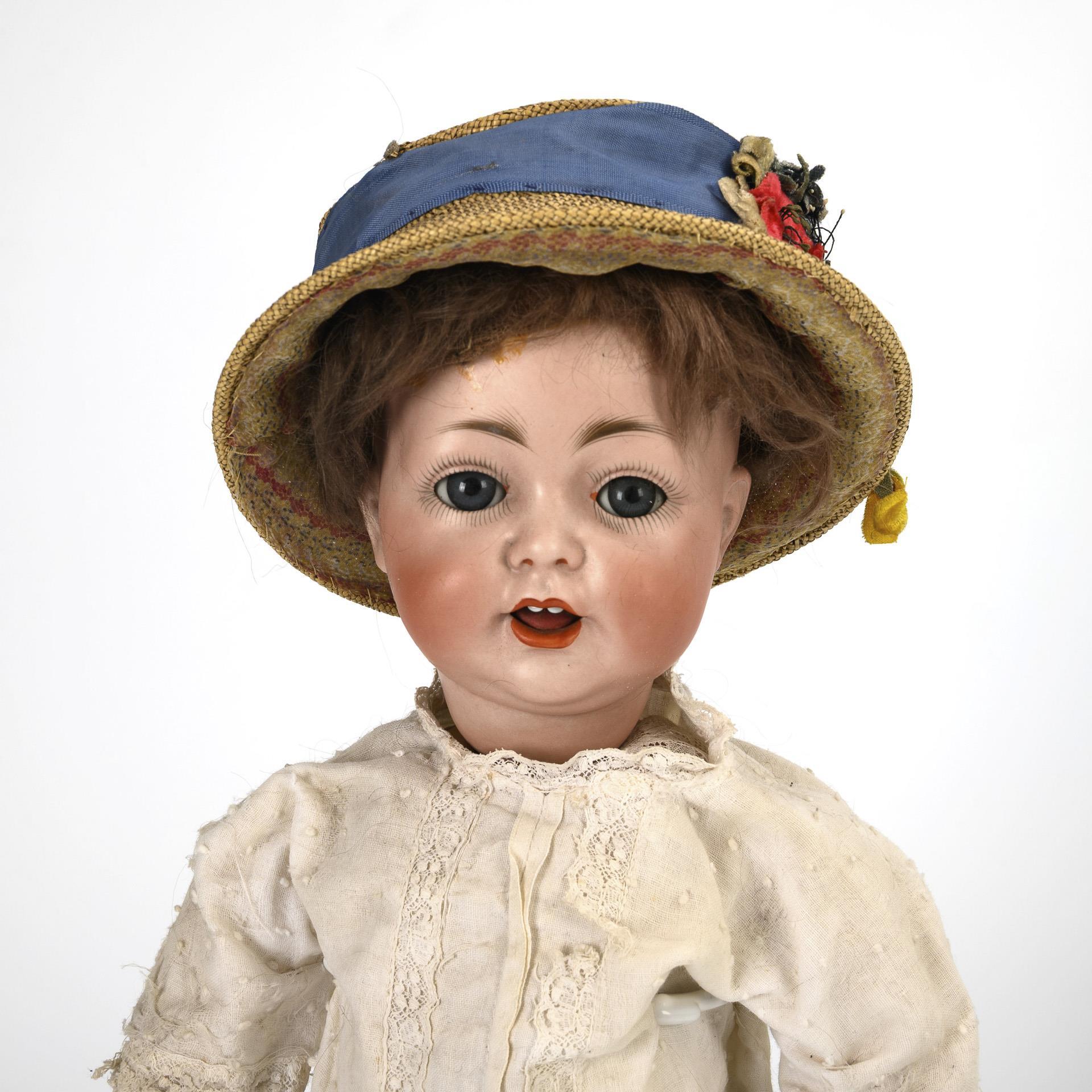 Kurbelkopf, blaue Schlaf-/Schelmenaugen, offener Mund mit Zunge, dunkelblonde Mohairperücke. 15-teiliger Gliederkörper. Altes weißes Kleid, weiße Wachstuchschuhe, Hut mit blauem Band. Kopf durchleuchtet: ohne Defekte.